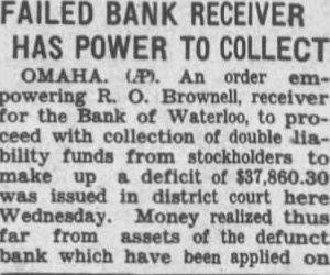 FAILED BANK RECEIVER HAS POWER TO COLLECT OMAHA. (/P). An order empowering R. O. Brownell, receiver for the Bank of Waterloo, to proceed with collection of double liability funds from stockholders to make up deficit of 30 was issued in district court here Wednesday. Money realized thus far from assets of the defunct bank which have been applied on