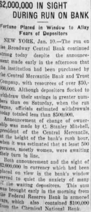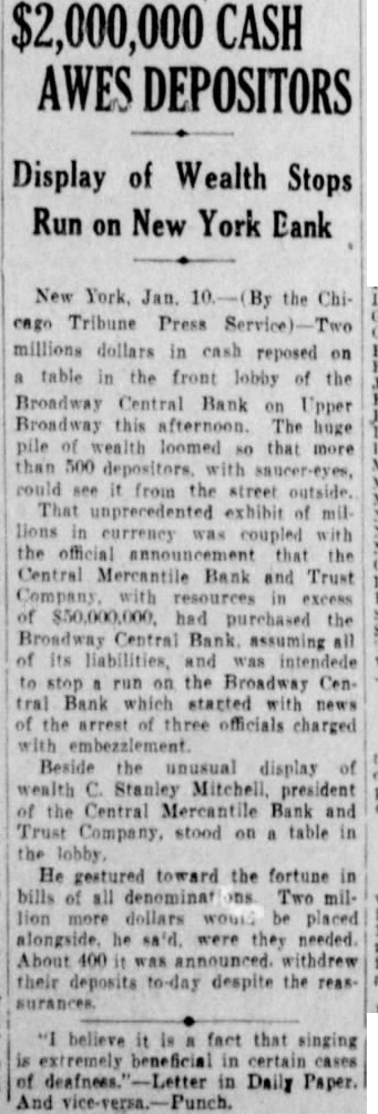 MILLION DOLLAR Officers Declare New York Institution is in Safe Condition NEW YORK, Jan. mil. convince the people of the countrylion dollar run on the Broadway Cen side of the damage do as I've worktral Bank, from whose coffers three ed to recruit them to my forces enemployees are alleged to have em gaged in destroying community probezzled $100,000 lost in stock specu- So said Mail Order Catalog lation ended late this afternoon when read over sucker-list of some the banks closed their doors be- housands of Wayne County farmers cause the clerks were tired. and Goldsboro citizens who have har About 250 persons remnant of the him in and aided carlier crowd of 2,000 shouted dis. his campaign for years. And approval as the doors were locked ontinued: Chas Heydt, told the depositors barning me, not have that the staff was and there killed the idea represent. My kind was no use in paying out more legion. Millions of me scatmoney as the bank solvent. over the country- many healTo meet the emergency caused by by leeches fattening the gullithe run the bank imported $1,000,00* bility and the thoughtlessness of the in cash from other banks. The offi thousands who seek to save penntes dals maintained that the bank has at the expense of community welfare. not been harmed by the So long as your people receive me employees since all losses wer and my kind into their homes and gulled by the pretty things covered by bonds.