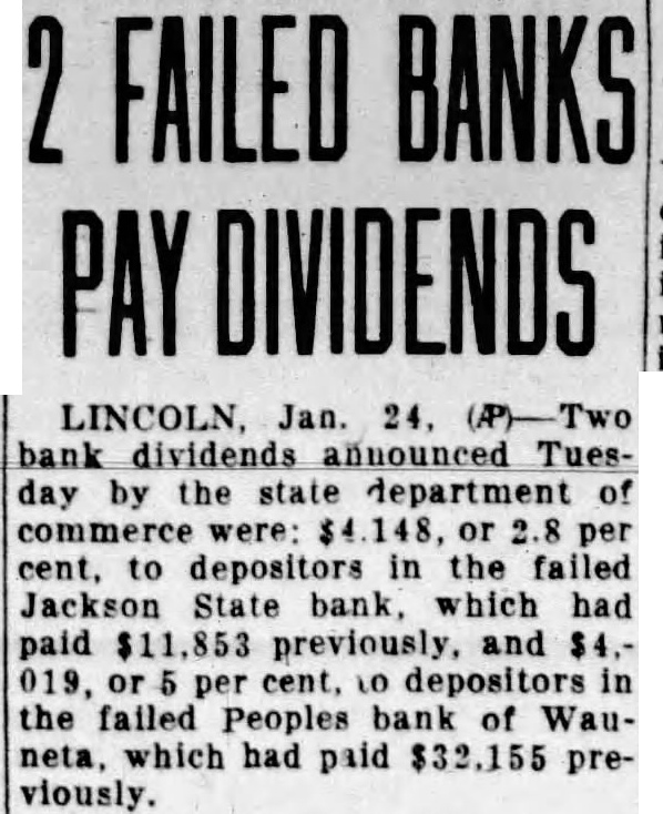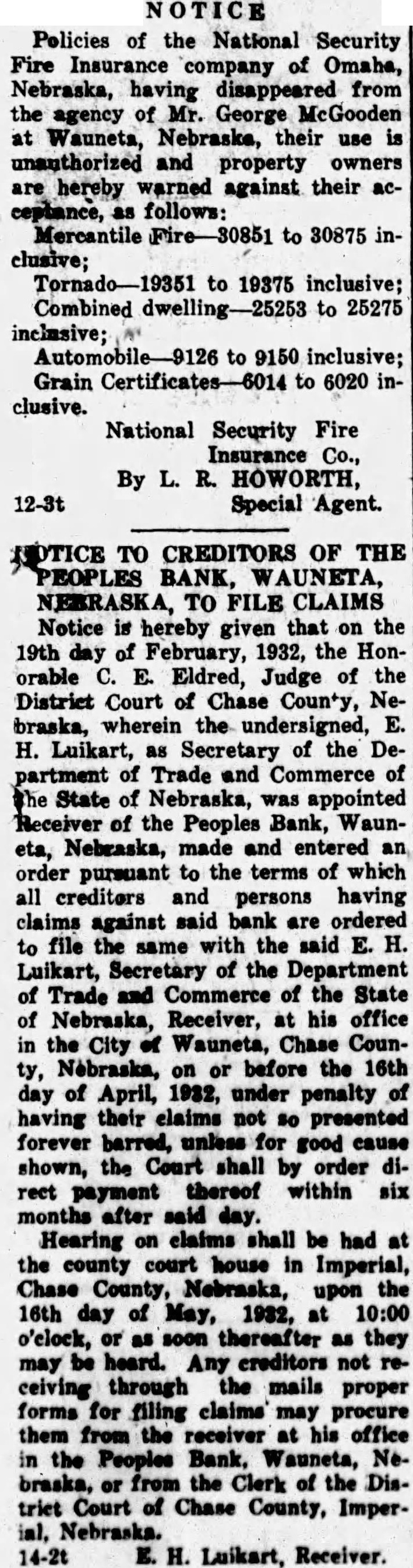 NOTICE Policies of the National Security Fire Insurance company of Omaha, Nebraska, having disappeared from the agency of Mr. George McGooden at Wauneta, Nebraska, their use is unauthorized and property owners are hereby warned against their acceptance, as follows: Mercantile Fire-30851 to 30875 inclusive; Tornado—19351 to 19375 inclusive; Combined dwelling-25253 to 25275 inclusive; Automobile-9126 to 9150 inclusive; Grain Certificates-6014 to 6020 inclusive. 12-3t National Security Fire Insurance By L. R. HOWORTH, Special Agent. NOTICE TO CREDITORS OF THE PEOPLES BANK, WAUNETA, NEBRASKA, TO FILE CLAIMS Notice is hereby given that on the 19th day of February, 1932, the Honorable C. E. Eldred, Judge of the District Court of Chase County, Nebraska, wherein the undersigned, E. H. Luikart, as Secretary of the Department of Trade and Commerce of the State of Nebraska, was appointed Receiver of the Peoples Bank, Wauneta, Nebraska, made and entered an order pursuant to the terms of which all creditors and persons having claims against said bank are ordered to file the same with the said E. H. Luikart, Secretary of the Department of Trade and Commerce of the State of Nebraska, Receiver, at his office in the City of Wauneta, Chase County, Nebraska, on or before the 16th day of April, 1932, under penalty of having their claims not so presented forever barred, unless for good cause shown, the Court shall by order direct payment thereof within six months after said day. Hearing on claims shall be had at the county court house in Imperial, Chase County, Nebraska, upon the 16th day of May, 1982, at 10:00 o'clock, or as soon thereafter as they may be heard. Any creditors not receiving through the mails proper forms for filing claims may procure them from the receiver at his office in the Peoples Bank, Wauneta, Nobraska, or from the Clerk of the Distriet Court of Chase County, Imper14-2t E. H. Luikart, Receiver.