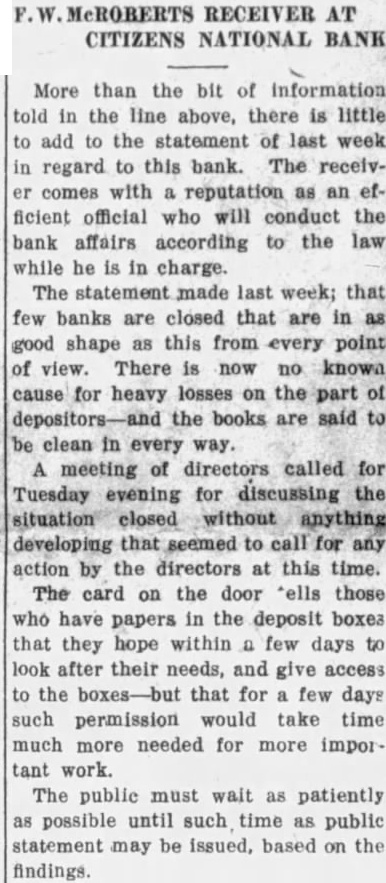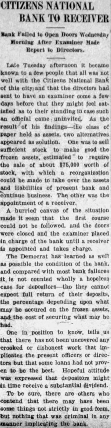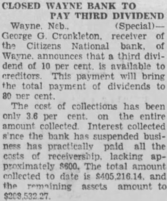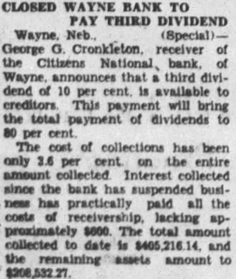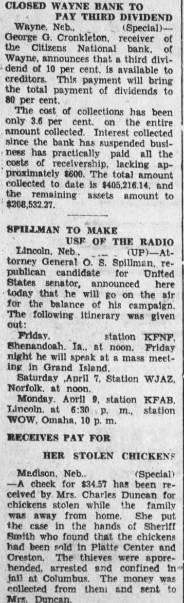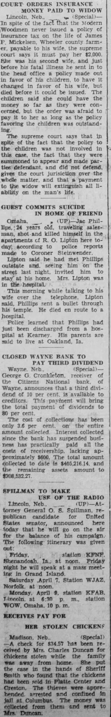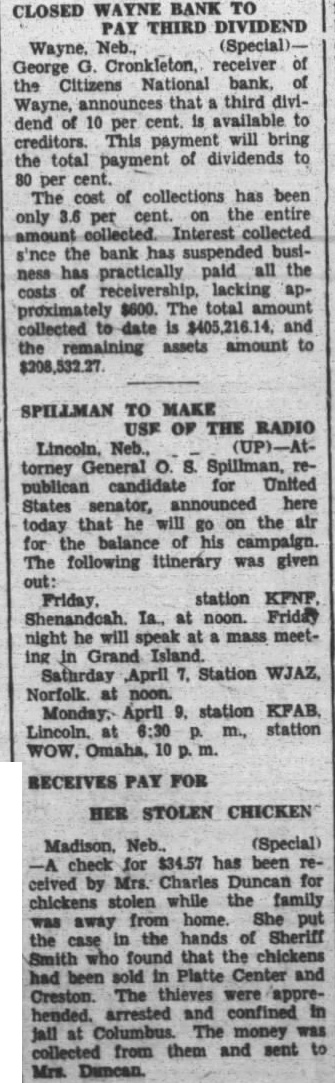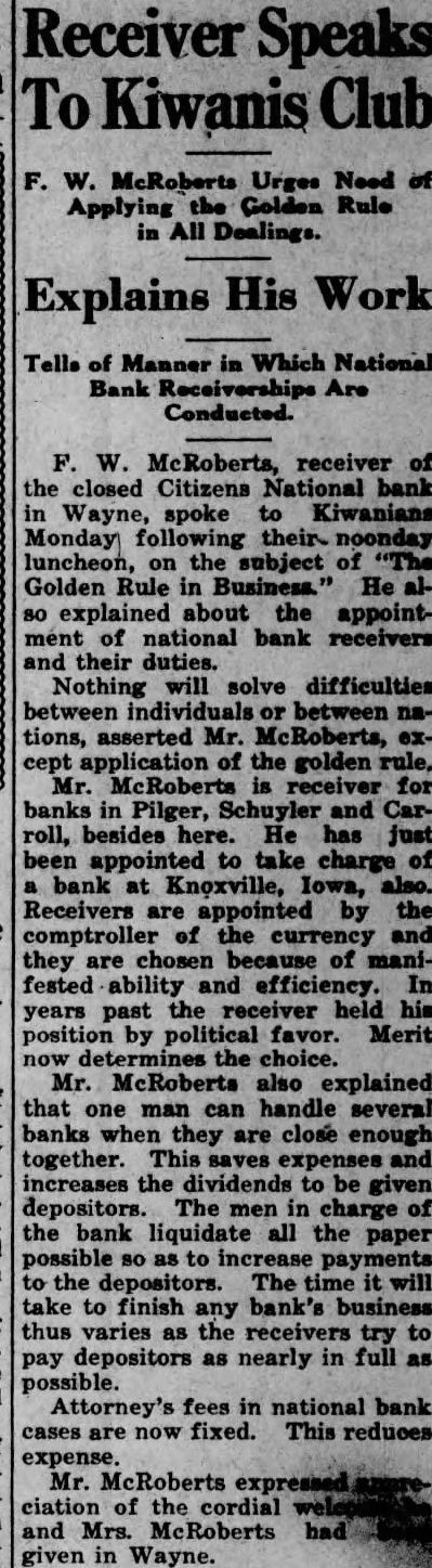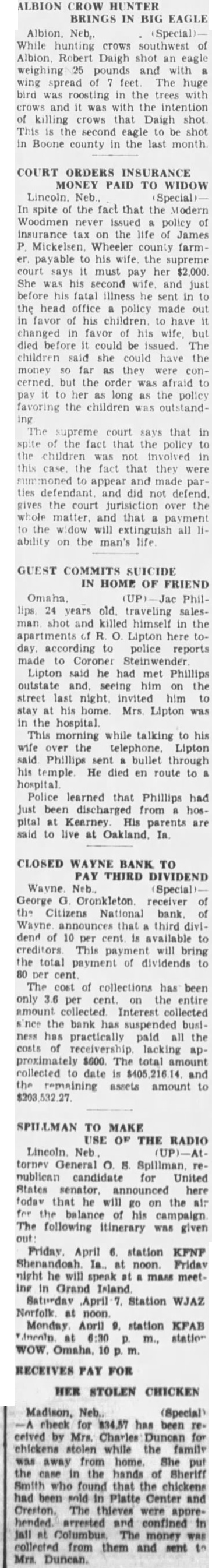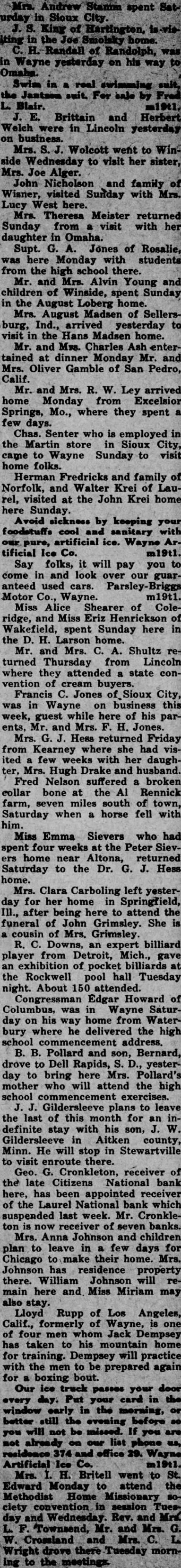 Mrs. Andrew Stanm spent Saturday in Sioux City. J. S. King of Hartington, is-visiting in the Joe Smolsky home. c. H. Randall of Randolph, was in Wayne yesterday on his way to Omaha. Swim in a real swimming suit, the Jantson suit. For sale by L. Blair. J.E. Brittain and Herbert Welch were in Lincoln yesterday on business. Mrs. S.J. Wolcott went to Winside Wednesday to visit her sister, Mrs. Joe Alger. John Nicholson and family of Wisner, visited Sunday with Mrs. Lucy West here. Mrs. Theresa Meister returned Sunday from visit with her daughter in Omaha. Supt. G. A. Jones of Rosalie, was here Monday with students from the high school there. Mr. and Mrs. Alvin Young and children of Winside, spent Sunday in the August Loberg home. Mrs. August Madsen of Sellersburg, Ind., arrived yesterday to visit in the Hans Madsen home. Mr. and Mrs. Charles Ash entertained at dinner Monday Mr. and Mrs. Oliver Gamble of San Pedro, Calif. Mr. and Mrs. R. W. Ley arrived home Monday from Excelsior Springs, Mo., where they spent a few days. Chas. Senter who is employed in the Martin store in Sioux City, came to Wayne Sunday to visit home folks. Herman Fredricks and family of Norfolk, and Walter Krei of Laurel, visited at the John Krei home here Sunday. Avoid sickness by keeping your foodstuffs cool and sanitary with our pure, artificial ice. Wayne Artificial Ice Co. Say folks, it will pay you to come in and look over our guaranteed used cars. Parsley-Briggs Motor Co., Wayne. m19t1. Miss Alice Shearer of Coleridge, and Miss Eriz Henrickson of Wakefield, spent Sunday here in the D. H. Larson home. Mr. and Mrs. C. A. Shultz returned Thursday from Lincoln where they attended a state convention of cream buyers. Francis C. Jones of Sioux City, was in Wayne on business this week, guest while here of his parents, Mr. and Mrs. F. H. Jones. Mrs. G. J. Hess returned Friday from Kearney where she had visited a few weeks with her daughter, Mrs. Hugh Drake and husband. Fred Nelson suffered a broken collar bone at the Al Rennick farm, seven miles south of town, Saturday when a horse fell with him. Miss Emma Sievers who had spent four weeks at the Peter Sievers home near Altona, returned Saturday to the Dr. G. J. Hess home. Mrs. Clara Carboling left yesterday for her home in Springfield, III., after being here to attend the funeral of John Grimsley. She is a cousin of Mrs. Grimsley. R. C. Downs, an expert billiard player from Detroit, Mich., gave an exhibition of pocket billiards at the Rockwell pool hall Tuesday night. About 150 attended. Congressman Edgar Howard of Columbus, was in Wayne Saturday on his way home from Waterbury where he delivered the high school commencement address. B. B. Pollard and son, Bernard, drove to Dell Rapids, S. D., yesterday to bring here Mrs. Pollard's mother who will attend the high school commencement exercises. J. J. Gildersleeve plans to leave the last of this month for an indefinite stay with his son, J. W. Gildersleeve in Aitken county, Minn. He will stop in Stewartville to visit enroute there. Geo. G. Cronkleton, receiver of the late Citizens National bank here, has been appointed receiver of the Laurel National bank which suspended last week. Mr. Cronkleton is now receiver of seven banks. Mrs. Anna Johnson and children plan to leave in a few days for Chicago to make their home. Mrs. Johnson has residence property there. William Johnson will remain here and Miss Miriam may also stay. Lloyd Rupp of Los Angeles, Calif., formerly of Wayne, is one of four men whom Jack Dempsey has taken to his mountain home for training. Dempsey will practice with the men to be prepared again for a boxing bout. Our ice truck passes your door every day. Put your card in the window early in the morning, or better still the evening before so you will not be missed. If you are not already on our list phone us, residence 374 and office 29. Wayne Artificial Ice Co. Mrs. I. H. Britell went to St. Edward Monday to attend the Methodist Home Missionary society convention in session Tuesday and Wednesday. Rev. and Mrs. L. F. Townsend, Mr. and Mrs. G. W. Crossland and Mrs. C. L. Wright drove there Tuesday morning to the meetings.