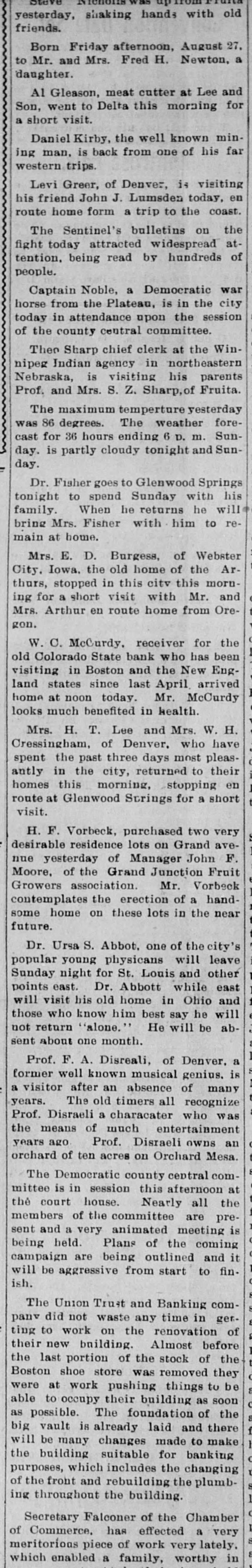 yesterday, shaking hands with old friends. Born Friday afternoon, August 27. to Mr. and Mrs. Fred H. Newton, a daughter. Al Gleason, meat cutter at Lee and Son, went to Delta this morning for a short visit. Daniel Kirby, the well known mining man, is back from one of his far western trips. Levi Greer, of Denver, is visiting his friend John J. Lumsden today, en route home form a trip to the coast. The Sentinel's bulletins on the fight today attracted widespread attention, being read by hundreds of people. Captain Noble, a Democratic war horse from the Plateau, is in the city today in attendance upon the session of the county central committee. Then Sharp chief clerk at the Winnipeg Indian agency in northeastern Nebraska, is visiting his parents Prof. and Mrs. S. Z. Sharp,of Fruita. The maximum temperture yesterday was 86 degrees. The weather forecast for 36 hours ending 6 D. m. Sunday. is partly cloudy tonight and Sunday. Dr. Fisher goes to Glenwood Springs tonight to spend Sunday with his family. When he returns he will bring Mrs. Fisher with him to remain at home. Mrs. E. D. Burgess, of Webster City, Iowa. the old home of the Arthurs, stopped in this citv this morning for a short visit with Mr. and Mrs. Arthur en route home from Oregon. W. C. McCurdy. receiver for the old Colorado State bank who has been visiting in Boston and the New England states since last April arrived I home at noon today. Mr. McCurdy looks much benefited in health. Mrs. H. T. Lee and Mrs. W. H. Cressingham, of Denver. who have spent the past three days most pleasantly in the city, returned to their homes this morning, stopping en route at Glenwood Strings for a short visit. H. F. Vorbeck, purchased two very desirable residence lots on Grand avenue yesterday of Manager John F. Moore, of the Grand Junction Fruit Growers association. Mr. Vorbeck contemplates the erection of a handsome home on these lots in the near future. Dr. Ursa S. Abbot. one of the city's popular young physicans will leave Sunday night for St. Louis and other 1 points east. Dr. Abbott while east will visit his old home in Ohio and 1 those who know him best say he will not return "alone." He will be absent about one month. I Prof. F. A. Disreali, of Denver, a former well known musical genius. is a visitor after an absence of many years. The old timers all recognize Prof. Disraeli a characater who was the means of much entertainment years ago Prof. Disraeli owns an orchard of ten acres on Orchard Mesa. The Democratic county central committee is in session this afternoon at the court house. Nearly all the members of the committee are present and a very animated meeting is being held. Plans of the coming campaign are being outlined and it 1 will be aggressive from start to finish. S The Union Trust and Banking comin panv did not waste any time in get.
