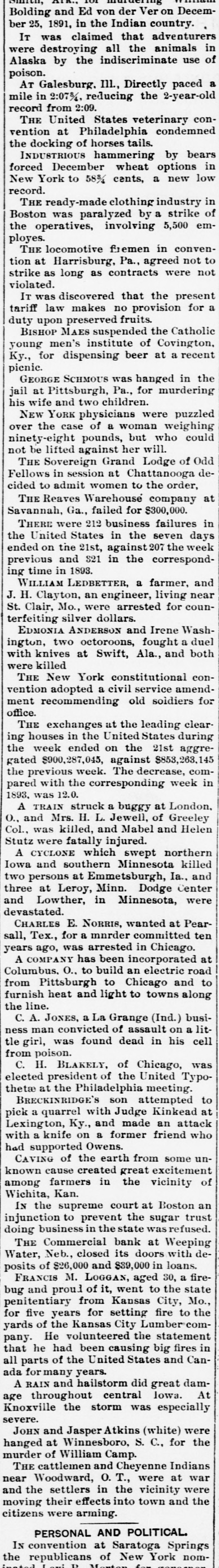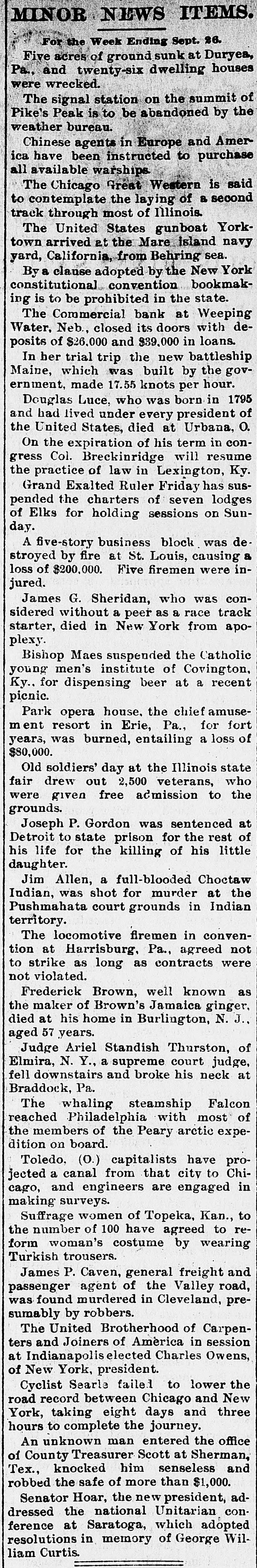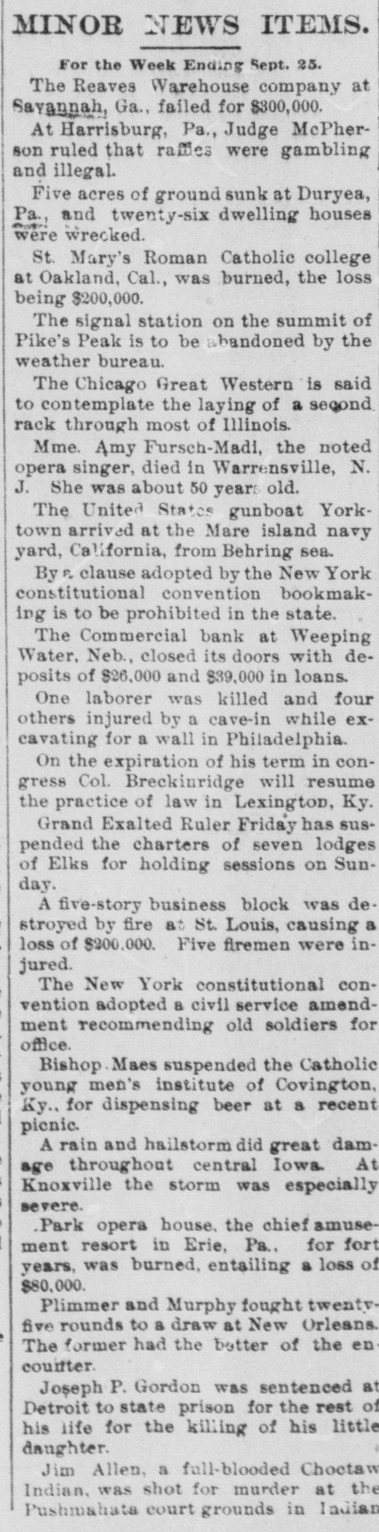 MINOR NEWS ITEMS. For the Week Ending Sept. 25. The Reaves Warehouse company at Sayannah, Ga., failed for $800,000. At Harrisburg, Pa., Judge McPherson ruled that raffies were gambling and illegal. Five acres of ground sunk at Duryea, Pa., and twenty-six dwelling houses on were wrecked. St. Mary's Roman Catholic college at Oakland, Cal., was burned, the loss being $200,000. The signal station on the summit of Pike's Peak is to be abandoned by the weather bureau. The Chicago Great Western is said to contemplate the laying of a second rack through most of Illinois. Mme. Amy Fursch-Madi, the noted opera singer, died in Warrensville, N. J. She was about 50 years old. The United States gunboat Yorktown arrived at the Mare island navy yard, California, from Behring sea. By FL clause adopted by the New York constitutional convention bookmaking is to be prohibited in the state. The Commercial bank at Weeping Water, Neb., closed its doors with deposits of $26,000 and $39,000 in loans. One laborer was killed and four others injured by a cave-in while excavating for a wall in Philadelphia. On the expiration of his term in congress Col. Breckinridge will resume the practice of law in Lexington, Ky. Grand Exalted Ruler Friday has suspended the charters of seven lodges of Elks for holding sessions on Sunday. A five-story business block was destroyed by fire at St. Louis, causing a loss of $200.000. Five firemen were injured. The New York constitutional convention adopted a civil service amendment recommending old soldiers for office. Bishop Maes suspended the Catholic young men's institute of Covington, Ky., for dispensing beer at 8 recent pienic. A rain and hailstorm did great damage throughout central Iowa. At Knoxville the storm was especially severe. .Park opera house. the chief amusement resort in Erie, Pa., for fort years, was burned, entailing a loss of $80,000. Plimmer and Murphy fought twentyfive rounds to a draw at New Orleans. The former had the better of the en couitter. Joseph P. Gordon was sentenced at Detroit to state prison for the rest of his life for the killing of his little daughter. Jim Allen, a full-blooded Choctaw Indian. was shot for murder at the Pushmahata court grounds in Indian