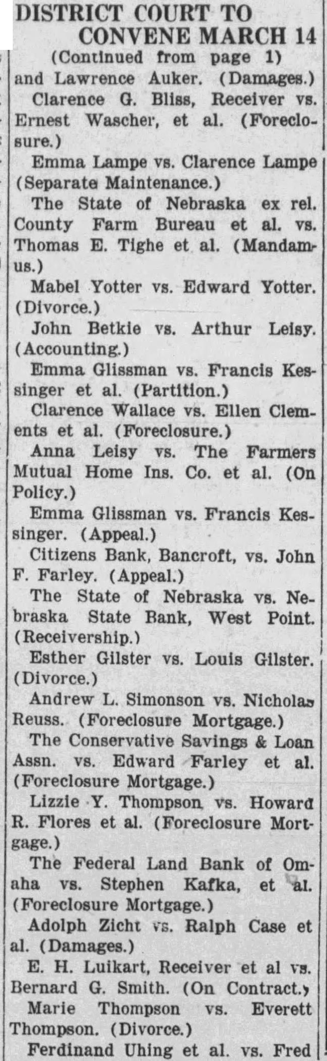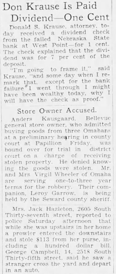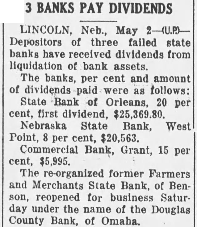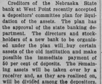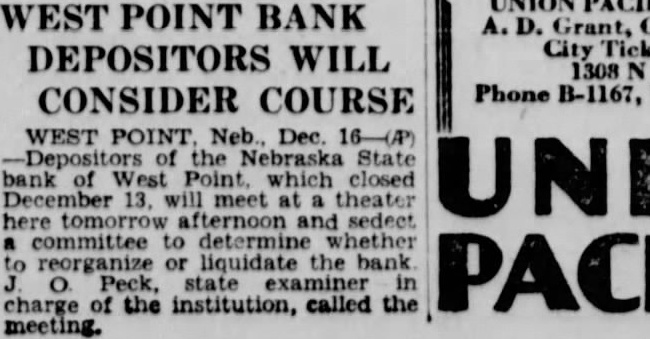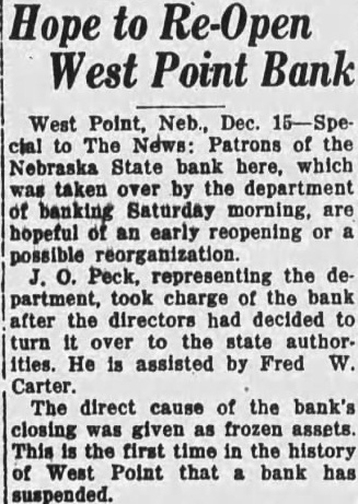 Merle N. Poster, chief examiner of partment of trade and commerce, announced the closing of the Nebraska State bank at West Point At the time of closing. Foster sald. the bank carried deposits of about $300,000 surplus for $20,000. and capital of $30,000. H. Koch was president F. D. Hunker, vice-president. and W T. Knievel, cashier Examiner J. O. Peck was placed In charge.