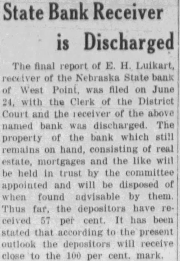 is Discharged The final report Luikart, of the Nebraska State West Point, was filed on June 24, with the Clerk of the District Court and the receiver of the above named bank discharged. The the bank which still property remains hand, consisting real estate, and the like will held trust by the committee appointed and will be disposed when found advisable by them Thus far, the depositors have ceived 57 cent. has been stated that according to the present outlook the depositors will receive close to the 100 per cent. mark.
