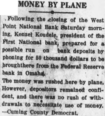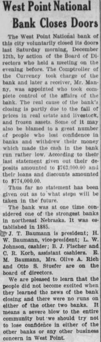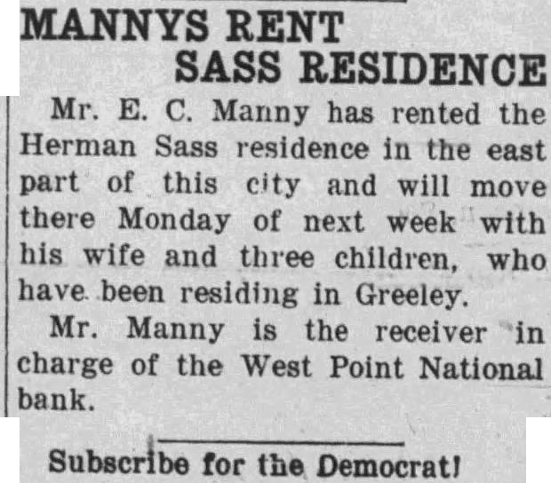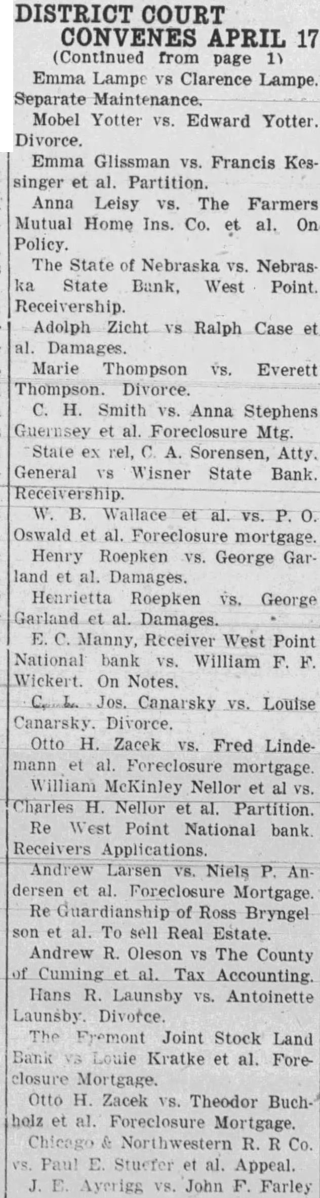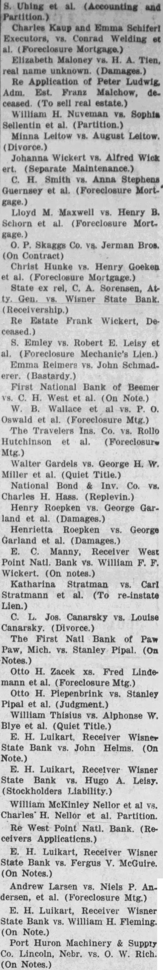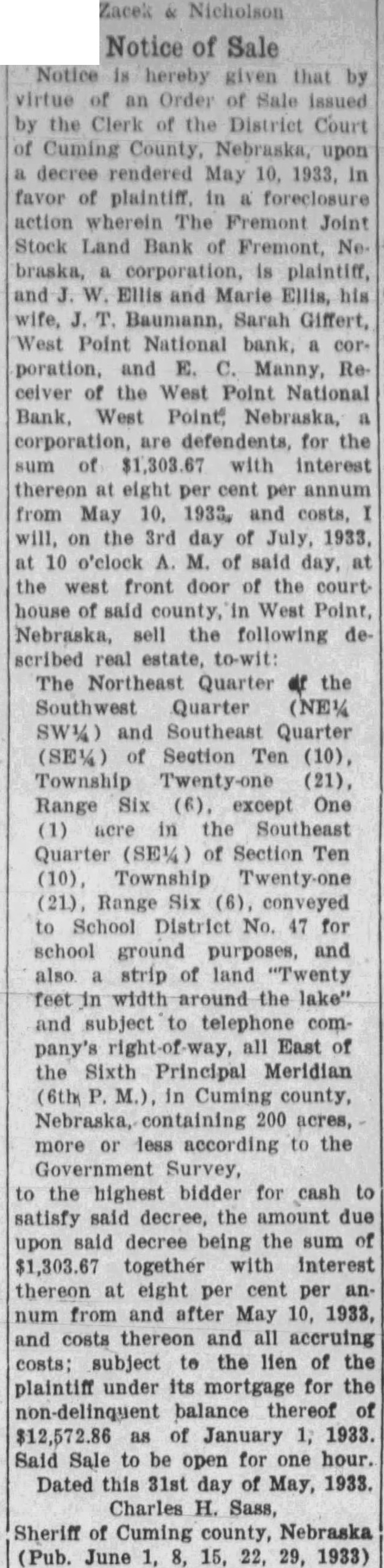 Notice is hereby given that by virtue of an Order of Sale issued by the Clerk of the District Court of Cuming County, Nebraska, upon decree rendered May 10, 1933, In favor of plaintiff, in foreclosure action wherein The Fremont Joint Stock Land Bank of Fremont, No braska, corporation, is plaintiff, and Ellis and Marie Ellis, his wife, Baumann, Sarah Giffert, West Point National bank, corand E. C. Manny, Receiver of the West Point National Bank, West Point Nebraska, corporation, are defendents, for the sum of $1,303.67 with interest thereon at eight per cent per annum from May and costs, will, on the 3rd day of July, 1933, at 10 o'clock A. M. of said day, at the west front door of the courthouse of said county, in West Point, Nebraska, sell the following described real estate, to-wit: The Northeast Quarter the Southwest Quarter (NE% SW%) and Southeast Quarter (SE%) of Section Ten (10), Township Twenty-one (21), Range Six (6), except One (1) acre in the Southeast Quarter (SE%) of Section Ten (10), Township Twenty-one (21), Range Six (6), conveyed to School District No. 47 for school ground purposes, and also strip of land "Twenty width around the lake" and subject to telephone company's all East of the Sixth Principal Meridian (6th M.), in Cuming county, Nebraska, containing 200 acres, more or less according to the Government Survey, to the highest bidder for cash to satisfy said decree, the amount due upon said decree being the sum of $1,303.67 together with interest thereon at eight per cent per annum from and after May 10, 1933, and costs thereon and all accruing costs; subject to the lien of the plaintiff under its mortgage for the non-delinquent balance thereof of $12,572.86 as of January 1, 1933. Said Sale to be open for one hour. Dated this 31st day of May, 1933. Charles H. Sass, Sheriff of Cuming county, Nebraska (Pub. June 1, 8, 15, 22, 29, 1933)