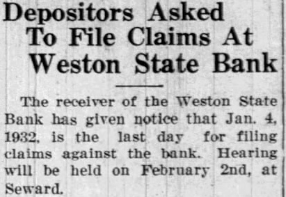 Depositors Asked To File Claims At Weston State Bank The receiver of the Weston State Bank has given notice that 1932. the last day for filing claims the bank. Hearing will held on February 2nd, Seward.
