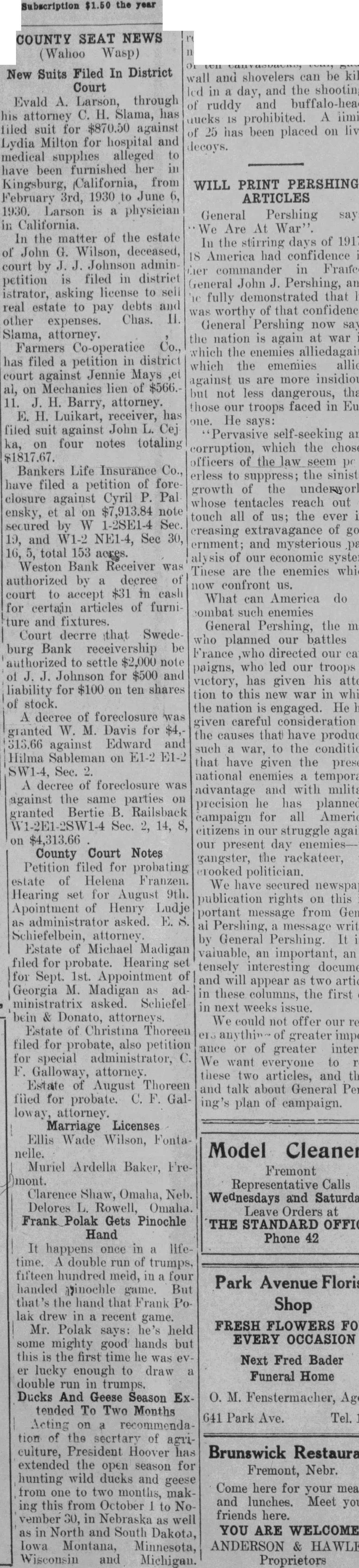 Subscription $1.50 the year COUNTY SEAT NEWS (Wahoo Wasp) New Suits Filed In District Court Evald A. Larson, through his attorney C. H. Slama, has filed suit for $870.50 against Lydia Milton for hospital and medical supplies alleged to have been furnished her in Kingsburg, (California, from February 3rd, 1930 to June 6, 1930. Larson is a physician in California. In the matter of the estate of John G. Wilson, deceased, court by J. J. Johnson adminpetition is filed in district istrator, asking license to sell real estate to pay debts and other expenses. Chas. 11. Slama, attorney. Farmers Co-operatice Co., has filed a petition in district court against Jennie Mays ,et al, on Mechanics lien of $566.11. J. H. Barry, attorney. E. H. Luikart, receiver, has filed suit against John L. Cej ka, on four notes totaling $1817.67. Bankers Life Insurance Co., have filed a petition of foreclosure against Cyril P. Pal ensky, et al on $7,913.84 note secured by W 1-2SE1-4 Sec. 19, and W1-2 NE1-4, Sec 30, 16, 5, total 153 acres. Weston Bank Receiver was authorized by a decree of court to accept $31 in cash for certain articles of furniture and fixtures. Court decrre that Swedeburg Bank receivership be authorized to settle $2,000 note of J. J. Johnson for $500 and liability for $100 on ten shares of stock. A decree of foreclosure was granted W. M. Davis for $4,313.66 against Edward and Hilma Sableman on E1-2 E1-2 SW1-4, Sec. 2. A decree of foreclosure was against the same parties on granted Bertie B. Railsback W1-2E1-2SW1-4 Sec. 2, 14, 8, on $4,313.66 County Court Notes Petition filed for probating estate of Helena Franzen. Hearing set for August 9th. Apointment of Henry Ludje as administrator asked. E. S. Schiefelbein, attorney. Estate of Michael Madigan filed for probate. Hearing set for Sept. 1st. Appointment of Georgia M. Madigan as administratrix asked. Schiefel bein & Donato, attorneys. Estate of Christina Thoreen filed for probate, also petition for special administrator, C. F. Galloway, attorney. Estate of August Thoreen filed for probate. C. F. Galloway, attorney. Marriage Licenses Ellis Wade Wilson, Fontanelle. Muriel Ardella Baker, Fremont. Clarence Shaw, Omaha, Neb. Delores L. Rowell, Omaha. Frank Polak Gets Pinochle Hand It happens once in a lifetime. A double run of trumps, fifteen hundred meld, in a four Park Avenue Florist handed pinochle game. But that's the hand that Frank PoShop lak drew in a recent game. FRESH FLOWERS FOR Mr. Polak says: he's held EVERY OCCASION some mighty good hands but this is the first time he was evNext Fred Bader er lucky enough to draw a Funeral Home double run in trumps. Ducks And Geese Season Ex- O. M. Fenstermacher, Agent tended To Two Months 641 Park Ave. Acting on a recommendation of the secrtary of agriculture, President Hoover has Brunswick Restaurant extended the open season for Fremont, Nebr. hunting wild ducks and geese Come here for your meals from one to two months, makand lunches. Meet your ing this from October 1 to Nofriends here. vember 30, in Nebraska as well YOU ARE WELCOME as in North and South Dakota, Iowa Montana, Minnesota, ANDERSON & HAWLEY, Wisconsin and Michigan. Proprietors