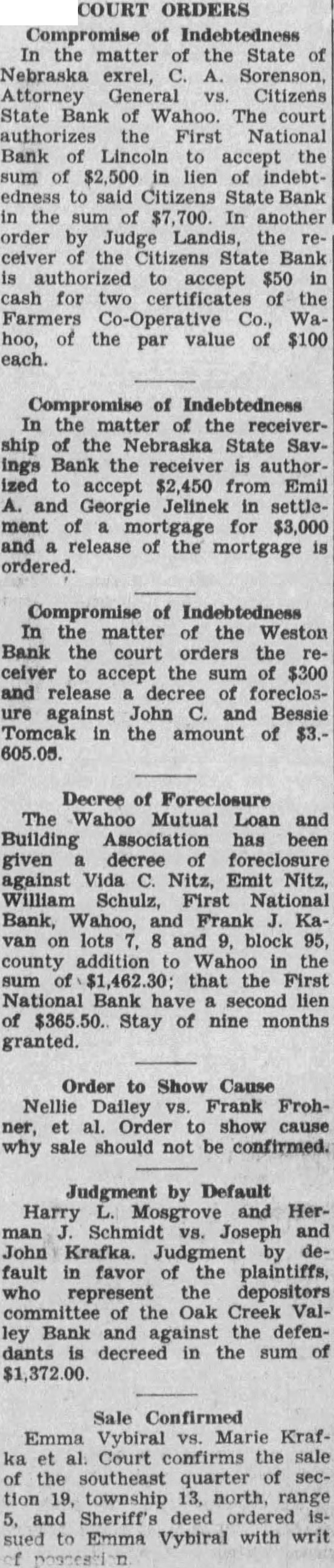COURT ORDERS Compromise of Indebtedness matter of the State Nebraska exrel, Sorenson, Attorney Citizens State of The court authorizes First National Bank Lincoln accept the $2,500 of indebtedness said Citizens State Bank the another order Judge Landis, receiver the State Bank authorized accept $50 certificates of the Farmers Wathe par value of $100 Compromise of Indebtedness matter receivership Nebraska State SavBank the receiver is authorized accept from Emil and Georgie Jelinek in settlement mortgage for $3,000 and release of the mortgage ordered. Compromise of Indebtedness matter Weston Bank the court orders the ceiver accept the sum $300 and release foreclosagainst John Bessie Tomcak in the amount Decree of Foreclosure The Wahoo Mutual Loan Building Association been given decree foreclosure against Nitz, Emit William Schulz, First Bank, Wahoo, and Frank on lots county addition the First National Bank lien Stay of nine months granted. Order Show Cause Nellie Dailey Frank FrohOrder show cause why sale should not be confirmed. Judgment by Default Harry HerJoseph and fault favor of plaintiffs, who the depositors the Oak Creek Bank and the defendecreed in the of Sale Confirmed Emma Vybiral Marie KrafCourt the sale the southeast quarter tion township north, range and Sheriff's Emma Vybiral writ