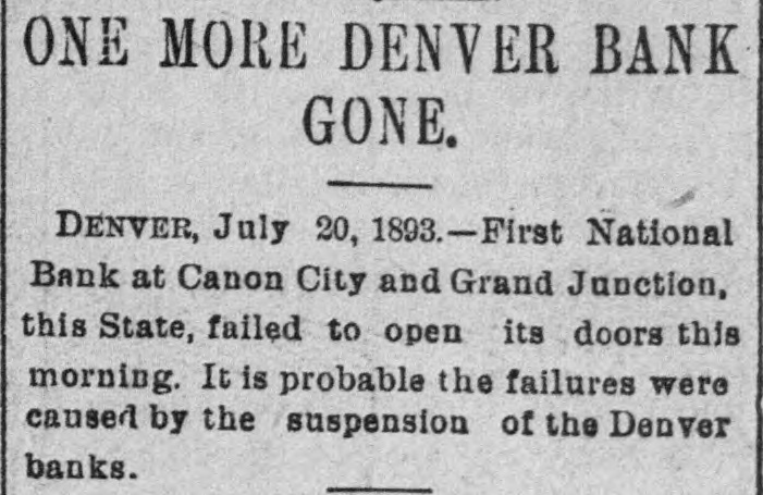 ONE MORE DENVER BANK GONE. DENVER, July 20, 1893.-First National Bank at Canon City and Grand Junction, this State, failed to open its doors this morning. It is probable the failures were caused by the suspension of the Denver banks.