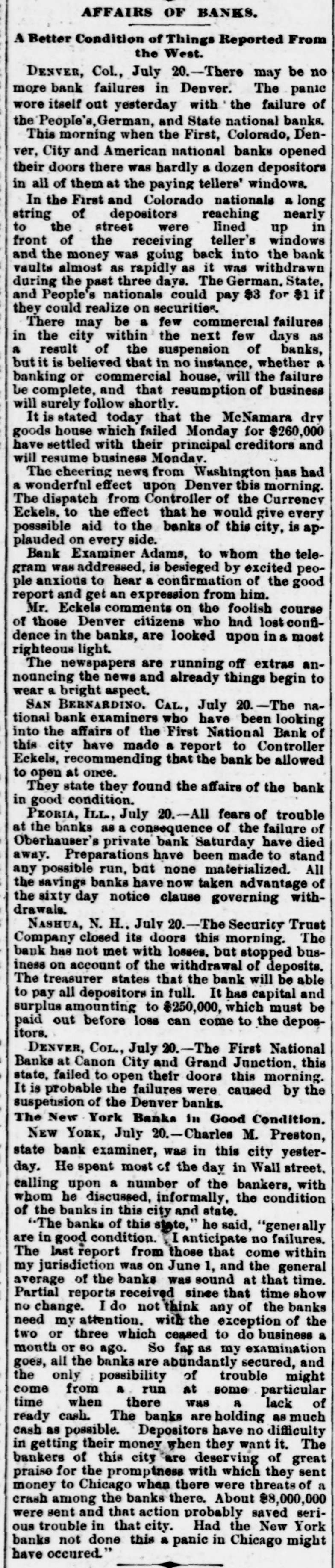 AFFAIRS OF BANKS. A Better Condition of Things Reported From the West. DENVER, Col., July 20.-There may be no more bank failures in Denver. The panic wore itself out yesterday with the failure of the People's, German, and State national banks. This morning when the First, Colorado, Denver, City and American national banks opened their doors there was hardly a dozen depositors in all of them at the paying tellers' windows. In the First and Colorado nationals a long string of depositors reaching nearly to the street were lined up in front of the receiving teller's windows and the money was going back into the bank vaults almost as rapidly as it was withdrawn during the past three days. The German. State, and People's nationals could pay $3 for $1 if they could realize on securities. There may be a few commercial failures in the city within the next few days as a result of the suspension of banks, but it is believed that in no instance, whether a banking or commercial house, will the failure be complete, and that resumption of business will surely follow shortly. It is stated today that the McNamara drv goods house which failed Monday for $260,000 have settled with their principal creditors and will resume business Mondav. The cheering news from Washington has had a wonderful effect upon Denver this morning. The dispatch from Controller of the Currency Eckels. to the effect that he would give every posssible aid to the banks of this city, is applauded on every side. Bank Examiner Adams, to whom the telegram was addressed, is besieged by excited people anxious to hear a confirmation of the good report and get an expression from him. Mr. Eckels comments on the foolish course of those Denver citizens who had lost confidence in the banks, are looked upon in a most righteous light. The newspapers are running off extras announcing the news and already things begin to wear a bright aspect. SAN BERNARDINO. CAL., July 20.-The national bank examiners who have been looking into the affairs of the First National Bank of this city have made a report to Controller Eckels, recommending that the bank be allowed to open at once. They state they found the affairs of the bank in good condition. PEORIA, ILL, July 20.-All fears of trouble at the banks as a consequence of the failure of Oberhauser's private bank Saturday have died away. Preparations have been made to stand any possible run, but none materialized. All the savings banks have now taken advantage of the sixty day notice clause governing withdrawals. Nashua, N. H., July 20.-The Security Trust Company closed its doors this morning. The bank has not met with losses. but stopped business on account of the withdrawal of deposits. The treasurer states that the bank will be able to pay all depositors in full. It has capital and surplus amounting to $250,000, which must be paid out before loss can come to the depositors. DENVER, CoL., July 20.-The First National Banks at Canon City and Grand Junction, this state, failed to open their doors this morning. It is probable the failures were caused by the suspension of the Denver banks. The New York Banks in Good Condition. NEW YORK, July 20.-Charles M. Preston, state bank examiner, was in this city yesterday. He spent most of the day in Wall street. calling upon a number of the bankers, with whom he discussed, informally, the condition of the banks in this city and state. "The banks of this state," he said, "generally are in good condition. anticipate no failures. The last report from those that come within my jurisdiction was on June 1, and the general average of the banks was sound at that time. Partial reports received since that time show no change. I do not think any of the banks need my attention. with the exception of the two or three which ceased to do business a month or 80 ago. So far as my examination goes, all the banks are abundantly secured, and the only possibility of trouble might come from a run at some particular time when there was 8 lack of ready cash. The banks are holding as much cash as possible. Depositors have no difficulty in getting their money when they want it. The bankers of this city are deserving of great praise for the promptness with which they sent money to Chicago when there were threats of a crash among the banks there. About $8,000,000 were sent and that action probably saved serious trouble in that city. Had the New York banks not done this a panic in Chicago might have occured."