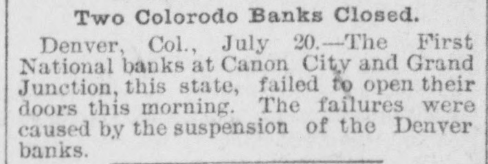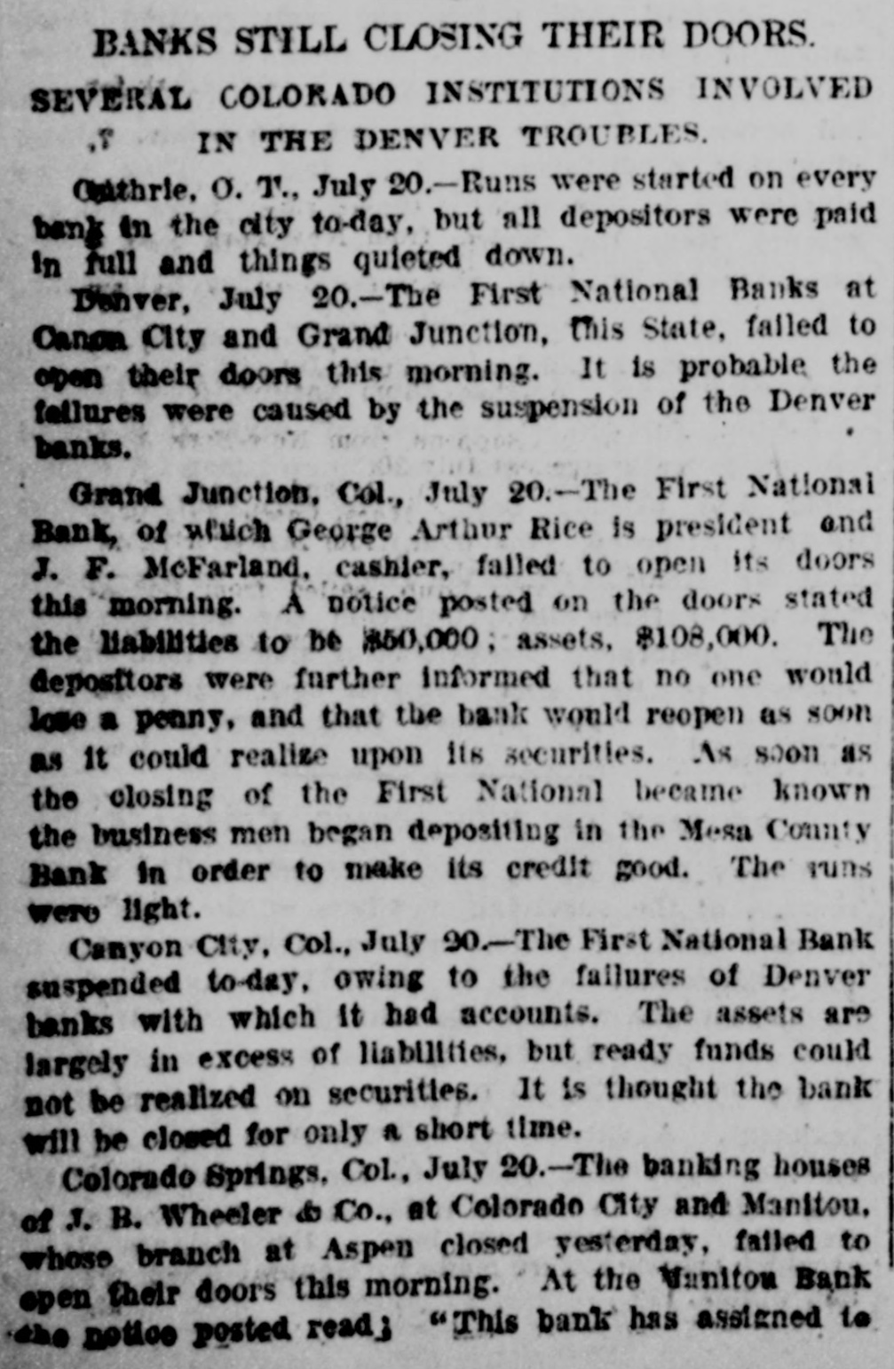 BANKS STILL CLOSING THEIR DOORS. SEVERAL COLORADO INSTITUTIONS INVOLVED IN THE DENVER TROUBLES. Outhrie, O. T., July 20.-Runs were started on every bank in the city to-day, but all depositors were paid in full and things quieted down. Denver, July 20.-The First National Banks at Canon City and Grand Junction, this State, failed to open their doors this morning. It is probable the feilures were caused by the suspension of the Denver banks. Grand Junction, Cól., July 20.-The First National Bank, of which George Arthur Rice is president and J. F. McFarland. cashier, falled to open its doors this morning. A notice posted on the doors stated the liabilities to be $50,000; assets, $108,000. The depositors were further informed that no one would lose a penny, and that the bank would reopen as soon as it could realize upon its securities. As soon as the closing of the First National became known the business men began depositing in the Mesa County Bank In order to make its credit good. The runs were light. Canyon City, Col., July 20-The First National Bank suspended to-day, owing to the failures of Denver banks with which It had accounts. The assets are largely in excess of liabilities, but ready funds could not be realized on securities. It is thought the bank will be closed for only n short time. Colorado Springs, Col., July 20.-The banking houses of 3. B. Wheeler & Co., at Colorado City and Manitou. whose branch at Aspen closed yesterday, failed to open their doors this morning. At the Vaniton Bank the notice posted read; "This bank has assigned to