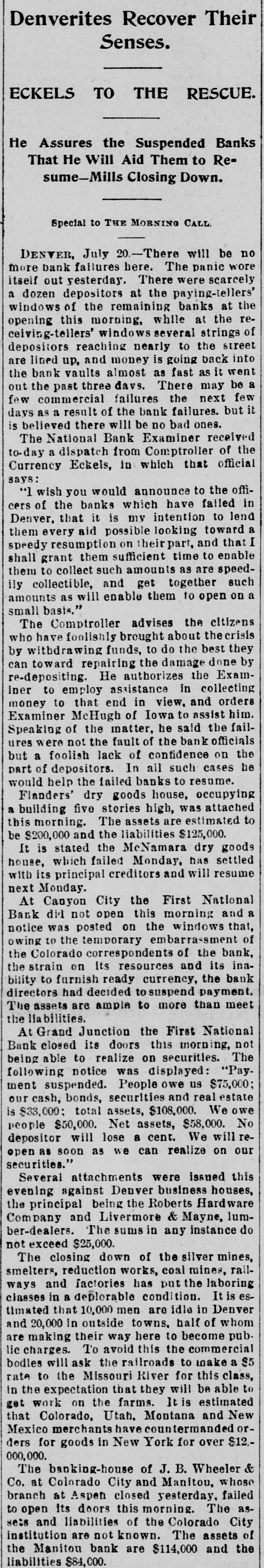 Denverites Recover Their Senses. ECKELS TO THE RESCUE. He Assures the Suspended Banks That He Will Aid Them to Resume-Mills Closing Down. Special to THE MORNING CALL. July 20.-There will be wore no DENVER, bank failures here. The panic scarcely more out yesterday. There were itself at the paying-tellers' at a of the remaining this morning, while at windows dozen depositors banks strings the the re- of ceiving-tellers' opening windows several the street reaching nearly to back into depositors and money is going it vaults almost as fast as be are the lined bank up, may went few a past three davs. There next out the commercial failures the but it few a result of the bank failures. ones. days is as there will be no bad believed National Bank Examiner received of the The dispatch from Comptroller official Currency to-day a Eckels, in which that says: wish you would announce to failed the offi- in "1 the banks which have to lend cers of that it is my intention toward a Denver, aid possible looking that them every resumption on their part, time and to enable them sufficient are shall collect such amounts as speedy grant together speed- such I them to and get on a ily collectible, as will enable them to open The Comptroller brought advises about amounts who small have basis." foolighly funds, to do the the best the crisis citizens they by withdrawing damage done by toward repairing authorizes the the Examcan re-depositing. employ He assistance in and collecting orders iner to that end in view. assist him. money Examiner to McHugh of Iowa he said to the failSpeaking of the the matter, fault of the bank officials on the ures were not lack of confidence be help would house, but part a of foolish depositors. the failed In banks all such to resume. occupying cases this morning. the liabilities a Flanders' building five dry The stories goods assets high, are was $125,000. estimated attached to be $200,000 stated and the McNamara has dry settled goods It is failed Monday, resume with house, its which principal creditors and will next Monday. the First National a Canyon City this morning and was At did not open windows that, to correspondents its notice owing Bank the posted temporary on the embarra-sment of and the bank, ina- of the the strain Colorado on its ready resources currency, payment. the bank bility to furnish decided to suspend than meet directors assets had are ample to more The lia bilities. the First National Grand this the At Junction its doors morning, The not closed on securities. Bank being able to realize was displayed: "Payfollowing suspended. notice People owe and us real $75,000; estate ment bonds, securities $108,000. We owe our cash, total assets, $58,000. No open is people depositor $33,000: as $50,000. soon will as lose Net we a assets, can cent. realize We will on this our reissued securities." Several attachments were business houses, against Denver the Roberts Hardware lumevening being Mayne, ber-dealers. Company the principal and The Liverimore sums in any & instance do mines, not exceed closing $25,000. down of the coal silver mines, railThe reduction works, the laboring smelters. factories has put It is a deplorable idle in classes ways and in 10,000 men condition: are half of Denver whom estimated that outside towns. become puband 20,000 in their way here the to commercial $5 are making To avoid this to make a lic charges. ask the railroads for this class, will be rate expectation It is New bodies in the to will the Missouri the that farms. River they estimated and able to get that work Colorado. on Utah. have Montana countermanded $12.- orMexico for merchants goods in New York for Wheeler over & 000,000. ders The Colorado banking-house City and of yesterday, J. Manitou, B. whose failed at this morning. to open its of the The assets of branch Co. at and liabilities Aspen doors closed known. Colorado and The City the asseis institution Manitou are bank not are $114,000 the inhilities $84,000.