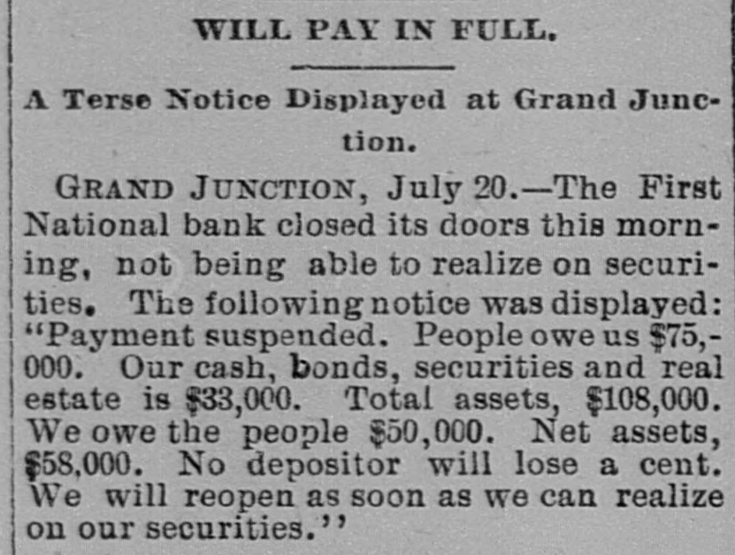 WILL PAY IN FULL. A Terse Notice Displayed at Grand Junetion. GRAND JUNCTION, July 20.-The First National bank closed its doors this morning, not being able to realize on securities. The following notice was displayed: "Payment suspended. People owe us $75,000. Our cash, bonds, securities and real estate is $33,000. Total assets, $108,000. We owe the people $50,000. Net assets, $58,000. No depositor will lose a cent. We will reopen as soon as we can realize on our securities."