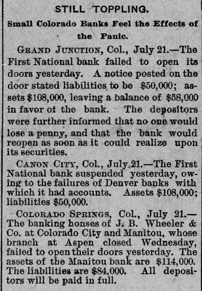 STILL TOPPLING. Small Colorado Banks Feel the Effects of the Panic. GRAND JUNCTION, Col., July 21.-The First National bank failed to open its doors yesterday. A notice posted on the door stated liabilities to be $50,000; assets $108,000, leaving a balance of $58,000 in favor of the bank. The depositors were further informed that no one would lose a penny, and that the bank would reopen as soon as it could realize upon its securities. CANON CITY, Col., July 21.-The First National bank suspended yesterday, owing to the failures of Denver banks with which it had accounts. Assets $108,000; liabilities $50,000. COLORADO SPRINGS, Col., July 21.The banking honses of J. B. Wheeler & Co. at Colorado City and Manitou, whose branch at Aspen closed Wednesday, failed to open their doors yesterday. The assets of the Manitou bank are $114,000. The liabilities are $84,000. All depositors will be paid in full.