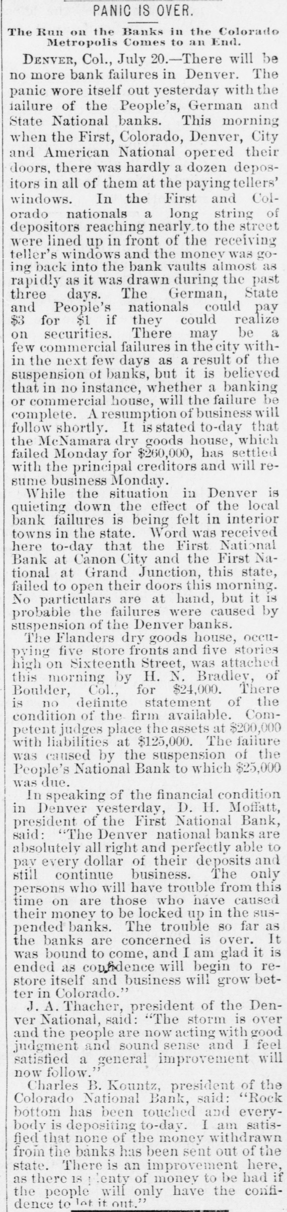 DENVER, Col., July 20.-There will b more bank failures in Denver. Th wore itself out yesterday with th lure of the People's, German an National banks. This mornin the First, Colorado, Denver, Cit American National opered thei there was hardly a dozen depos in all of them at the paying tellers ndows. In the First and Col nationals a long string € positors reaching nearly. to the stree lined up in front of the receiving windows and the money was go back into the bank vaults almost a as it was drawn during the pas days. The German, Stat People's nationals could par for $1 if they could realiz securities. There may be commercial failures in the city with the next few days as a result of th spension of banks, but it is believe in no instance, whether a banking commercial house, will the failure b mplete. A resumption of business will low shortly. It is stated to-day tha McNamara dry goods house, which Monday for $260,000, has settle the principal creditors and will re business Monday. While the situation in Denver i lieting down the effect of the loca failures is being felt in interio in the state. Word was receive to-day that the First Nationa at Canon City and the First Na at Grand Junction, this state to open their doors this morning particulars are at hand, but it i obable the failures were caused b spension of the Denver banks. The Flanders dry goods house, occu five store fronts and five storie on Sixteenth Street, was attache morning by H. N. Bradley, o oulder, Col., for $24,000. Ther no definite statement of th ndition of the firm available. Con judges place the assets at $200,00 liabilities at $125,000. The failur caused by the suspension of th cople's National Bank to which $25,00 due. speaking of the financial conditio Denver yesterday, D. H. Moffat esident of the First National Bank "The Denver national banks ar solutely all right and perfectly able j every dollar of their deposits an continue business. The onl who will have trouble from th on are those who have cause money to be locked up in the sus ended banks. The trouble SO far a banks are concerned is over. ] bound to come, and I am glad it as confidence will begin to re itself and business will grow be in Colorado."