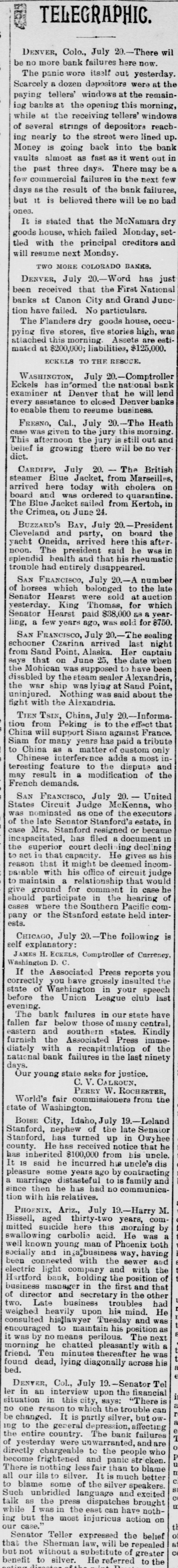 TELEGRAPHIC. DENVER, Colo., July 20.-There will be no more bank failures here now. The panic wore itself out yesterday. Scarcely a dozen depositors were at the paying tellers' windows at the remaining banks at the opening this morning, while at the receiving tellers' windows of several strings of depositors reaching nearly to the street were lined up. Money is going back into the bank vaults almost as fast as it went out in the past three days. There may be a few commercial failures in the next few days as the result of the bank failures, but it is believed there will be no bad ones. It is stated that the McNamara dry goods house, which failed Monday, settled with the principal creditors and will resume next Monday. TWO MORE COLORADO BANKS. DENVER, July 20.-Word has just been received that the First National banks at Canon City and Grand Junetion have failed. No particulars. The Flanders dry goods house, occupying five stores, five stories high, was attached this morning. Assets are estimated at $200,000; liabilities, $125,000. ECKELS TO THE RESCUE. WASHINGTON, July 20.-Comptroller Eckels has informed the national bank examiner at Denver that he will lend every assistance to closed Denver banks to enable them to resume business. FRESNO, Cal., July 20.-The Heath case was given to the jury this morning. This afternoon the jury is still out and belief is growing there will be no ver dict. CARDIFF, July 20. The British steamer Blue Jacket. from Marseilles, arrived here today with cholera on board and was ordered to quarantine. The Blue Jacket sailed from Kertoh, in the Crimea, on June 24. BUZZARD'S BAY, July 20.-President Cleveland and party, on board the yacht Oneida, arrived here this afternoon. The president said he WAS in splendid health and that his rheumatic trouble had entirely disappeared. SAN FRANCISCO, July 20.-A number of horses which belonged to the late Senator Hearst were sold at auction yesterday. King Thomas, for which Senator Hearst paid $38,000 &8 8 yearling, a few years ago, was sold for $750. SAN FRANCISCO, July 20.-The sealing schooner Czarina arrived last night from Sand Point, Alaska. Her captain says that on June 25, the date when the Mohican was supposed to have been disabled by the steam sealer Alexandria, the war ship was lying at Sand Point, uninjured. Nothing was said about the fight with the Alexandria. TIEN TSIN, China, July 20.-Information from Peking is to the effect that China will support Siam against France. Siam for many years has paid a tribute to China as a matter of custom only Chinese interference adds a most interesting feature to the dispute and may result in a modification of the French demands. SAN FRANCISCO, July 20. - United States Circuit Judge McKenna, who was nominated as one of the executors of the late Senator Stanford's estate, in case Mrs. Stanford resigned or became incapacitated, has filed a document in the superior court decli ing declining to act in that capacity. He gives as his reason that it might be deemed incompaiable with his office of circuit judge to maintain a relationship that would give ground for comment in case he should participate in the hearing of cases where the Southern Pacific company or the Stanford estate held interests. CHICAGO, July 20.-The following is self explanatory: JAMES H. ECKELS, Comptroller of Currency, Washington D. C. If the Associated Press reports you correctly you have grossly insulted the state of Washington in your speech before the Union League club last evening. The bank failures in our state have fallen far below those of many central, eastern and southern states. Kindly furnish the Associated Press immediately with a recapitulation of the national bank failures in the last ninety days. Our young state asks for justice. C. V. CALROUN, PERRY W. ROCHESTER, World's fair commissioners from the state of Washington. BOISE City, Idaho, July 19.-Leland Stanford, nephew of the late Senator Stanford, has turned up in Owyhee county. He has received notice that he has inherited $100,000 from his uncle. It 18 said he incurred his uncle's dis pleasure some years ago by contracting a marriage distasteful to is family and since then he has had no communication with his relatives. PHOENIX, Ariz., July 19.-Harry M. Bissell, aged thirty-two years, committed suicide here this morning by swallowing carbolic acid. He was a well known young man of Phoenix both socially and in a business way, having been connected with the sewer and electric light company and with the Hartford bank, bolding the position of business manager in the first and that of director and secretary in the other two. Late business troubles had weighed heavily upon his mind. He consulted hisflawyer Tuesday and was encouraged to maintain his position as it was by no means perilous. The next morning he chatted pleasantly with a friend. Ten minutes thereafter he was found dead, lying diagonally across his bed. DENVER, Col., July 19.-Senator Tel ler in an interview upon the financial situation in this city, says: "There is no one reason to which the trouble can be changed. It is partly silver, but OWing to the general depression, affecting the entire country. The bank failures of yesterday were unwarranted, and are directly chargeable to the people who become frightened and panic str cken. There is nothing less fair than to blame n all our ills to silver. It is much better to blame some of the silver speakers. Such unbridled language and excited