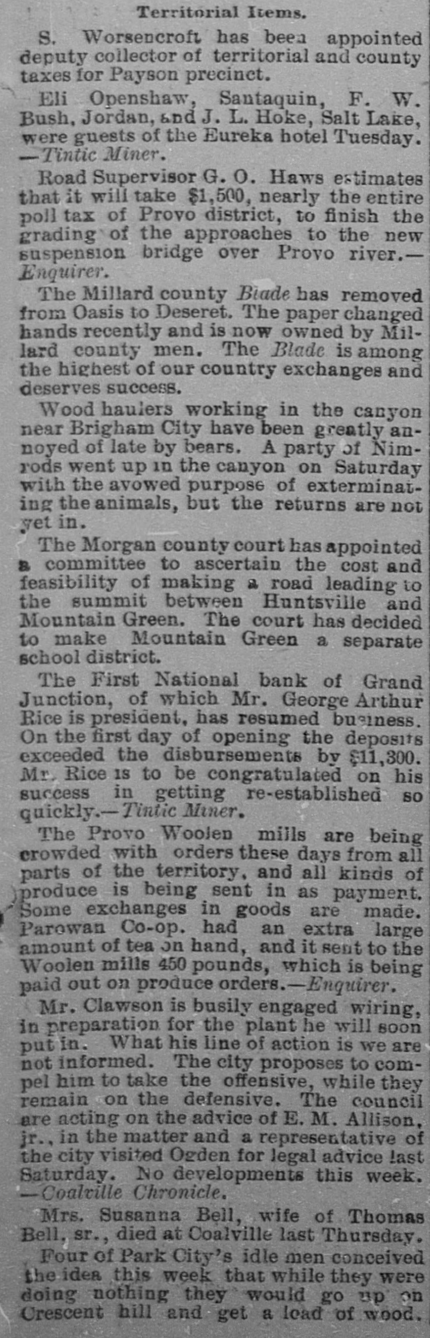 Territorial Items. S. Worsencroft has been appointed deputy collector of territorial and county taxes for Payson precinct. Eli Openshaw, Santaquin, F. W. Bush, Jordan, and J. L. Hoke, Salt Lake, were guests of the Eureka hotel Tuesday. -Tintic Miner. Road Supervisor G. 0. Haws estimates that it will take $1,500, nearly the entire poll tax of Provo district, to finish the grading of the approaches to the new suspension bridge over Provo river.Enquirer. The Millard county Biade has removed from Oasis to Deseret. The paper changed hands recently and is now owned by Millard county men. The Blade is among the highest of our country exchanges and deserves success. Wood haulers working in the canyon near Brigham City have been greatly annoyed of late by bears. A party of Nimrods went up in the canyon on Saturday with the avowed purpose of exterminating the animals, but the returns are not yet in. The Morgan county court has appointed a committee to ascertain the cost and feasibility of making a road leading to the summit between Huntsville and Mountain Green. The court has decided to make Mountain Green a separate school district. The First National bank of Grand Junction, of which Mr. George Arthur Rice is president, has resumed business. On the first day of opening the deposits exceeded the disbursements by $11,300. Mr. Rice IS to be congratulated on his success in getting re-established so quickly.- Tintic Miner. The Provo Woolen mills are being crowded with orders these days from all parts of the territory, and all kinds of produce is being sent in as payment. Some exchanges in goods are made. Parowan Co-op. had an extra large amount of tea on hand, and it sent to the Woolen mills 450 pounds, which is being paid out on produce orders.-Enquirer. Mr. Clawson is busily engaged wiring, in preparation for the plant he will soon putin. What his line of action is we are not informed. The city proposes to compel him to take the offensive, while they remain on the defensive. The council are acting on the advice of E. M. Allison, jr., in the matter and a representative of the city visited Ogden for legal advice last Saturday. No developments this week. -Coalville Chronicle. Mrs. Susanna Bell, wife of Thomas Bell, sr., died at Coalville last Thursday. Four of Park City's idle men conceived the idea this week that while they were doing nothing they would go up on Crescent hill and get a load of wood.