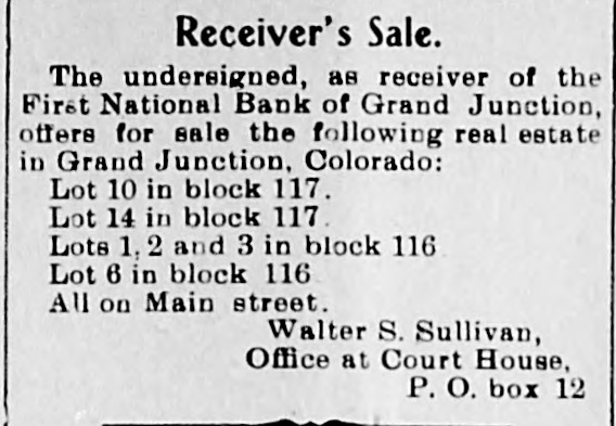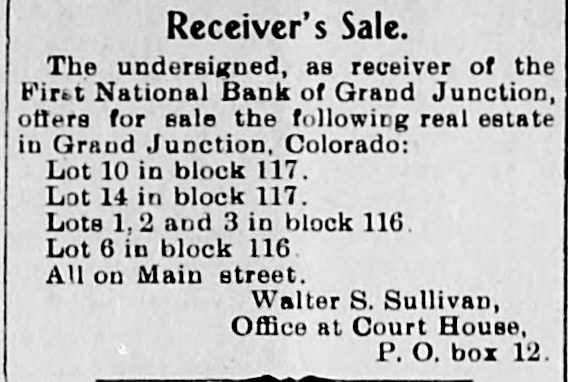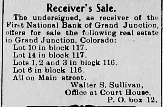 Receiver's Sale. The undersigned, as receiver of the First National Bank of Grand Junction, offers for sale the following real estate in Grand Junction, Colorado: Lot 10 in block 117. Lot 14 in block 117. Lots 1,2 and 3 in block 116. Lot 6 in block 116. All on Main street. Walter S. Sullivan, Office at Court House, P. O. box 12.