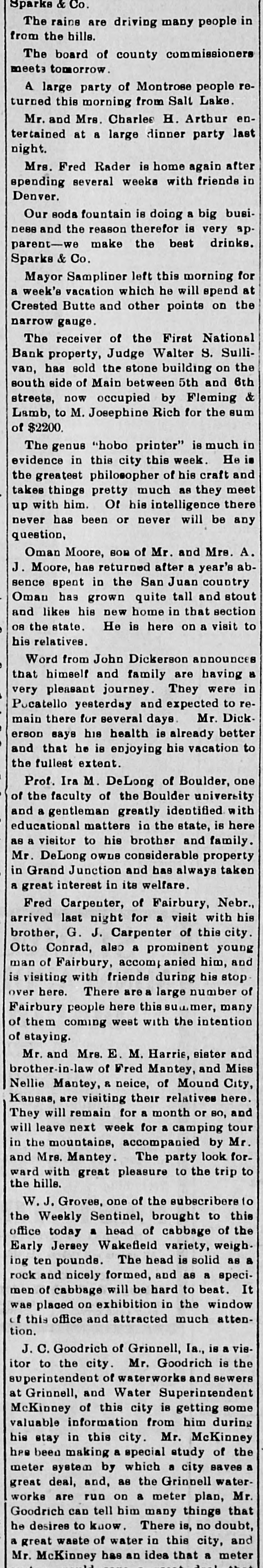 Sparks & Co. The raine are driving many people in from the hills. The board of county commissioners meet tomorrow A large party of Montrose people returned this morning from Salt Lake. Mr. and Mrs. Charlee H. Arthur entertained at a large dinner party last night. Mrs. Fred Rader is home again after spending several weeks with friends in Denver. Our soda fountain is doing a big business and the reason therefor is very ap. parent-we make the best drinks. Sparks & Co. Mayor Sampliner left this morning for a week's vacation which he will spend at Creeted Butte and other points on the narrow gauge. The receiver of the First National Bank property, Judge Walter S. Sullivan, has sold the stone building on the south side of Main between 5th and 6th streets, now occupied by Fleming & Lamb, to M. Josephine Rich for the sum of $2200. The genus "hobo printer" is much in in this is the evidence greatest philosopher city this of week. his craft He and takes as meet with him. Of up things pretty his much intelligence they there never has been or never will be any question, Oman Moore, BOB of Mr. and Mrs. A. J. Moore, has returned after a year's absence spent in the San Juan country Oman has grown quite tall and stout and likes his new home in that section OR the state. He is here on a visit to his relatives. Word from John Dickerson announces that himself and family are having a very pleasant journey. They were in Pocatello yesterday and expected to remain there for several days. Mr. Dickerson says his health is already better and that he is enjoying his vacation to the fullest extent. Prof. Ira M. DeLong of Boulder, one of the faculty of the Boulder university and a gentleman greatly identified with educational matters in the state, is here as a visitor to his brother and family. Mr. DeLong OWD8 considerable property in Grand Junction and has always taken a great interest in its welfare. Fred Carpeuter, of Fairbury, Nebr., arrived last night for a visit with his brother, G. J. Carpenter of this city. Otto Conrad, also a prominent young man of Fairbury, accomp anied him, and is visiting with friends during his stop over here. There are a large number of Fairbury people here this summer, many of them coming weet with the intention of staying. Mr. and Mrs. E. M. Harrie, sister and brother-in-law of Fred Mantey, and Miss Nellie Mantey, & neice, of Mound City, Kansas, are visiting their relatives here. They will remain for a month or so, and will leave next week for a camping tour in the mountains, accompanied by Mr. and Mrs. Mantey. The party look forward with great pleasure to the trip to the hills. W. J. Groves, one of the subscribers to the Weekly Sentinel, brought to this office today a head of cabbage of the Early Jersey pounds. Wakefield The head variety, is solid weigh. ing ten as a rock and nicely formed, and as a specimen of cabbage will be hard to beat. It was placed on exhibition in the window ct this office and attracted much attention. J. . C. Goodrich of Grinnell, Ia., is a vieitor to the city. Mr. Goodrich is the superintendent of waterworks and sewers at Grinnell, and Water Superintendent McKinney of this city is getting some valuable information from him during his stay in this city. Mr. McKinney hee been making a special study of the meter a saves a and, as watergreat deal, system by which the Grinnell city works run on a Mr. can many that Goodrich are tell him meter things plan, he desiree to know. There is, no doubt, a great waste of water in this city, and Mr. McKinney has an idea that a meter -
