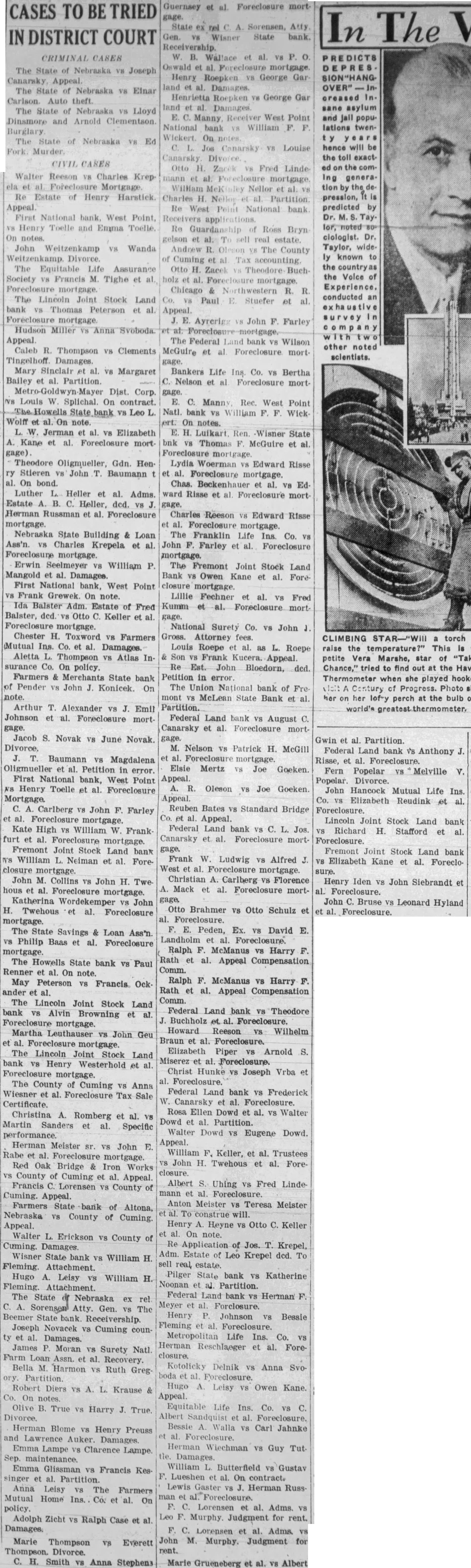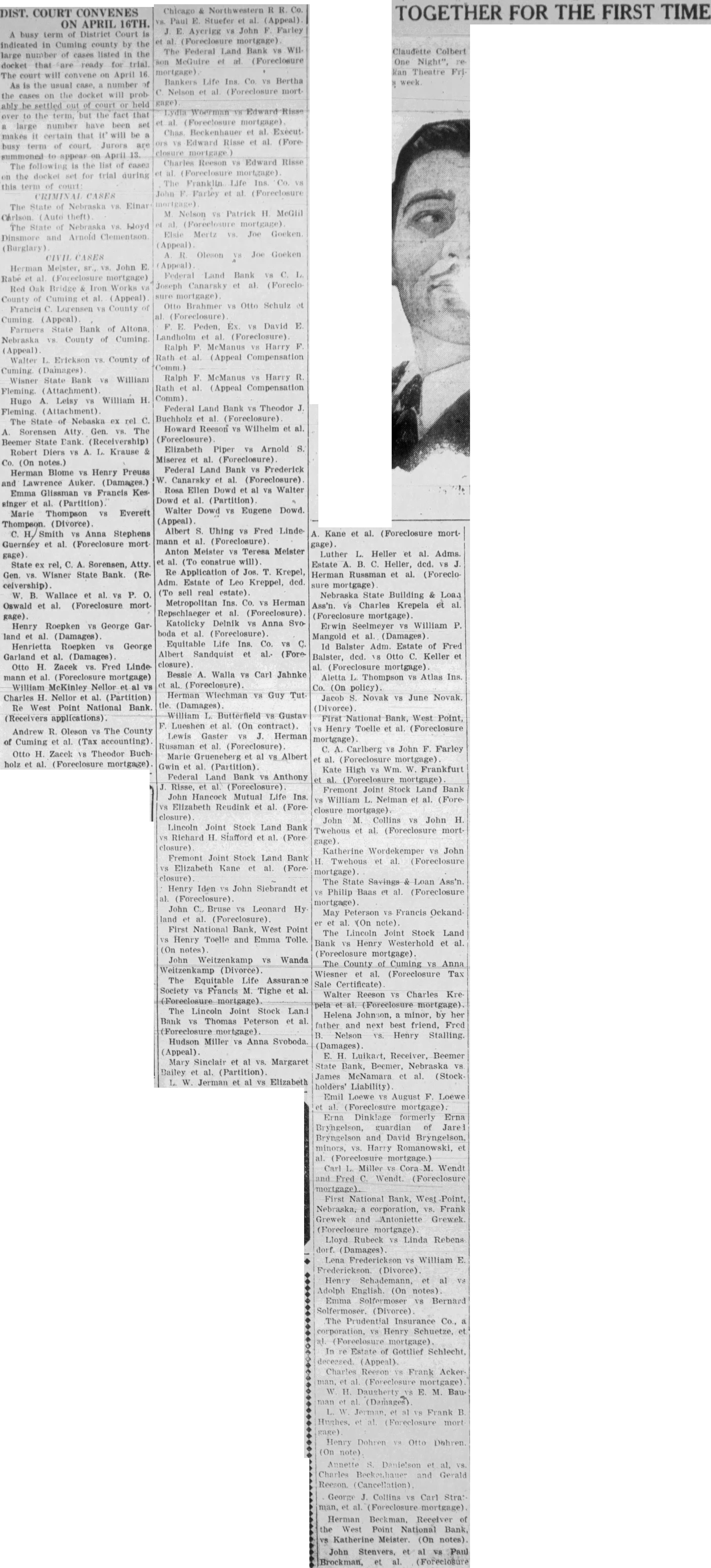 DIST. COURT CONVENES ON APRIL 16TH. A busy term of District Court is indicated in Cuming county by the large number of cases listed in the docket that Fare ready for trial. The court will convene on April 16 As is the usual case, a number of the cases on the docket will probably be settled out of court or held over to the term, but the fact that a large number have been set makes it certain that it' will be a busy term of court. Jurors are summoned to appear on April 13. The following is the list of cases on the docket set for trial during this term of court CRIMIN CASES The State of Nebraska VS. Einar Carlson (Auto theft) The State of Nebraska vs. bloyd Dinsmore and Arnold Clementson (Burglary) CIVIL CASES Herman Metster, sr., vs. John E Rabe et al. (Foreclosure mortgage) Red Oak Bridge & Iron Works VA County of Cuming et al. (Appeal) Francis C. Lorensen VS County of Cuming. (Appeal) Farmers State Bank of Altona Nebraska VS. County of Cuming (Appeal) Walter L. Erickson vs. County of Cuming. (Damages) Wisner State Bank V8 William Fleming. (Attachment) Hugo A. Leisy V8 William H. Fleming (Attachment) The State of Nebaska ex rel C. A. Sorensen Atty. Gen. VS. The Beemer State Bank. (Receivership) Robert Diers VS A. L. Krause & Co. (On notes.) Herman Blome VS Henry Preuss and Lawrence Auker. (Damages.) Emma Glissman V8 Francis Kessinger et al. (Partition) Marie Thompson V8 Everett Thompson. (Divorce). C. H./ Smith VS Anna Stephens Guernsey et al. (Foreclosure mortgage). State ex rel, C. A. Sorensen, Atty. Gen. VS. Wisner State Bank. (Receivership). W. B. Wallace et al. VS P. O. Oswald et al. (Foreclosure mortgage). Henry Roepken VS George Garland et al. (Damages). Henrietta Roepken VS George Garland et al. (Damages). Otto H. Zacek vs. Fred Linde mann et al. (Foreclosure mortgage) William McKinley Nellor et al vs Charles H. Nellor et al. (Partition) Re West Point National Bank. (Receivers applications). Andrew R. Oleson VS The County of Cuming et al. (Tax accounting). Otto H. Zacek VS Theodor Buchholz et al. (Foreclosure mortgage). Chicago & Northwestern R R. Co. V.S. Paul E. Stuefer et al. (Appeal) J. E Ayerigg VS John F. Farley et al. (Foreclosure mortgage). The Federal Land Bank vs Wilson McGuire et al (Foreclosure mortgage) Bankers Life Ins Co. V8 Bertha C. Nelson et al (Foreclosure mort gage) et at (Foreclosure mortgage) Chas Beckenhauer et al. Execut ors V8 Edward Risse et al. (Fore closure mortgage.) Charles Reeson V8 Edward Risse et al. (Foreclosure mortgage) The Franklin Life Ins Co. VS John F Farley et at (Foreclosure mortgage) et al (Foreclosure mortgage) Elsie Mertz V8. Joe Goeken (Appeal) R Oleson ys Joe Goeken (Appeal) Federal Land Bank VS C. L. Joseph Canarsky et al. (Foreclo sure mortgage). Otto Brahmer VS Otto Schulz et al (Foreclosure) F. E. Peden, Ex. V8 David E. Landholm et al. (Foreclosure) Ralph F. McManus V8 Harry F Rath et al. (Appeal Compensation Comm.) Ralph F. McManus VS Harry R. Rath et al. (Appeal Compensation Comm) Federal Land Bank VS Theodor J. Buchholz et al. (Foreclosure) Howard Reeson VS Wilhelm et al. (Foreclosure) Elizabeth Piper VS Arnold S. Miserez et al. (Foreclosure) Federal Land Bank VS Frederick W. Canarsky et al. (Foreclosure) Rosa Ellen Dowd et al V8 Walter Dowd et al. (Partition) Walter Dowd VS Eugene Dowd. Albert S. Uhing VS Fred Lindemann et al. (Foreclosure) Anton Meister V8 Teresa Meister et al. (To construe will). Re Application of Jos. T. Krepel, Adm. Estate of Leo Kreppel, ded. (To sell real estate). Metropolitan Ins. Co. VS Herman Repschlaeger al. (Foreclosure). Katolicky Delnik VS Anna Svoboda et al. (Foreclosure) Equitable Life Ins. Co. V8 C. Albert Sandquist et al.- (ForeBessie A. Walla VS Carl Jahnke et al. (Foreclosure). Herman Wiechman V8 Guy Tut tle. (Damages). William L. Butterfield V8 Gustav F. Lueshen et al. (On contract). Lewis Gaster VS J. Herman Russman et al. (Foreclosure). Marie Grueneberg et al Albert Gwin et al. (Partition). Federal Land Bank vs Anthony J. Risse, et al. (Foreclosure) John Hancock Mutual Life Ins. VS Elizabeth Reudink et al. (Foreclosure). Lincoln Joint Stock Land Bank vs Richard H. Stafford et al. (Fore Fremont Joint Stock Land Bank vs Elizabeth Kane et al. (Foreclosure) Henry Iden vs John Siebrandt et John C., Bruse VS Leonard Hy land et al. (Foreclosure) First National Bank West Point VS Henry Toelle and Emma Tolle. (On notes) John Weitzenkamp VS Wanda Weitzenkamp (Divorce). The Equitable Life Assurance Society vs Francis M. Tighe et al. The Lincoln Joint Stock Land Bank VS Thomas Peterson et al. (Foreclosure mortgage) Hudson Miller VS Anna Svoboda. (Appeal) Mary Sinclair et al vs. Margaret Bailey et al. (Partition). L. W. Jerman et al vs Elizabeth TOGETHER FOR THE FIRST TIME A. Kane et al. (Foreclosure mortgage) Luther L. Heller et al. Adms. Estate A. B. C. Heller, ded. vs J. Herman Russman et al. (Foreclosure mortgage) Nebraska State Building & Load Ass'n. VS Charles Krepela et al. (Foreclosure mortgage) Erwin Seelmeyer VS William P. Mangold et al. (Damages) Id Balster Adm. Estate of Fred Balster, ded. is Otto C. Keller et al. (Foreclosure mortgage) Aletta L. Thompson VS Atlas Ins. Co. (On policy). Jacob S. Novak VS June Novak. (Divorce) First National Bank, West Point, VS Henry Toelle et al. (Foreclosure mortgage) C. A. Carlberg VS John F. Farley et al. (Foreclosure mortgage) Kate High V8 Wm. W. Frankfurt et al. (Foreclosure mortgage) Fremont Joint Stock Land Bank vs William L. Neiman et al. (Foreclosure mortgage). John M. Collins VS John H. Twehous et al. (Foreclosure mortgage). Katherine Wordekemper VS John H. Twehous et al. (Foreclosure mortgage) The State Savings & Loan Ass'n. VS Philip Baas et al. (Foreclosure mortgage) May Peterson VS Francis Ockand er et al (On note) The Lincoln Joint Stock Land Bank VS Henry Westerhold et al. (Foreclosure mortgage). The County of Cuming vs Anna Wiesner et al. (Foreclosure Tax Sale Certificate) Walter Reeson VS Charles Krepela (Foreclosure mortgage). Helena Joh