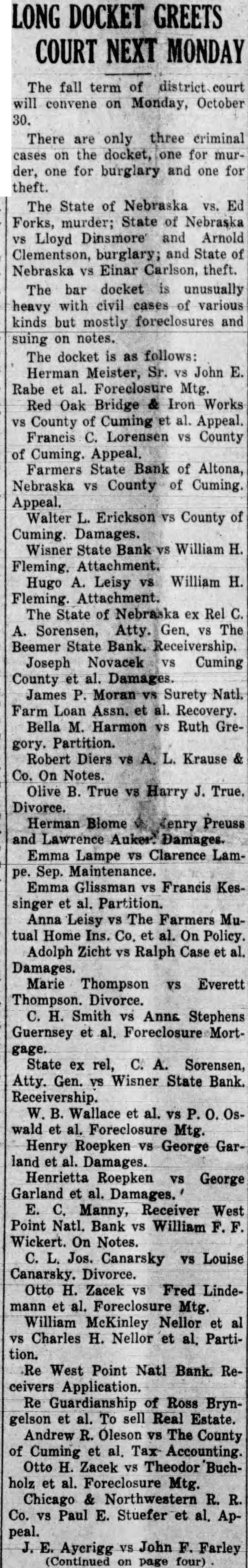 NEXT The fall term of district court will convene on Monday, October 30. There are only three criminal cases on the for murder, one for burglary and one for theft. The State of Nebraska Forks, murder; State of Nebraska Lloyd and Arnold Clementson, burglary; and State of Nebraska Einar Carlson, theft. The bar docket unusually heavy with civil cases of various kinds but mostly foreclosures and suing notes. The docket is as follows: Herman Meister, Sr. John Rabe al. Foreclosure Mtg. Red Oak Bridge Iron Works County of Cuming Appeal. Francis Lorensen County of Cuming. Farmers State Bank of Altona, Nebraska County Cuming. Appeal. Walter Erickson County of Cuming. Damages. Wisner State Bank William Fleming. Hugo Leisy H. Fleming. Attachment. The State of Nebraska Rel A. Sorensen, Atty. The Beemer State Bank. Joseph Novacek Cuming County Damages. James Surety Farm Loan Recovery. Bella M. Harmon Ruth gory. Partition. Robert Diers Krause Co. On Notes. Olive True Harry True. Divorce. Herman and Emma Lampe Clarence LamSep. Maintenance. Emma Glissman Francis Kessinger al. Partition. Anna Leisy Farmers Mutual Home Ins. Co. Adolph Zicht Ralph Damages. Marie Thompson Everett Thompson. Divorce. Smith Anna Stephens Guernsey et gage. State ex rel, Sorensen, Atty. Gen. Wisner State Bank. Receivership. Wallace wald et Foreclosure Mtg. Henry Roepken George land Damages. Henrietta Roepken vs George Garland Damages. E. Manny, Receiver West Point Natl. Bank William Wickert. On Notes. Jos. Canarsky vs Louise Canarsky. Divorce. Otto H. Zacek Fred Lindemann Foreclosure Mtg. William McKinley Nellor Charles H. Nellor et al. Partition. Re West Point Natl Bank. Receivers Application. Re Guardianship of Ross gelson To Real Estate. Andrew Oleson The County of Cuming Tax Accounting. Otto Zacek holz et al. Foreclosure Chicago & Northwestern Paul E. Stuefer peal. Ayerigg John Farley (Continued page four)