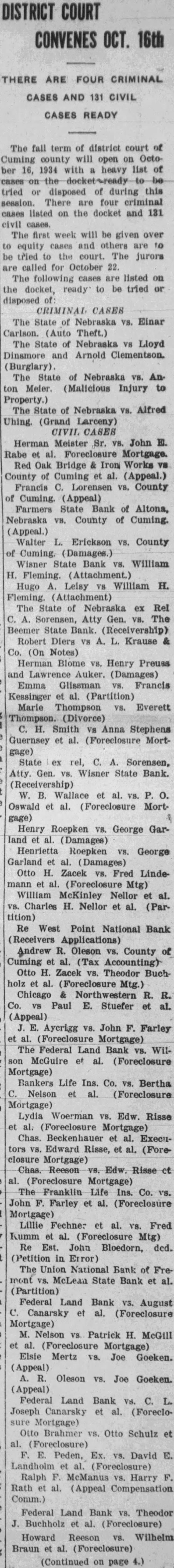 COURT CONVENES OCT. THERE ARE FOUR CRIMINAL CASES AND 131 CIVIL CASES READY The fall term of district court of Cuming county will open on October 16, 1934 with heavy list of tried disposed of during this session. There are four criminal cases listed on the docket and 131 cases. The first week will be given over to equity cases and others are to be tried to the court. The jurors called for October 22. The following cases are listed on the docket, ready to be tried or disposed CRIMINAL The State of Nebraska VS. Einar Carlson. (Auto Theft.) The State of Nebraska V8 Lloyd Dinsmore and Arnold Clementson. (Burglary). The State of Nebraska VS. Anton (Malicious Injury to Property.) The State of Nebraska VS. Alfred Uhing. (Grand Larceny) CASES Herman Meister Sr. John E. Rabe Foreclosure Mortgage. Red Oak Bridge & Iron Works County of Cuming (Appeal.) Francis C. Lorensen VS. County of Cuming. (Appeal) Farmers State Bank of Altona, Nebraska County of Cuming. (Appeal.) Walter L. Erickson VS. County Cuming. (Damages.) Wisner State Bank VS. William H. Fleming. (Attachment.) Hugo Leisy vs William H. Fleming. (Attachment) The State of Nebraska ex Rel Sorensen, Atty Gen. vs. The Beemer State Bank. (Receivership) Robert Diers VS Krause (On Notes) Herman Blome Henry Preuss and Lawrence Auker. (Damages) Emma Glissman Francis Kessinger et (Partition) Marie Thompson Everett Thompson. (Divorce) H. Smith VS Anna Stephens Guernsey et al. (Foreclosure Mortgage) State ex rel, Sorensen, Atty. Gen. Wisner State Bank. (Receivership) W. B. Wallace et al. Oswald et al. (Foreclosure Mortgage) Henry Roepken George Garland (Damages) Henrietta Roepken George Garland al. (Damages) Otto H. Zacek Fred Lindemann (Foreclosure Mtg) William McKinley Nellor et al. VS. Charles H. Nellor et al. (Partition) Re West Point National Bank (Receivers Applications) Andrew R. Oleson vs. County of Cuming (Tax Accounting) Otto H. Zacek Theodor Buchholz et (Foreclosure Mtg.) Chicago Co. Paul E. Stuefer et al. (Appeal) Ayerigg vs. John Farley (Foreclosure The Federal Land Bank WilMcGuire et al. (Foreclosure Mortgage) Bankers Life Ins. Co. vs. Bertha Nelson et (Foreclosure Mortgage) Lydia Woerman VS. Edw. Risse al. (Foreclosure Mortgage) Chas. Beckenhauer et Executors Edward Risse, (Foreclosure Mortgage) Chas. Reeson Edw. Risse ct (Foreclosure Mortgage) The Franklin Life Ins. John Farley et al. (Foreclosure Mortgage) Lillie Fechner et al. vs. Fred Kumm (Foreclosure Mtg) Re Est. John Bloedorn, ded. (Petition in Error) The Union National Bank of Fremont McLean State Bank al. (Partition) Federal Land Bank vs. August Canarsky et al. (Foreclosure Mortgage) Nelson Patrick H. McGill (Foreclosure Mortgage) Elsie Mertz vs. Joe Goeken. (Appeal) Oleson Joe Goeken. (Appeal) Federal Land Bank VS. Joseph Canarsky et (ForecloMortgage) Otto Brahmer vs. Otto Schulz (Foreclosure) Peden, Ex. David Landholm (Foreclosure) Ralph McManus Harry Rath al. (Appeal Compensation Comm.) Federal Land Bank Theodor Buchholz et (Foreclosure) Howard Reeson vs. Wilhelm Braun al. (Foreclosure) (Continued on page