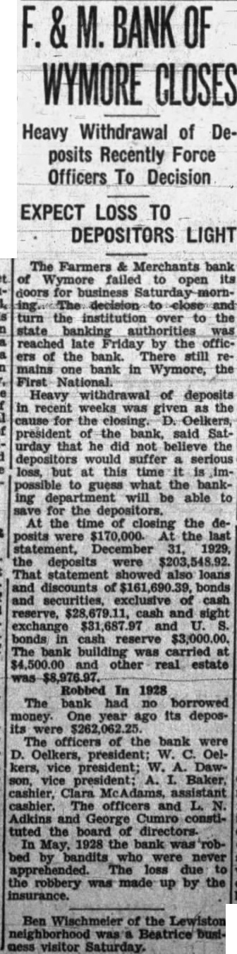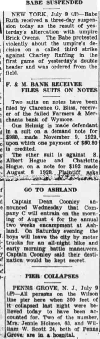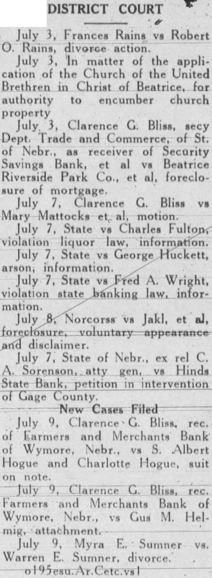 July 3, Frances Rains VS Robert O. Rains, divorce action. July 3, In matter of the application of the Church of the United Brethren in Christ of Beatrice, for authority to encumber church property July 3, Clarence G. Bliss, secy Dept. Trade and Commerce, of St. of Nebr., as receiver of Security Savings Bank, et al VS Beatrice Riverside Park Co., et al, foreclosure of mortgage. July 7, Clarence G. Bliss VS Mary Mattocks et, al, motion. July 7, State vs Charles Fulton, violation liquor law, information. July 7, State vs George Huckett, arson, information. July 7, State VS Fred A. Wright, violation state banking law, information. July 8, Norcorss vs Jakl, et al, foreclosure, voluntary appearance and disclaimer. July 7, State of Nebr., ex rel C. A. Sorenson, atty gen. VS Hinds State Bank, petition in intervention of Gage County. New Cases Filed July 9. Clarence G. Bliss, rec. of Farmers and Merchants Bank of Wymore, Nebr., vs S. Albert Hogue and Charlotte Hogue, suit on note. July 9, Clarence G. Bliss, rec. Farmers and Merchants Bank of Wymore, Nebr., vs Gus M. Helmig, attachment. July 9. Myra E. Sumner vs. Warren E. Sumner, divorce.
