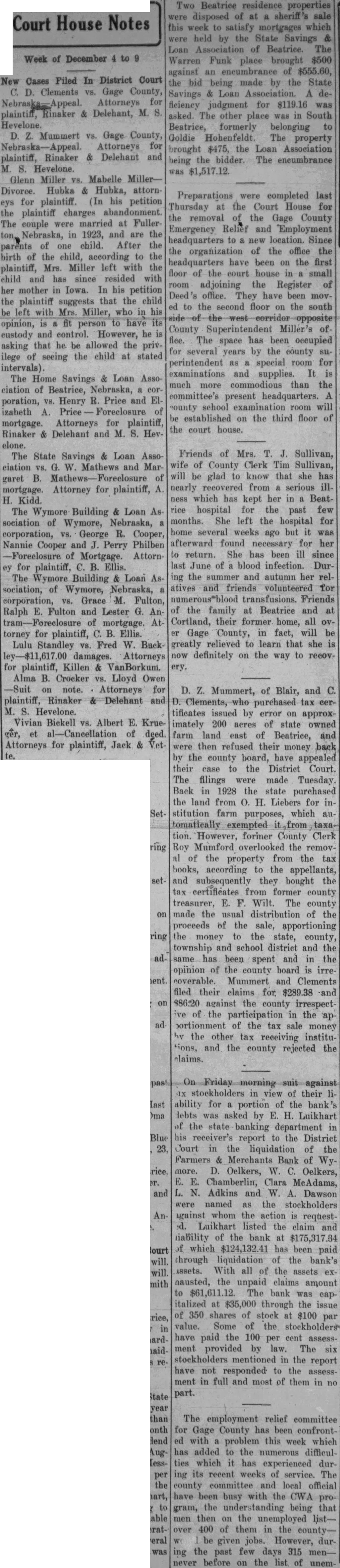 Court House Notes Week of December 4 to 9 New Cases Filed In District Court C. D. Clements VS. Gage County, Appeal. Attorneys for plaintiff, Rinaker & Delehant, M. S. Hevelone. D. Z. Mummert vs. Gage County, Appeal. Attorneys for plaintiff, Rinaker & Delehant and M. S. Hevelone. Glenn Miller VS. Mabelle MillerDivorce. Hubka & Hubka, attorneys for plaintiff. (In his petition the plaintiff charges abandonment. The couple were married at Fullerton, Nebraska, in 1923, and are the parents of one child. After the birth of the child, according to the plaintiff, Mrs. Miller left with the child and has since resided with her mother in Iowa. In his petition the plaintiff suggests that the child be left with Mrs. Miller, who in his opinion, is a fit person to have its eustody and control. However, he is asking that he be allowed the privilege of seeing the child at stated intervals). The Home Savings & Loan Association of Beatrice, Nebraska, a corporation, VS. Henry R. Price and Elizabeth A. Foreclosure of mortgage. Attorneys for plaintiff, Rinaker & Delehant and M. S. Hevelone. The State Savings & Loan Association vs. G. W. Mathews and Margaret B. Mathews-Foreelosure of mortgage. Attorney for plaintiff, A. H. Kidd. The Wymore Building & Loan Association of Wymore, Nebraska, a corporation, vs. George R. Cooper, Nannie Cooper and J. Perry Philben Foreelosure of Mortgage. Attorney for plaintiff, C. B. Ellis. The Wymore Building & Loan Association, of Wymore, Nebraska, a corporation, VS. Grace M. Fulton, Ralph E. Fulton and Lester G. Antram-Foreclosure of mortgage. Attorney for plaintiff, C. B. Ellis. Lulu Standley VS. Fred W. Buckley-$11,617.00 damages. Attorneys for plaintiff, Killen & VanBorkum. Alma B. Crocker vs. Lloyd Owen -Suit on note. Attorneys for plaintiff, Rinaker Delehant and M. S. Hevelone. Vivian Bickell vs. Albert E. Kruegêr, et al-Cancellation of deed. Attorneys for plaintiff, Jack & Vette. Two Beatrice residence properties were disposed of at a sheriff's sale this week to satisfy mortgages which were held by the State Savings & Loan Association of Beatrice. The Warren Funk place brought $500 against an eneumbrance of $555.60, the bid being made by the State Savings & Loan Association. A defieiency judgment for $119.16 was asked. The other place was in South Beatrice, formerly belonging to Goldie Hohenfeldt. The property brought $475, the Loan Association being the bidder. The eneumbrance was $1,517.12. Preparations were completed last Thursday at the Court House for the removal of the Gage County Emergency Relief and Employment headquarters to a new location. Since the organization of the office the headquarters have been on the first floor of the court house in a small room adjoining the Register of Deed's office. They have been moved to the second floor on the south side County Superintendent Miller's office. The space has been occupied for several years by the county superintendent as a special room for examinations and supplies. It is much more commodious than the committee's present headquarters. A county school examination room will be established on the third floor of the court house. Friends of Mrs. T. J. Sullivan, wife of County Clerk Tim Sullivan, will be glad to know that she has nearly recovered from a serious illness which has kept her in a Beatrice hospital for the past few months. She left the hospital for home several weeks ago but it was afterward found necessary for her to return. She has been ill since last June of a blood infection. During the summer and autumn her relatives and friends volunteered for numerous*blood transfusions. Friends of the family at Beatrice and at Cortland, their former home, all over Gage County, in fact, will be greatly relieved to learn that she is now definitely on the way to recovery. D. Z. Mummert, of Blair, and C. D. Clements, who purchased tax certificates issued by error on approximately 200 acres of state owned farm land east of Beatrice, and were then refused their money back by the county board, have appealed their case to the District Court. The filings were made Tuesday. Back in 1928 the state purchased the land from O. H. Liebers for institution farm purposes, which antomatically exempted from taxation. However, former County Clerk Roy Mumford overlooked the removal of the property from the tax books, according to the appellants, and subsequently they bought the tax certificates from former county treasurer, E. F. Wilt. The county made the usual distribution of the proceeds of the sale, apportioning the money to the state, county, township and school district and the same has been spent and in the opinion of the county board is irrecoverable. Mummert and Clements filed their claims for $289.38 and $86.20 against the county irrespective of the participation in the apportionment of the tax sale money by the other tax receiving institutions, and the county rejected the claims. On Friday morning suit against 1X stockholders in view of their liability for a portion of the bank's debts was asked by E. H. Luikhart of the state banking department in his receiver's report to the District Court in the liquidation of the Farmers & Merchants Bank of Wymore. D. Oelkers, W. C. Oelkers, E. E. Chamberlin, Clara McAdams, L. N. Adkins and W. A. Dawson were named as the stockholders against whom the action is requestd. Luikhart listed the claim and diability of the bank at $175,317.34 of which $124,132.41 has been paid through liquidation of the bank's assets. With all of the assets exnausted, the unpaid claims amount to $61,611.12. The bank was capitalized at $35,000 through the issue of 350 shares of stock at $100 par value. Some of the stockholders have paid the 100 per cent assessment provided by law. The six stockholders mentioned in the report have not responded to the assessment in full and most of them in no part. The employment relief committee for Gage County has been confronted with a problem this week which has added to the numerou