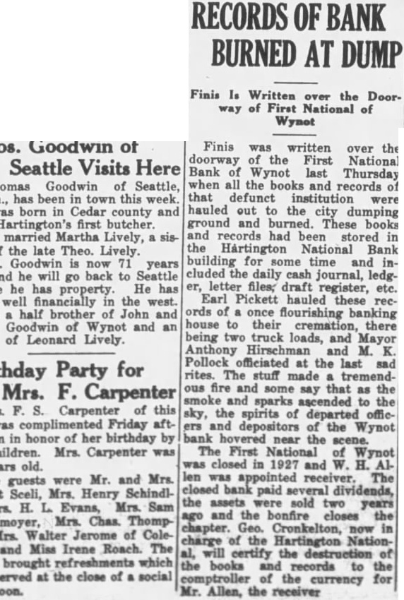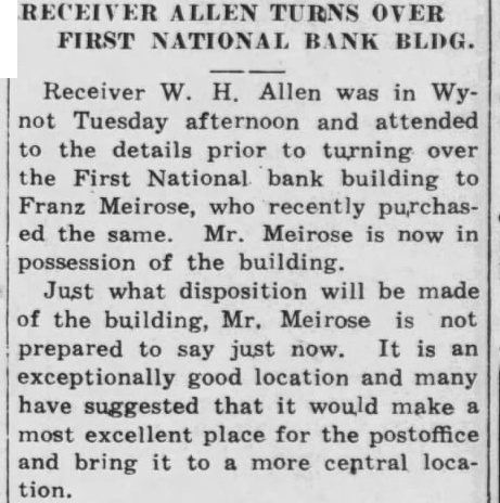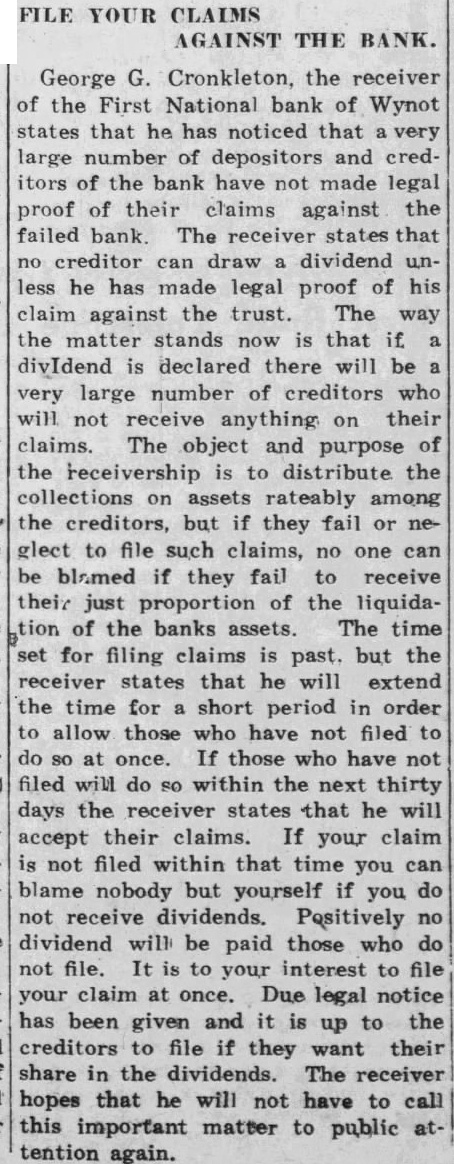 FILE YOUR CLAIMS AGAINST THE BANK. George G. Cronkleton, the receiver of the First National bank of Wynot states that he has noticed that a very large number of depositors and creditors of the bank have not made legal proof of their claims against the failed bank. The receiver states that no creditor can draw a dividend unless he has made legal proof of his claim against the trust. The way the matter stands now is that if a divIdend is declared there will be a very large number of creditors who will not receive anything on their claims. The object and purpose of the receivership is to distribute the collections on assets rateably among the creditors, but if they fail or neglect to file such claims, no one can be blamed if they fail to receive their just proportion of the liquidation of the banks assets. The time set for filing claims is past. but the receiver states that he will extend the time for a short period in order to allow those who have not filed to do so at once. If those who have not filed will do so within the next thirty days the receiver states that he will accept their claims. If your claim is not filed within that time you can blame nobody but yourself if you do not receive dividends. Positively no dividend will be paid those who do not file. It is to your interest to file your claim at once. Due legal notice has been given and it is up to the creditors to file if they want their share in the dividends. The receiver hopes that he will not have to call this important matter to public attention again.