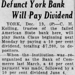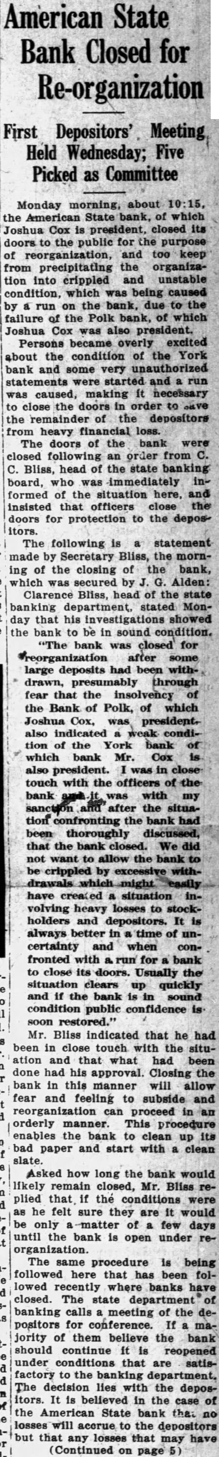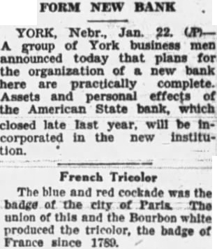 The state bank at Harrison has been reopened with the old officers in charge. Wild rumors started a run on this bank and it was closed by its officers to protect the assets. This shows just what will happen when gossip reflects on the credit of a bank. The Peoples State Bank, of Wolbach. opened Saturday morning. giving that city a banking institution again. Last night's papers carried an announcement that the American State Bank. of York, will reopen in a few days. All this is very "shows that although the legislature did not do all we expected regarding the banking situation they did pass some laws that are helping.