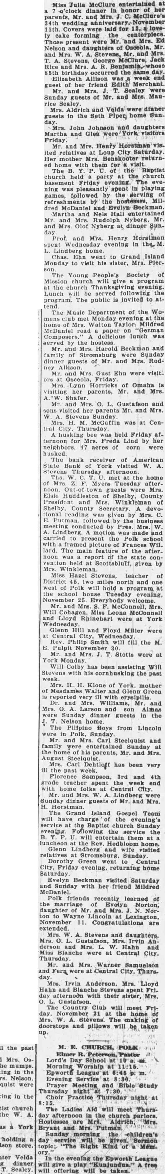 At the Wednesday evening meeting of the Evangelistic Campaign, at the Congregational church. large crowd was present. Rev. Ernest Horner, of Pleasant Dale, came the farthest distance. 37 miles. Jacob Schwaubauer brought the oldest type of car, a 1916 model. Ed Combs brought the largest delegation of 11. Miss Stockton presented the winners with a beautiful picture of "Christ in Gethsemane. Miss Gould gave her message in song, and Miss Stockton preached fine sermon.