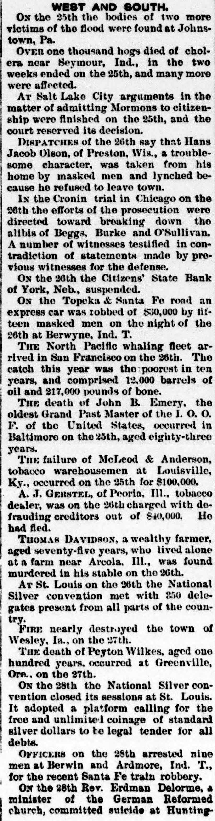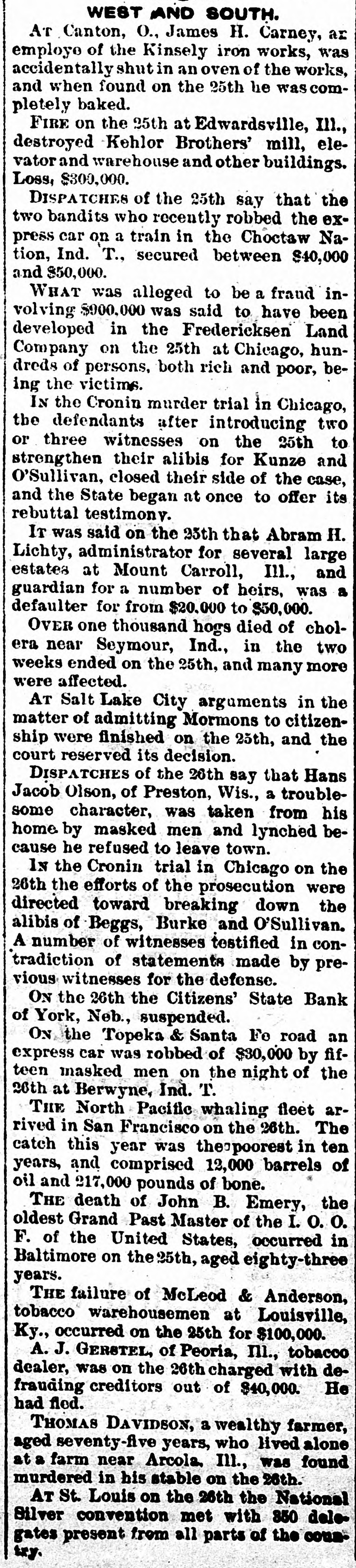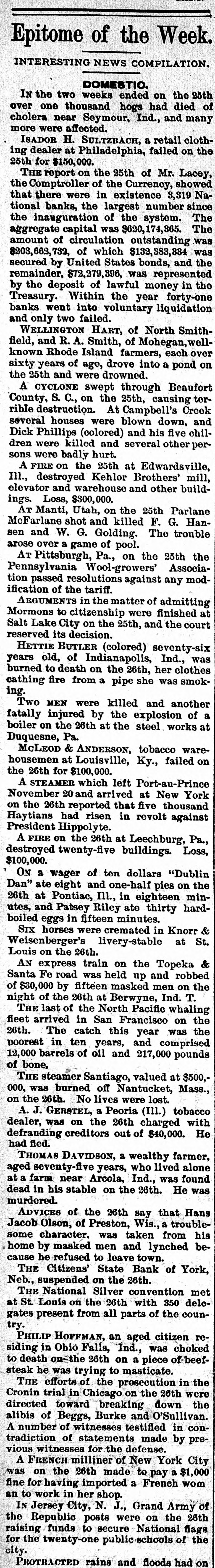 Epitome of the Week. INTERESTING NEWS COMPILATION. DOMESTIC. IN the two weeks ended on the 25th over one thousand hogs had died of cholera near Seymour, Ind., and many more were affected. ISADOR H. SULTZBACH, a retail clothing dealer at Philadelphia, failed on the 25th for $150,000. THE report on the 25th of Mr. Lacey, the Comptroller of the Currency, showed that there were in existence 3,319 National banks, the largest number since the inauguration of the system. The aggregate capital was $620,174,365. The amount of circulation outstanding was $203,663,732, of which $132,883,334 was secured by United States bonds, and the remainder, $72,379,396, was represented by the deposit of lawful money in the Treasury. Within the year forty-one banks went into voluntary liquidation and only two failed. WELLINGTON HART, of North Smithfield, and R. A. Smith, of Mohegan,wellknown Rhode Island farmers, each over sixty years of age, drove into a pond on the 25th and were drowned. A CYCLONE swept through Beaufort County, S. C., on the 25th, causing terrible destruction. At Campbell's Creek several houses were blown down, and Dick Phillips (colored) and his five children were killed and several other persons were badly hurt. A FIRE on the 25th at Edwardsville, Ill., destroyed Kehlor Brothers' mill, elevator and warehouse and other buildings. Loss, $300,000. AT Manti, Utah, on the 25th Parlane McFarlane shot and killed F. G. Hansen and W. G. Golding. The trouble arose over a game of pool. AT Pittsburgh, Pa., on the 25th the Pennsylvania Wool-growers' Association passed resolutions against any modification of the tariff. ARGUMENTS in the matter of admitting Mormons to citizenship were finished at Salt Lake City on the 25th, and the court reserved its decision. HETTIE BUTLER (colored) seventy-six years old, of Indianapolis, Ind., was burned to death on the 26th, her clothes cathing fire from a pipe she was smoking. Two MEN were killed and another fatally injured by the explosion of a boiler on the 26th at the steel works at Duquesne, Pa. McLEoD & ANDERSON, tobacco warehousemen at Louisville, Ky., failed on the 26th for $100,000. A STEAMER which left Port-au-Prince November 20 and arrived at New York on the 26th reported that five thousand Haytians had risen in revolt against President Hippolyte. A FIRE on the 26th at Leechburg, Pa., destroyed twenty-five buildings. Loss, $100,000. ON a wager of ten dollars "Dublin Dan" ate eight and one-half pies on the 26th at Pontiac, Ill., in eighteen minutes, and Patsey Riley ate thirty hardboiled eggs in fifteen minutes. Six horses were cremated in Knorr & Weisenberger's livery-stable at St. Louis on the 26th. AN express train on the Topeka & Santa Fe road was held up and robbed of $30,000 by fifteen masked men on the night of the 26th at Berwyne, Ind. T. THE last of the North Pacific whaling fleet arrived in San Francisco on the 26th. The catch this year was the poorest in ten years, and comprised 12,000 barrels of oil and 217,000 pounds of bone, THE steamer Santiago, valued at $500,000, was burned off Nantucket, Mass., on the 26th. No lives were lost. A. J. GERSTEL, a Peoria (Ill.) tobacco dealer, was on the 26th charged with defrauding creditors out of $40,000. He had fled. THOMAS DAVIDSON, a wealthy farmer, aged seventy-five years, who lived alone at a farm near Arcola, Ind., was found dead in his stable on the 26th. He was murdered. ADVICES of the 26th say that Hans Jacob Olson, of Preston, Wis., a troublesome character. was taken from his home by masked men and lynched because he refused to leave town. THE Citizens' State Bank of York, Neb., suspended on the 26th. THE National Silver convention met at St. Louis on the 26th with 350 delegates present from all parts of the country. PHILIP HOFFMAN, an aged citizen residing in Ohio Falls, Ind., was choked to death on the 26th on a piece of beefsteak he was trying to masticate. THE efforts of the prosecution in the Cronin trial in Chicago on the 26th were directed toward breaking down the alibis of Beggs, Burke and O'Sullivan. A number of witnesses testified in contradiction of statements made by previous witnesses for the defense. A FRENCH milliner of New York City was on the 26th made to pay a $1,000 fine for having imported a French wom an to work in her shop. IN Jersey City, N. J., Grand Army of the Republic posts were on the 26th raising funds to secure National flags for the twenty-one public-schools of the city.