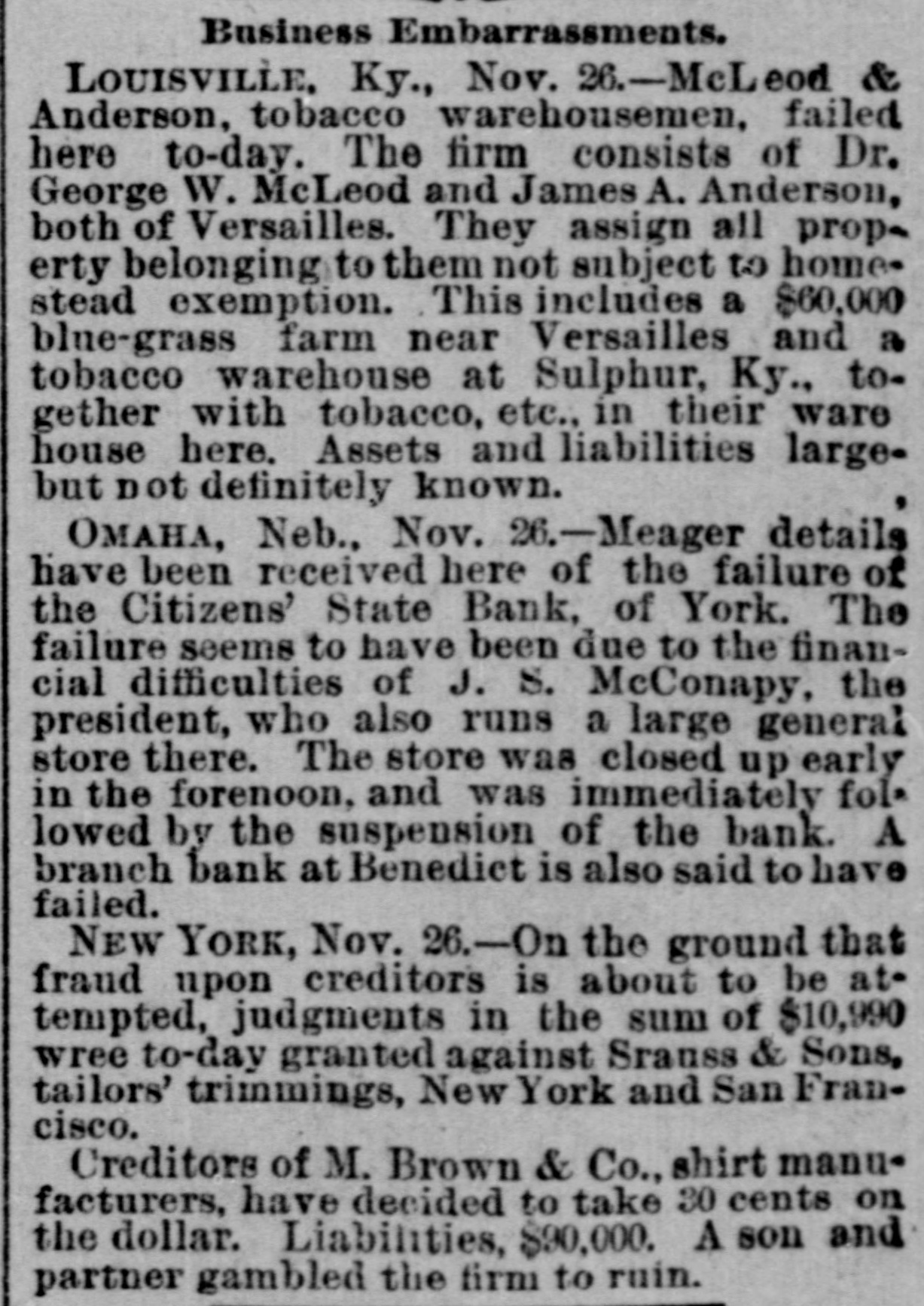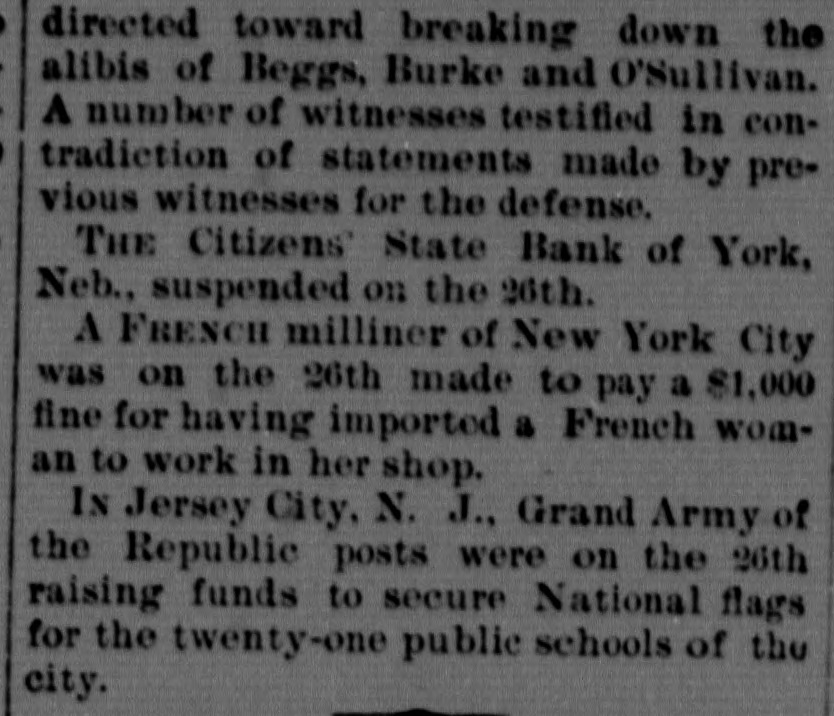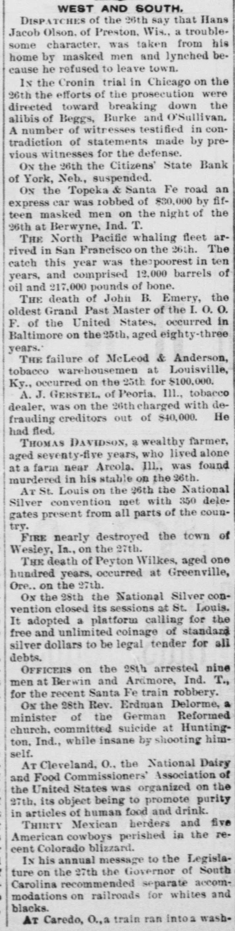 Epitome of the Week. INTERESTING NEWS COMPILATION. DOMESTIC. IN the two weeks ended on the 25th over one thousand hogs had died of cholera near Seymour, Ind., and many more were affected. ISADOR H. SULTZBACH, a retail clothing dealer at Philadelphia, failed on the 25th for $150,000. THE report on the 25th of Mr. Lacey, the Comptroller of the Currency, showed that there were in existence 3,319 National banks, the largest number since the inauguration of the system. The aggregate capital was $620,174,365. The amount of circulation outstanding was $203,663,732, of which $132,883,334 was secured by United States bonds, and the remainder, $72,379,396, was represented by the deposit of lawful money in the Treasury. Within the year forty-one banks went into voluntary liquidation and only two failed. WELLINGTON HART, of North Smithfield, and R. A. Smith, of Mohegan,wellknown Rhode Island farmers, each over sixty years of age, drove into a pond on the 25th and were drowned. A CYCLONE swept through Beaufort County, S. C., on the 25th, causing terrible destruction. At Campbell's Creek several houses were blown down, and Dick Phillips (colored) and his five children were killed and several other persons were badly hurt. A FIRE on the 25th at Edwardsville, Ill., destroyed Kehlor Brothers' mill, elevator and warehouse and other buildings. Loss, $300,000. AT Manti, Utah, on the 25th Parlane McFarlane shot and killed F. G. Hansen and W. G. Golding. The trouble arose over a game of pool. AT Pittsburgh, Pa., on the 25th the Pennsylvania Wool-growers' Association passed resolutions against any modification of the tariff. ARGUMENTS in the matter of admitting Mormons to citizenship were finished at Salt Lake City on the 25th, and the court reserved its decision. HETTIE BUTLER (colored) seventy-six years old, of Indianapolis, Ind., was burned to death on the 26th, her clothes cathing fire from a pipe she was smoking. Two MEN were killed and another fatally injured by the explosion of a boiler on the 26th at the steel works at Duquesne, Pa. McLEoD & ANDERSON, tobacco warehousemen at Louisville, Ky., failed on the 26th for $100,000. A STEAMER which left Port-au-Prince November 20 and arrived at New York on the 26th reported that five thousand Haytians had risen in revolt against President Hippolyte. A FIRE on the 26th at Leechburg, Pa., destroyed twenty-five buildings. Loss, $100,000. ON a wager of ten dollars "Dublin Dan" ate eight and one-half pies on the 26th at Pontiac, Ill., in eighteen minutes, and Patsey Riley ate thirty hardboiled eggs in fifteen minutes. Six horses were cremated in Knorr & Weisenberger's livery-stable at St. Louis on the 26th. AN express train on the Topeka & Santa Fe road was held up and robbed of $30,000 by fifteen masked men on the night of the 26th at Berwyne, Ind. T. THE last of the North Pacific whaling fleet arrived in San Francisco on the 26th. The catch this year was the poorest in ten years, and comprised 12,000 barrels of oil and 217,000 pounds of bone, THE steamer Santiago, valued at $500,000, was burned off Nantucket, Mass., on the 26th. No lives were lost. A. J. GERSTEL, a Peoria (Ill.) tobacco dealer, was on the 26th charged with defrauding creditors out of $40,000. He had fled. THOMAS DAVIDSON, a wealthy farmer, aged seventy-five years, who lived alone at a farm near Arcola, Ind., was found dead in his stable on the 26th. He was murdered. ADVICES of the 26th say that Hans Jacob Olson, of Preston, Wis., a troublesome character. was taken from his home by masked men and lynched because he refused to leave town. THE Citizens' State Bank of York, Neb., suspended on the 26th. THE National Silver convention met at St. Louis on the 26th with 350 delegates present from all parts of the country. PHILIP HOFFMAN, an aged citizen residing in Ohio Falls, Ind., was choked to death on the 26th on a piece of beefsteak he was trying to masticate. THE efforts of the prosecution in the Cronin trial in Chicago on the 26th were directed toward breaking down the alibis of Beggs, Burke and O'Sullivan. A number of witnesses testified in contradiction of statements made by previous witnesses for the defense. A FRENCH milliner of New York City was on the 26th made to pay a $1,000 fine for having imported a French wom an to work in her shop. IN Jersey City, N. J., Grand Army of the Republic posts were on the 26th raising funds to secure National flags for the twenty-one public-schools of the city.