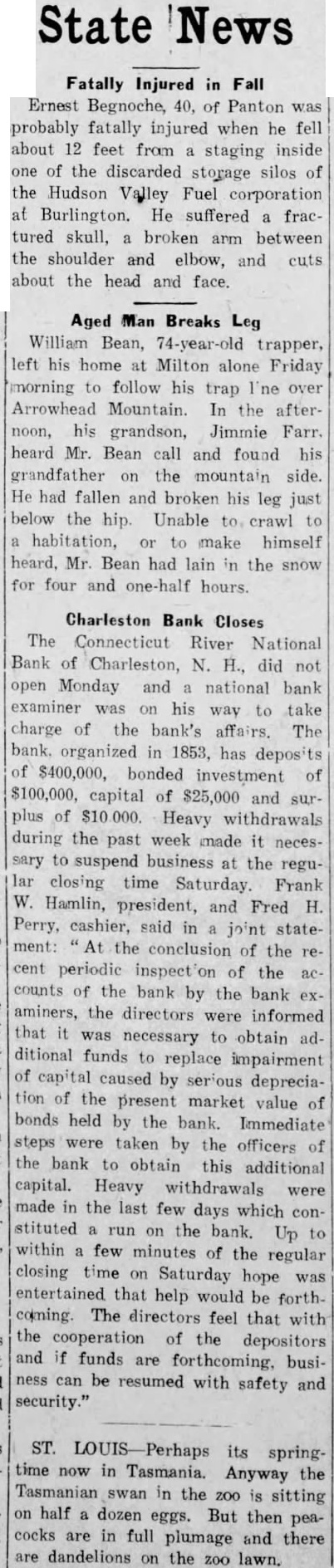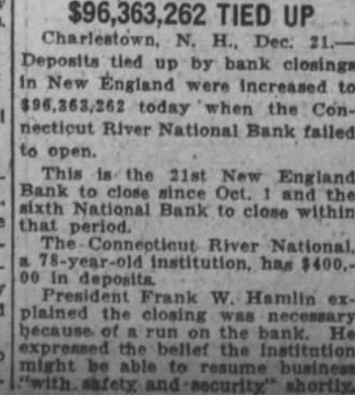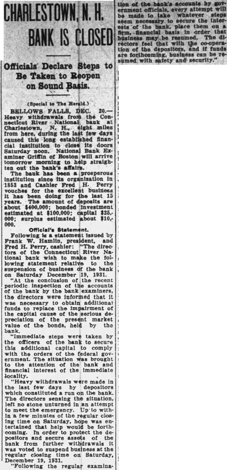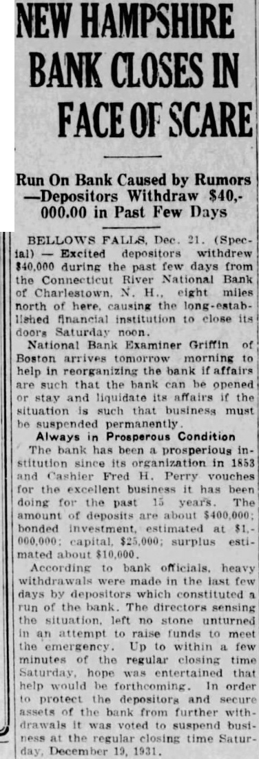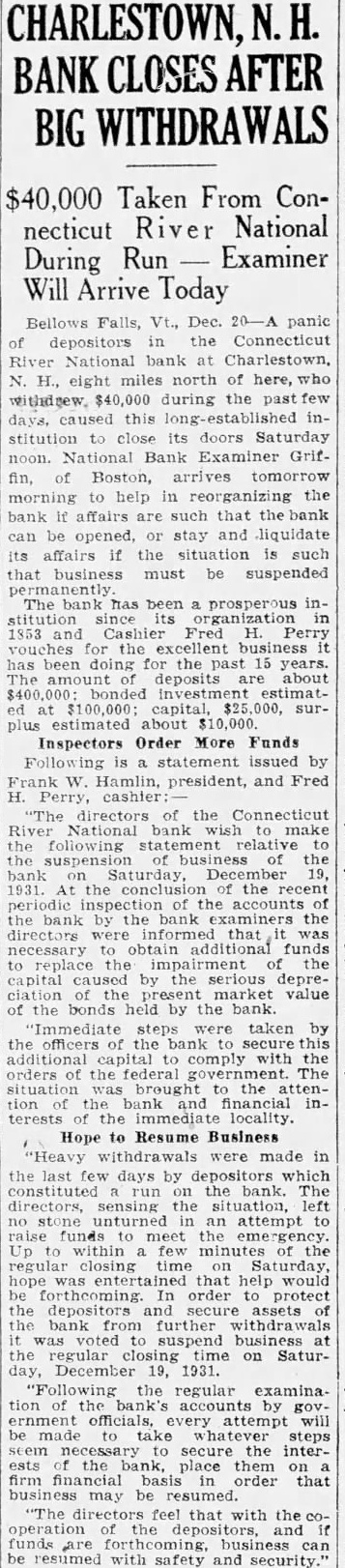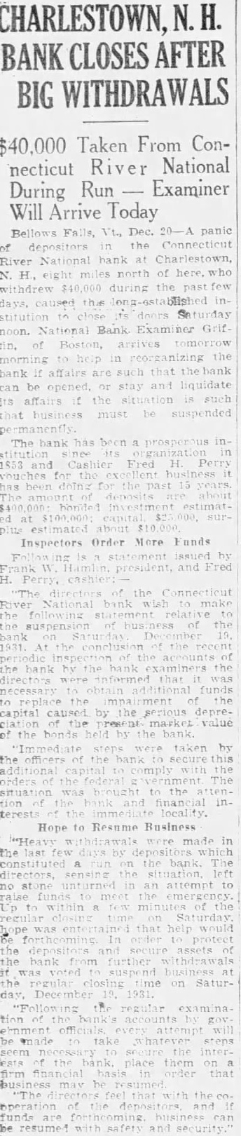 Bellows Falls, Dec. 20-A panic depositors the Connecticut River National bank at Charlestown, N. H., eight miles north of here, withdrew. $40,000 during the past this inits doors Saturday noon. Bank Examiner Griffin, of Boston, morning help in reorganizing the bank affairs such that the bank can be opened, stay and liquidate its affairs the situation such that business must suspended The bank has prosperous inorganization Cashier Fred has 15 years. deposits about bonded estimatcapital, surestimated about $10,000. Inspectors Order More Funds statement issued by Frank W. Hamlin, president, Fred Perry, directors of the Connecticut National bank make following statement the 1931. the periodic the the bank bank examiners the directors informed that necessary funds capital the serious ciation market value of the bonds held by the bank. "Immediate steps taken by the officers the bank secure capital comply with the orders the federal government. The brought locality. Hope Resume Business "Heavy were made in the last days by which the directors, the an attempt funds meet Up within minutes the regular closing Saturday that help would order protect the depositors the from further was suspend business at the regular closing time on SaturDecember 19, 1931. "Following the regular examinaaccounts ernment attempt steps the interplace them financial basis that may be resumed. "The feel that with operation funds business can be resumed with safety and security."