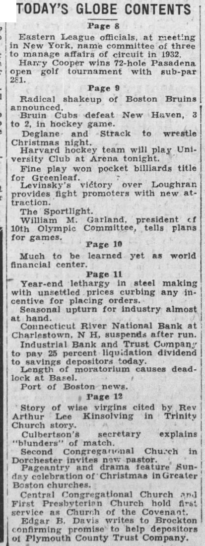 Page 11 Year-end lethargy steel making with unsettled prices curbing any incentive for placing orders. Seasonal upturn for industry almost Connecticut River National Bank at Charlestown, H. suspends after run. Industrial Bank and Trust Company pay 25 percent liquidation dividend savings depositors today. moratorium causes deadPort of Boston news. Page 12 Story of wise virgins cited by Rev Arthur Lee Kinsolving in Trinity Church story. Culbertson's secretary explains "blunders' match. Second Church in Dorchester invites new Pageantry and drama feature Sunday of Christmas in Greater Boston churches. Central Congregational Church and First hold first Church of the Edgar Davis writes to Brockton promise help depositors Plymouth County Trust Company.