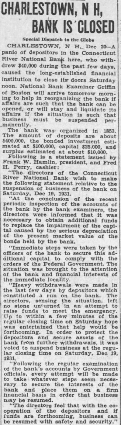 N H. 20-A panic of depositors the Connecticut River National Bank here, who withdrew $40,000 during the past days, caused the long-established financial institution to close its doors Saturday noon. National Bank Examiner Griffin of will arrive ing help the bank affairs such that the can opened, will stay and liquidate affairs the such that business must be suspended The bank was organized in 1853. deposits $400,000, investment estimated at capital $25,000, and surplus estimated about $10,000. statement issued by Frank W. Hamlin, president, and Fred Perry cashier: directors the Connecticut River National Bank wish to make the following statement to the suspension the bank on Saturday, Dec 1931. of the recent periodic the the bank by the bank examiners, the directors that was necessary to obtain funds replace the of the capicaused the market value of the bonds held by the bank. "Immediate steps taken by the officers of the bank to ditional comply with the orders the The situation brought the attention the bank and financial interests of the immediate locality withdrawals were made in the last days by run bank. airectors, sensing the left stone an attempt raise meet the Up within minutes of the closing Saturday was entertained that help would order to protect the secure assets bank voted lar closing time on Saturday, Dec 19, Following the regular examination the attempt will be made steps necessecure the interests of the bank place them financial basis order that business resumed. feel that with the cothe and funds are be resumed with safety and security.