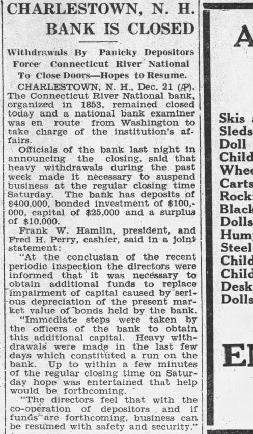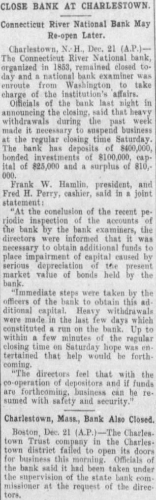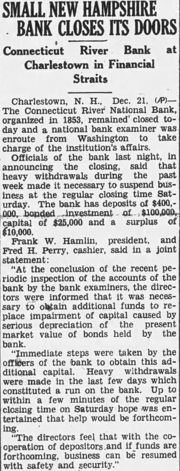 Charlestown, N. H., Dec. 21. The Connecticut River National Bank, organized in 1853, closed today and national bank was enroute from Washington to take charge of the institution's affairs. Officials of the bank last night, in the closing, said that announcing heavy withdrawals during the past week made it necessary suspend business at the regular closing time Saturday. The bank has deposits of $400,000, of $100,000, capital of $25,000 and surplus of $10,000. Frank W. Hamlin, president. and Fred H. Perry, cashier, said in joint statement: "At the conclusion of the recent periodic inspection of the accounts of the bank by the bank examiners, the directors were that was necessary to obtain funds to replace impairment of capital caused by serious depreciation the present market value of bonds held by the bank. "Immediate steps were taken by the officers of the bank to obtain this additional capital. Heavy withdrawals were made in the last few days which constituted run on the bank. Up to within few minutes of the regular closing time on Saturday hope was entertained that help would be forthcom"The directors feel that with the cooperation of depositors and funds are forthcoming, business can be resumed with safety and security.'