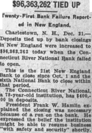 Charlestown, N. H., Dec. 21.Deposits tied up by bank closings in New England were increased to $96,363,262 today when the Connecticut River National Bank failed to open. This is the 21st New England Bank to close since Oct. and the sixth National Bank to close within that period. The Connecticut River National, 78-year-old institution, has $400,00 in deposits. President Frank W. Hamlin explained the closing was because on the bank. He expressed the belief the institution might be able to resume business "with safety and security" shortly.