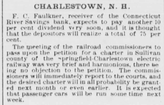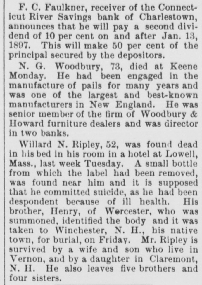 F. C. Faulkner, receiver of the Connecticut River Savings bank of Charlestown, announces that he will pay a second dividend of 10 per cent on and after Jan. 13, 1897. This will make 50 per cent of the principal secured by the depositors. N. G. Woodbury, 73, died at Keene Monday. He had been engaged in the manufacture of pails for many years and was one of the largest and best-known manufacturers in New England. He was senior member of the firm of Woodbury & Howard furniture dealers and was director in two banks. Willard N. Ripley, 52, was found dead in his bed in his room in a hotel at Lowell, Mass., last week Tuesday. A small bottle from which the label had been removed, was found near him and it is supposed that he committed suicide, as he had been despondent because of ill health. His brother, Henry, of Worcester, who was summoned, identified the body and it was taken to Winchester, N. H., his native town, for burial, on Friday. Mr. Ripley is survived by a wife and son who live in Vernon, and by a daughter in Claremont, N. H. He also leaves five brothers and four sisters.