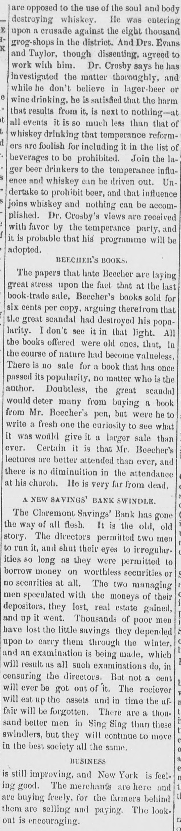 are opposed to the use of the soul and body destroying whiskey. He was entering E upon a crusade against the eight thousand Igrog-shops in the district. And Drs. Evans K and Taylor, though dissenting, agreed to work wich him. Dr. Crosby says he has investigated the matter thoroughly, and while he don't believe in lager-beer or wine drinking, he is satisfied that the harm that results from it, is next to nothing-at t all events it is so much less than that of whiskey drinking that temperance reformers are foolish for including it in the list of beverages to be prohibited. Join the lager beer drinkers to the temperance influence and whiskey can be driven out. Undertake to prohibit beer, and that influence joins whiskey and nothing can be accomplished. Dr. Crosby's views are received with favor by the temperance party, and it is probable that his programme will be adopted. BEECHER'S BOOKS. The papers that hate Beecher are laying great stress upon the fact that at the last book-trade sale, Beecher's books sold for six cents per copy, arguing therefrom that the great scandal had destroyed his popularity. I don't see it in that light. All the books offered were old ones, that, in the course of nature had become valueless. There is no sale for a book that has once passed its popularity, no matter who is the author. Doubtless, the great scandal would deter many from buying a book from Mr. Beecher's pen, but were he to write a fresh one the curiosity to see what it was would give it a larger sale than ever. Certain it is that Mr. Beecher's lectures are better attended than ever, and there is no diminuition in the attendance at his church. He is very far from dead. TO A NEW SAVINGS' BANK SWINDLE. The Claremont Savings' Bank has gone the way of all flesh. It is the old, old story. The directors permitted two men to run it, and shut their eyes to irregularities so long as they were permitted to borrow money on worthless securities or TO : no securities at all. The two managing men speculated with the moneys of their depositors, they lost, real estate gained, and up it went. Thousands of poor men S have lost the little savings they depended upon to carry them through the winter, and an examination is being made, which will result as all such examinations do, in censuring the directors. But not a cent will ever be got out of it. The reciever < will eat up the assets and in time the afIl t fair will be forgotten. There are a thousand better men in Sing Sing than these t swindlers, but they will continue to move c in the best society all the same. o BUSINESS is still improving, and New York is feeln t ing good. The merchants are here and tl are buying freely, for the farmers behind them are selling and paying. The lookn out is encouraging.
