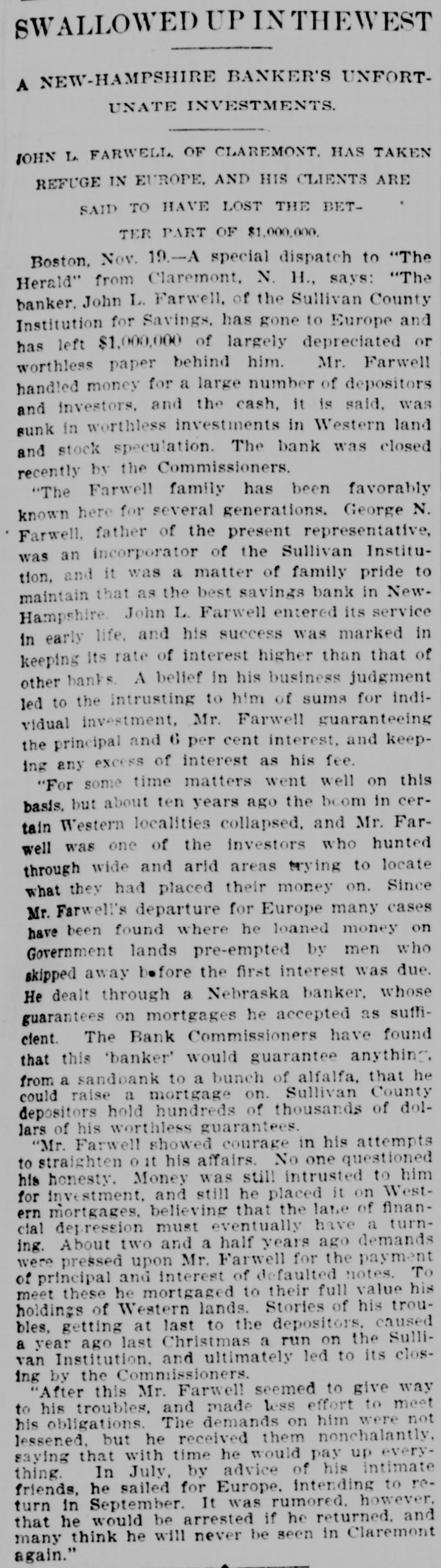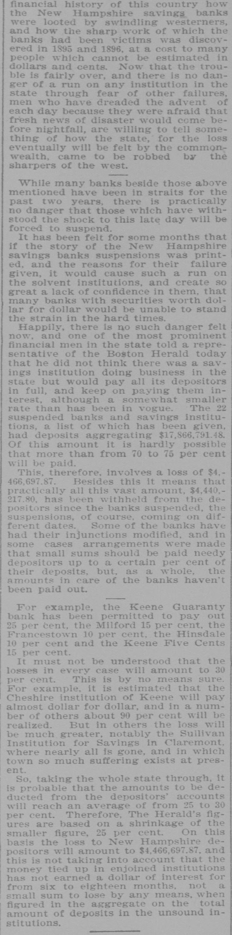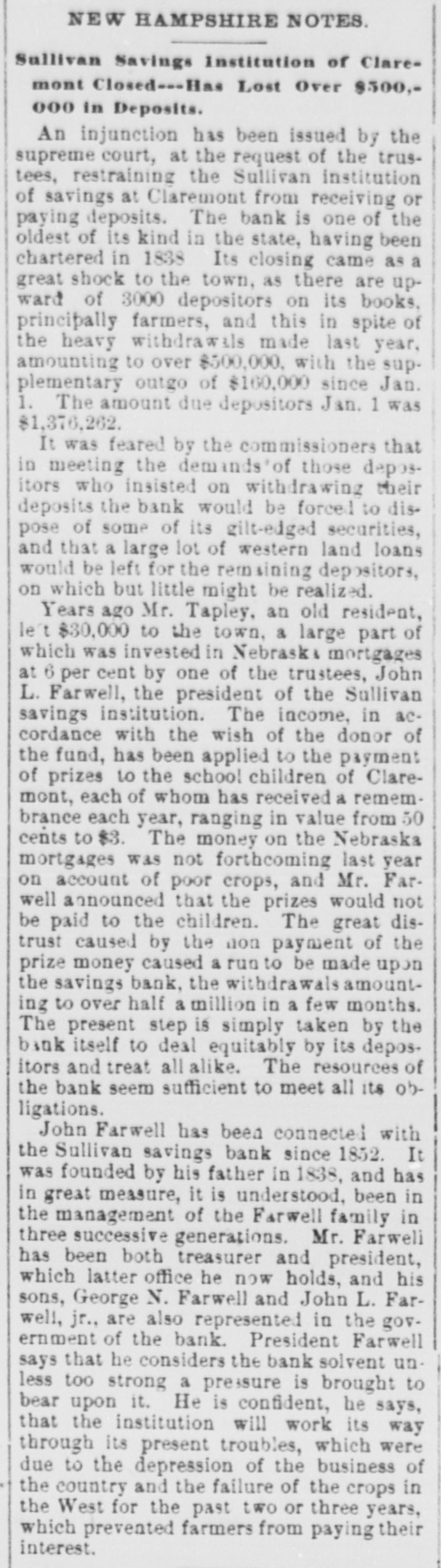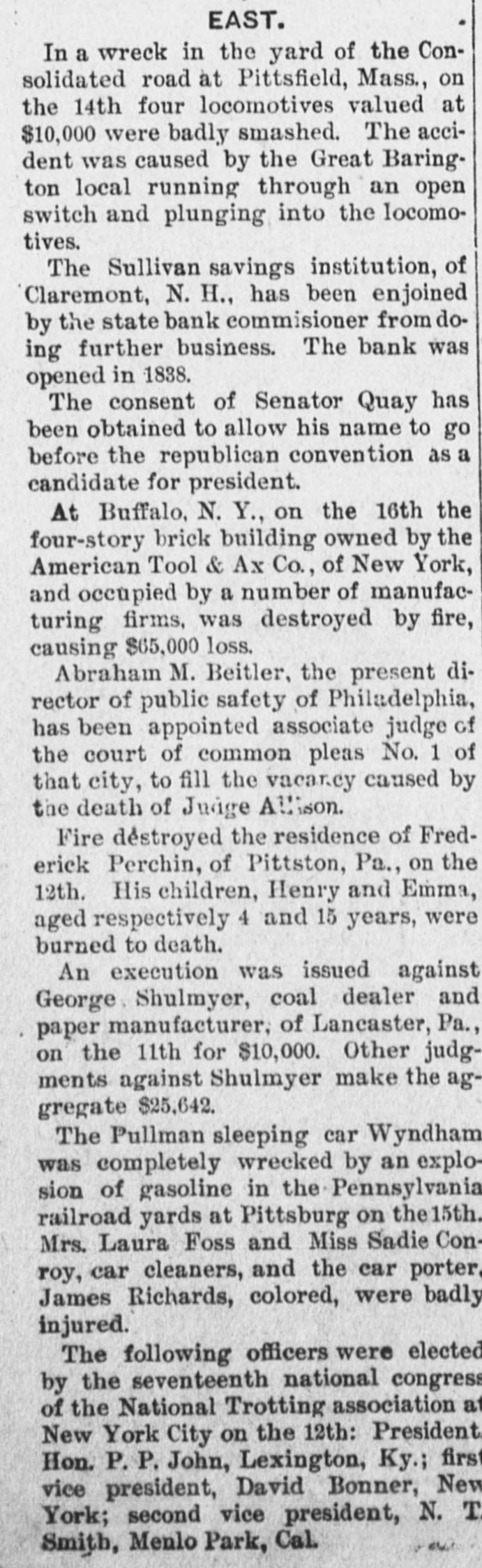 INTERNATION The White Hall, Mich., Savings Bank was closed on Saturday. A blizzard raged Sunday over most of Minnesota and the Dakotas. Polly Brannum died in Knoxville, Tenn.. on Sunday. aged 109 years. Major Edward Schofield was inaugurated Governor of Wisconsin Monday. The Citizens' National Bank of Fargo, N. D., was closed on Saturday. A receiver has been appointed for the Little Rock & Mississippi railroad. Cardinal Guglielmo Sanfelice di Acquavella, archbishop of Naples, died Sunday. The Sullivan Savings Institution of Claremont, N. H., has been placed in the hands of assigness. The Hotel Peermont, on Seven Mile Beach, N. J., was destroyed by fire Sunday. Loss, $25,000. The German Lutheran Church at New Bremen, O., was hurned on Friday night. Loss, $30,000. The statement that the Japanese are assisting the rebels in the Philippine Islands is officially denied. The borough of South Chester. Pa., is to be annexed to the city of Chester, making a city of 30,000 inhabitants. William Ridall, who built the first boat that ran on the old Pennsylvania canal, died at Wilkesbarre, Pa., Sunday. Commander Joshua Bishop and Assistant Engineer R. E. Carney have been placed on the retired list of the "RABU A fire in Montreal on Saturday damaged McFarlane & Co. 's wholesale stationery store to the extent of about Assistant Surgeon L. W. Atlee, U. S. N.. has been transferred from the Richmond to the Naval Hospital at Philadelphia. freight train on the Missouri Pacific railroad ran into a landslide near Holden. Mo., Sunday, and three of the crew were killed. The Western Paper Bag Co., of Northick "A" eqf jo euo "III Bataria, B 10 вравq eqf a! person REM Plants, receiver on Saturday. Thirteen miners were suffucated or ur ere B JO there B SB death 01 pearnq the Santa Gertrusi silver mine, at Pachuco, Mex., a few days ago. Thomas Bram, mate of the barkentine Herbert Fuller, was found guilty in Boston on Saturday of the murders committed on that vessel last July. According to a cablegram from Berlin. France and Russia have agreed to intervens to prevent a breach between the United States and Spain. A young man, supposed to have been Charles Scranton of Rochester. N. Y., was blown from a train at New Brunswick, N. J., on Saturday and killed. The H. Gibby and Boston & Lockport Block Co. s founderies, in East Boston, Mass were damaged by fire '000'0F$ Jo queixo eq: 01 Surriday do Senator Wolcott sailed from New York for Eugland on Saturday to confer with European bimetallists as to the prospects for an international conference. A fire in Nashville, Tenn., yesterday destroyed a number of large business houses on the public square. The total Insses, it is estimated, will reach 000'000$ The employes of the Illinois Steel Co. have been notified that their wages will be cut, on February let. There are 3,500 men employed at the South Chicago mills. The employes of all the mines in the Massillon, O., district, about B JO account no struch have 'new 000's reduction in the price of pick mining from 61 to 51 cents per ton. A traffic arrangement has been entered into between the Wheeling & Lake Erie railway and the Baltimore & Ohio, whereby the former company is to enter Cleveland over the latter line. Richmond's dry goods store, at Kingston, Ont., was burned on Saturday; loss, $60,000 to $70.000. The South Essex Preserving Co. factory, at Kingston, was also destroyed; loss, 000'00$ John A. Wood, a porter in a hotel at White River Junction, Vt., shut himSature- uo una tous B 9114 twice IIes day, and, failing to inflict a mortal wound, jumped from a fourth story window. Bella Smith, colored, killed her husband in New York Sunday by stabbing him in the neck with a pair of scissors. She claims that she acted in defence of her 6-years-old child and berrelf It is said that the California Congressional delegation has received assurances from Canton that if they can settle their factional differences the Golden State will receive a cabinet At Fonda, N. Y., on Saturday, two boys found the body of Lewis Erkenbrack, a wealthy farmer of Johnstown. on the bank of the Mobawk river. It is believed that Erkenbrack was murdered and robbed. Safe blowers started a fire in the "O N Charlotte eqs 10 Purpling Observer on Saturday night. It spread 80 rapidly that the men in the newspaper composing room barely had time to get out, losing their clothing