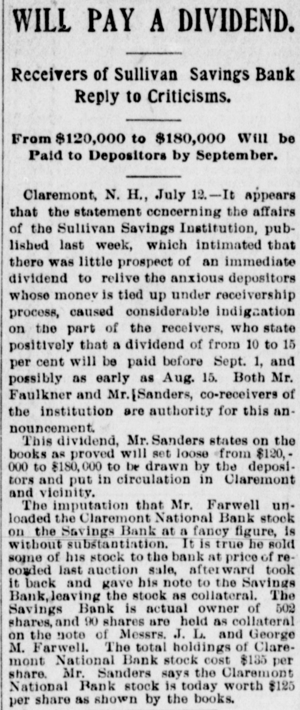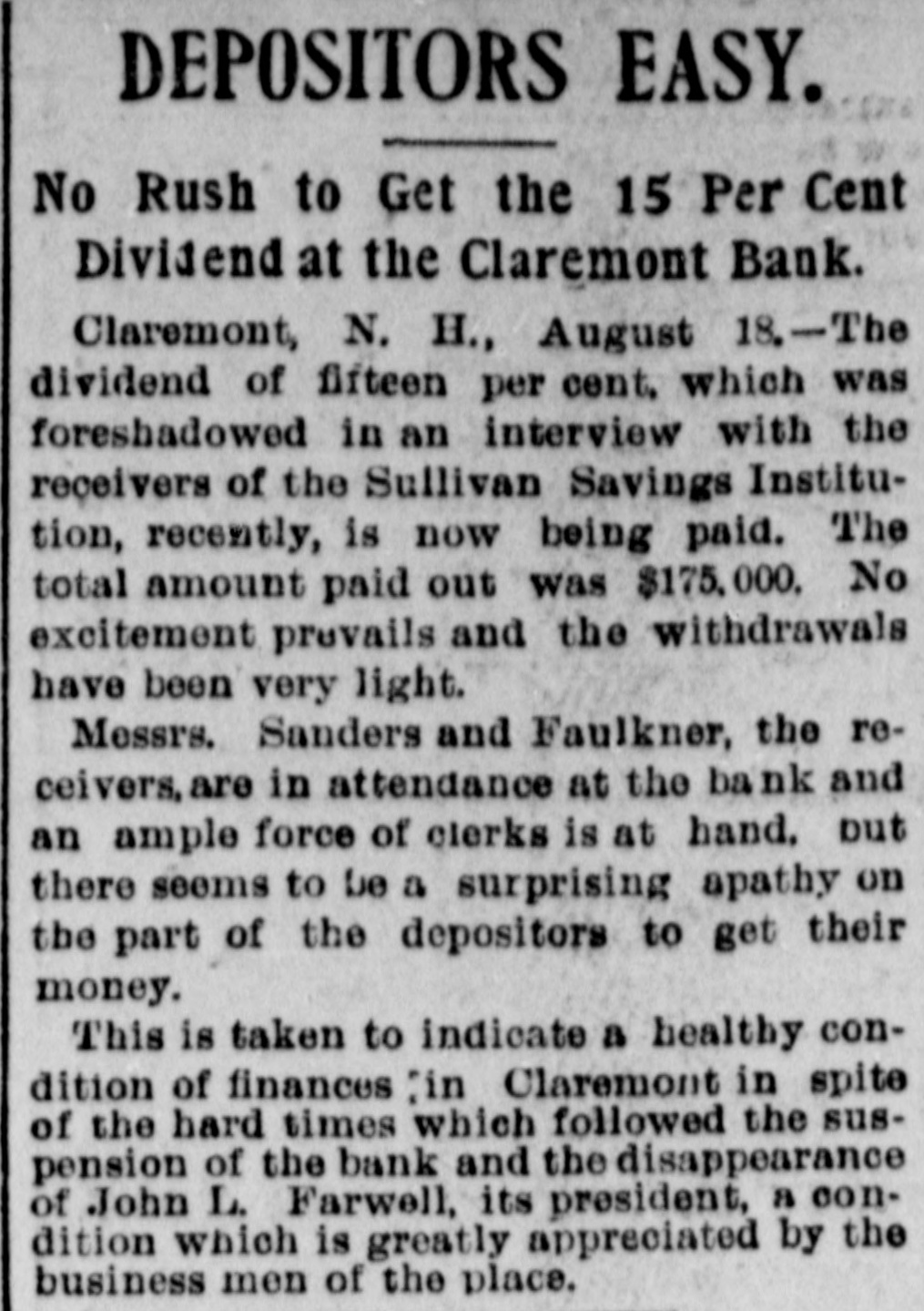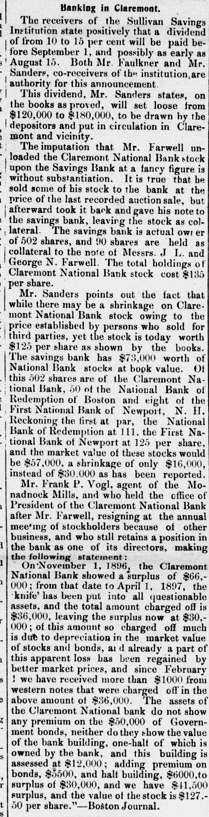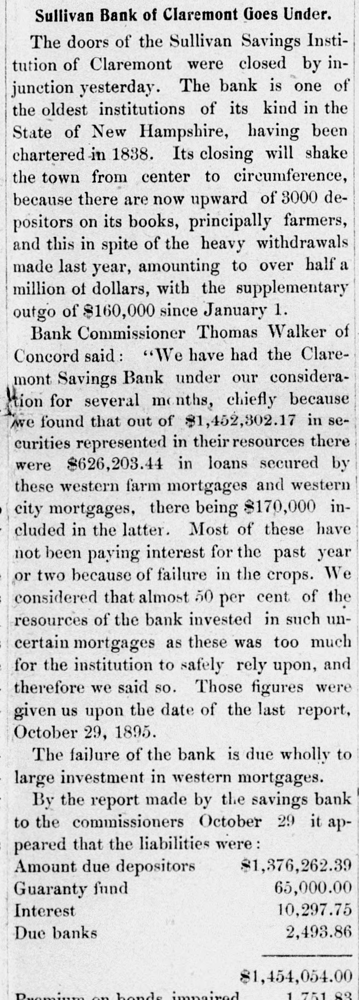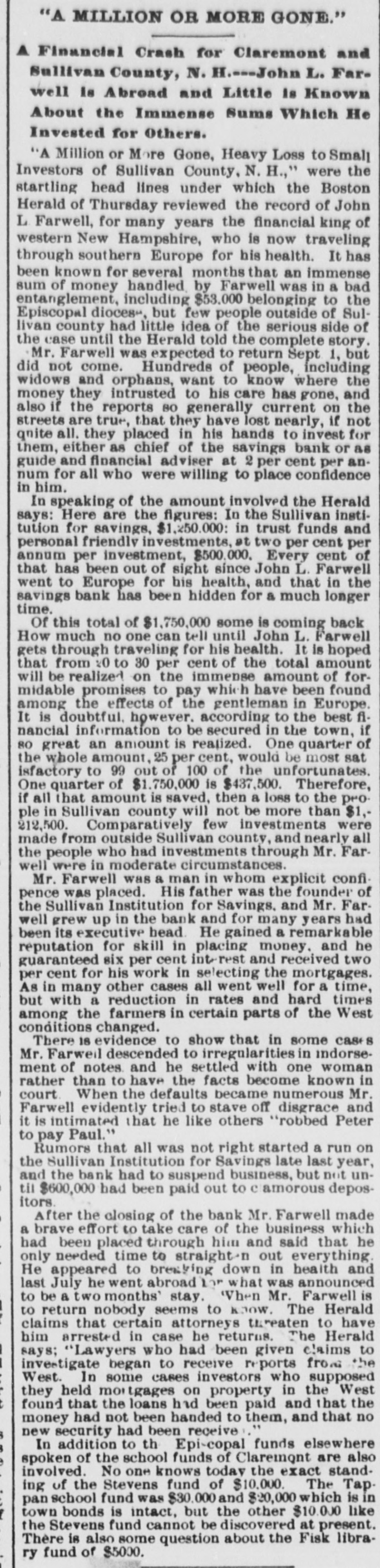 INTERNATION The White Hall, Mich., Savings Bank was closed on Saturday. A blizzard raged Sunday over most of Minnesota and the Dakotas. Polly Brannum died in Knoxville, Tenn.. on Sunday. aged 109 years. Major Edward Schofield was inaugurated Governor of Wisconsin Monday. The Citizens' National Bank of Fargo, N. D., was closed on Saturday. A receiver has been appointed for the Little Rock & Mississippi railroad. Cardinal Guglielmo Sanfelice di Acquavella, archbishop of Naples, died Sunday. The Sullivan Savings Institution of Claremont, N. H., has been placed in the hands of assigness. The Hotel Peermont, on Seven Mile Beach, N. J., was destroyed by fire Sunday. Loss, $25,000. The German Lutheran Church at New Bremen, O., was hurned on Friday night. Loss, $30,000. The statement that the Japanese are assisting the rebels in the Philippine Islands is officially denied. The borough of South Chester. Pa., is to be annexed to the city of Chester, making a city of 30,000 inhabitants. William Ridall, who built the first boat that ran on the old Pennsylvania canal, died at Wilkesbarre, Pa., Sunday. Commander Joshua Bishop and Assistant Engineer R. E. Carney have been placed on the retired list of the "RABU A fire in Montreal on Saturday damaged McFarlane & Co. 's wholesale stationery store to the extent of about Assistant Surgeon L. W. Atlee, U. S. N.. has been transferred from the Richmond to the Naval Hospital at Philadelphia. freight train on the Missouri Pacific railroad ran into a landslide near Holden. Mo., Sunday, and three of the crew were killed. The Western Paper Bag Co., of Northick "A" eqf jo euo "III Bataria, B 10 вравq eqf a! person REM Plants, receiver on Saturday. Thirteen miners were suffucated or ur ere B JO there B SB death 01 pearnq the Santa Gertrusi silver mine, at Pachuco, Mex., a few days ago. Thomas Bram, mate of the barkentine Herbert Fuller, was found guilty in Boston on Saturday of the murders committed on that vessel last July. According to a cablegram from Berlin. France and Russia have agreed to intervens to prevent a breach between the United States and Spain. A young man, supposed to have been Charles Scranton of Rochester. N. Y., was blown from a train at New Brunswick, N. J., on Saturday and killed. The H. Gibby and Boston & Lockport Block Co. s founderies, in East Boston, Mass were damaged by fire '000'0F$ Jo queixo eq: 01 Surriday do Senator Wolcott sailed from New York for Eugland on Saturday to confer with European bimetallists as to the prospects for an international conference. A fire in Nashville, Tenn., yesterday destroyed a number of large business houses on the public square. The total Insses, it is estimated, will reach 000'000$ The employes of the Illinois Steel Co. have been notified that their wages will be cut, on February let. There are 3,500 men employed at the South Chicago mills. The employes of all the mines in the Massillon, O., district, about B JO account no struch have 'new 000's reduction in the price of pick mining from 61 to 51 cents per ton. A traffic arrangement has been entered into between the Wheeling & Lake Erie railway and the Baltimore & Ohio, whereby the former company is to enter Cleveland over the latter line. Richmond's dry goods store, at Kingston, Ont., was burned on Saturday; loss, $60,000 to $70.000. The South Essex Preserving Co. factory, at Kingston, was also destroyed; loss, 000'00$ John A. Wood, a porter in a hotel at White River Junction, Vt., shut himSature- uo una tous B 9114 twice IIes day, and, failing to inflict a mortal wound, jumped from a fourth story window. Bella Smith, colored, killed her husband in New York Sunday by stabbing him in the neck with a pair of scissors. She claims that she acted in defence of her 6-years-old child and berrelf It is said that the California Congressional delegation has received assurances from Canton that if they can settle their factional differences the Golden State will receive a cabinet At Fonda, N. Y., on Saturday, two boys found the body of Lewis Erkenbrack, a wealthy farmer of Johnstown. on the bank of the Mobawk river. It is believed that Erkenbrack was murdered and robbed. Safe blowers started a fire in the "O N Charlotte eqs 10 Purpling Observer on Saturday night. It spread 80 rapidly that the men in the newspaper composing room barely had time to get out, losing their clothing