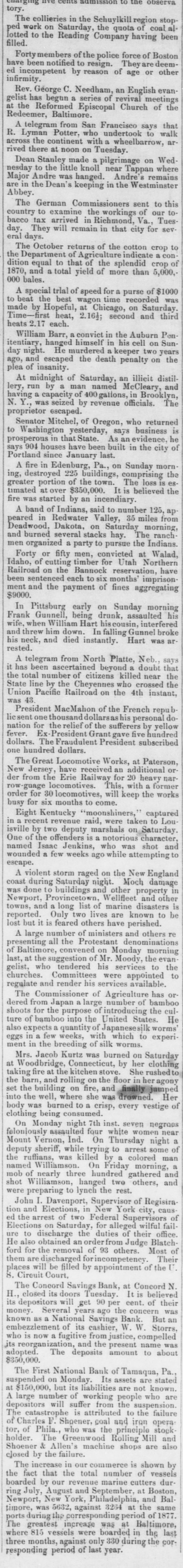observa tory. The collieries in the Schuylkill region stopped work on Saturday, the quota of coal alfilled. lotted to the Reading Company having been Forty members of the police force of Boston have been notified to resign. They are deemed incompetent by reason of age or other infirmity. Rev. George C. Needham, an English evan gelist has begun a series of revival meetings at the Reformed Episcopal Church of the Redeemer, Baltimore. A telegram from San Francisco says that R. Lyman Potter, who undertook to walk across the continent with a wheelbarrow, ar rived there at noon on Tuesday. Dean Stanley made a pilgrimage on Wed nesday to the little knoll near Tappan where Major Andre was hanged. Andre's remains are in the Dean's keeping in the Westminster Abbey. The German Commissioners sent to this country to examine the workings of our to bacco tax arrived in Richmond, Va., Tuesday. They will remain in that city for sev eral days. The October returns of the cotton crop to the Department of Agriculture indicate a con dition equal to that of the splendid crop of 1870, and a total yield of more than 5,000, 000 bales. A special trlal of speed for a purse of $1000 to beat the best wagon time recorded was made by Hopeful, at Chicago, on Saturday. Time-first heat, 2.164; second and third heats 2.17 each. William Barr, a convict in the Auburn Penitentiary, hanged himself in his cell on Sunday night. He murdered a keeper two years ago, and escaped the death penalty on the plea of insanity. At midnight of Saturday, an illieit distil lery, run by a man named McCleary, and having a capacity of gallons, in Brooklyn, N. Y., was seized by revenue officials. The proprietor escaped. Senator Mitchel, of Oregon, who returned to Washington yesterday, says business is prosperous in that State. As an evidence, he says 904 houses have been built in the city of Portland since January last. A fire in Edenburg, Pa., on Sunday morn ing, destroyed 225 buildings, comprising the greater portion of the town. The loss is estimated at over $350,000. It is believed the fire was started by an incendiary. A band of Indians, said to number 125, ap peared in Redwater Valley, 35 miles from Deadwood. Dakota, on Saturday morning, and burned several stacks hay. The ranch men organized a party to pursue the Indians. Forty or fifty men, convicted at Walad, Idaho, of cutting timber for Utah Northern Railroad on the Bannock reservation, have been sentenced each to six months imprison ment and the payment of fines aggregating $9000. In Pittsburg early on Sunday morning Frank Gunnell, being drunk, assaulted his wife, when William Hart hiscousin, interfered and threw him down. In falling Gunnel broke his neck, and died instantly. Hart was ar rested. A telegram from North Platte, Neb., says it has been ascertained beyond a doubt that the total number of citizens killed near the State line by the Cheyennes who crossed the Union Pacific Railroad on the 4th instant, was 43. President MacMahon of the French republicsent one thousand dollars personal donation for the relief of the sufferers by yellow fever. Ex President Grant gave five hundred dollars. The Fraudulent President subscribed one hundred dollars. The Great Locomotive Works, at Paterson, New Jersey, have received an additional or der from the Erie Railway for 20 heavy nar guage locomotives. This, with former order for 30 locomotives, will keep the works busy for six months to come. Eight Kentucky "moonshiners,' captured in a recent revenue raid, were taken to Lou isville by two deputy marshals n Saturday One of the offenders is a notorious character, named Isaac Jenkins, who was shot and wounded a few weeks ago while attempting to escape. A violent storm raged on the New England coast during Saturday night. Moch damage was done to buildings and other property in Newport, Provincetown Wellfleet and other towns. and a long list of marine disasters is reported. Only two lives are known to be lost but it is feared others have perished. A large number of ministers and others re presenting all the Protestant denominations of Baltimore, convened on Monday morning last, at the suggestion of Mr. Moody, the evan gelist, who tendered his services to the churches. Committees were appointed to regulate and render his services available. The Commissioner of Agriculture has or dered from Japan large number of bamboo shoots for the purpose of introducing the culture of bamboo into the United States. He also expects a quantity of Japanesesilk worms eggs in a few weeks, with which to experiment in the breeding of silk worms. Mrs. Jacob Kurtz was burned on Saturday at Woodbridge, Connecticut, by her clothing taking fire at the kitchen stove. She rushedto the barn, and rolling on the floor in her agony set the building on fire, and into the well, where she was drowned. Her body was burned to a crisp, every vestige of clothing being consumed. On Monday night 7th inst. seven negroes feloniously assaulted four white women near Mount Vernon, Ind. On Thursday night a deputy sheriff, while trying to arrest some of the ruffians, was killed by a colored man named Williamson. On Friday morning, a mob of nearly three hundred gathered and shot Williamson, hanged two others, and were preparing to lynch the rest. John I. Davenport, Supervisor of Registra tion and Elections, in New York city, caus ed the arrest of two Federal Supervisors of Elections on Saturday, for alleged wilful fail ure to discharge the duties of their office. He also obtained an order from Judge Blatch ford for the removal of 93 others. Most of them are discharged for incompetency. Their places will be filled by appointment of the U. 8. Circuit Court, The Concord Savings Bank, at Concord N H., closed its doors Tuesday. It is believed its depositors will get 90 per cent. of their money. Several years ago the concern was known as a National Savings Bank. But an embezziement of its cashier, W. W. Storrs. who is now a fugitive from justice, compelled 