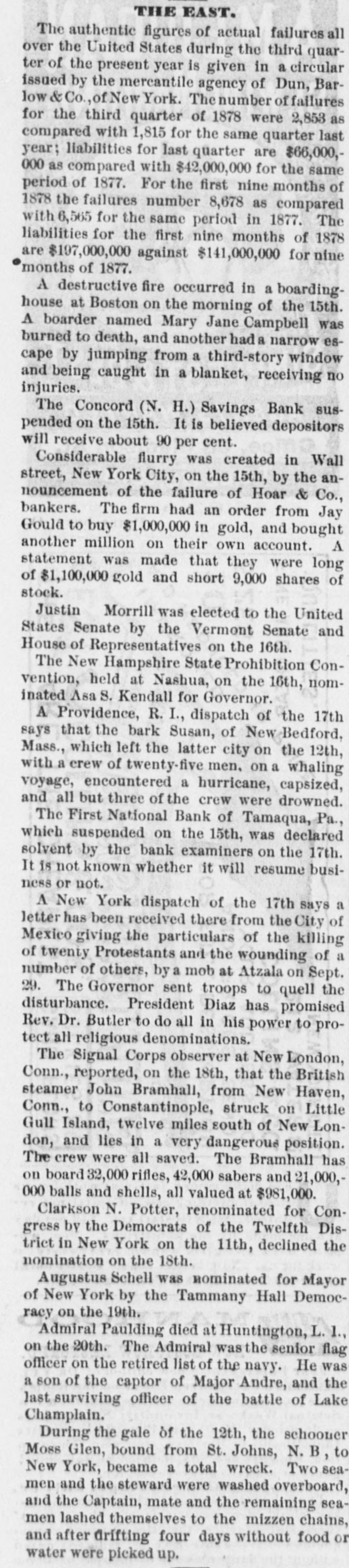 THE EAST. The authentic figures of actual failures all over the United States during the third quarter of the present year is given in a circular issued by the mercantile agency of Dun, Barlow&Co. of New York. The number of failures for the third quarter of 1878 were 2,853 as compared with 1,815 for the same quarter last year; liabilities for last quarter are $66,000,000 as compared with $42,000,000 for the same period of 1877. For the first nine months of 1878 the failures number 8,678 as compared 6,565 for the same period in 1877. The liabilities for the first nine months of 1878 are $197,000,000 against $141,000,000 for nine months of 1877. A destructive fire occurred in a boardinghouse at Boston on the morning of the 15th. A boarder named Mary Jane Campbell was burned to death, and another had a narrow escape by jumping from a third-story window and being caught in a blanket, receiving no injuries. The Concord (N. H.) Savings Bank suspended on the 15th. It is believed depositors will receive about 90 per cent. Considerable flurry was created in Wall street, New York City, on the 15th, by the announcement of the failure of Hoar & Co., bankers. The firm had an order from Jay Gould to buy $1,000,000 in gold, and bought another million on their own account. A statement was made that they were long of $1,100,000 gold and short 9,000 shares of stock. Justin Morrill was elected to the United States Senate by the Vermont Senate and House of Representatives on the 16th. The New Hampshire State Prohibition Convention, held at Nashua, on the 16th, nominated Asa S. Kendall for Governor. A Providence, R. I., dispatch of the 17th says that the bark Susan, of New Bedford, Mass., which left the latter city on the 12th, with a crew of twenty-five men, on a whaling voyage, encountered a hurricane, capsized, and all but three of the crew were drowned. The First National Bank of Tamaqua, Pa., which suspended on the 15th, was declared solvent by the bank examiners on the 17th. It is not known whether it will resume business or not. A New York dispatch of the 17th says a letter has been received there from the City of the particulars of the Mexico twenty giving Protestants killing of and the wounding of a number of others, by a mob at Atzala on Sept. 29. The Governor sent troops to quell the disturbance. President Diaz has promised Rev. Dr. Butler to do all in his power to protect all religious denominations. The Signal Corps observer at New London, Conn., reported, on the 18th, that the British steamer John Bramhall, from New Haven, Conn., to Constantinople, struck on Little Gull Island, twelve miles south of New London, and lies in a very dangerous position. The crew were all saved. The Bramhall has on board 32,000 rifles, 42,000 sabers and 21,000,000 balls and shells, all valued at $981,000. Clarkson N. Potter, renominated for Congress by the Democrats of the Twelfth District in New York on the 11th, declined the nomination on the 18th. Augustus Schell was nominated for Mayor of New York by the Tammany Hall Democracy on the 19th. Admiral Paulding died at Huntington, L. 1. on the 20th. The Admiral was the senior flag officer on the retired list of the navy. He was a son of the captor of Major Andre, and the last surviving officer of the battle of Lake Champlain. During the gale of the 12th, the schooner Moss Glen, bound from St. Johns, .B, to New York, became a total wreck. Two seamen and the steward were washed overboard, and the Captain, mate and the remaining sea men lashed themselves to the mizzen chains, and after drifting four days without food or water were picked up.