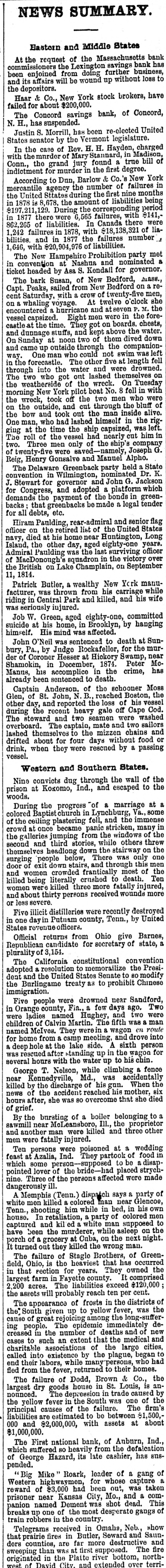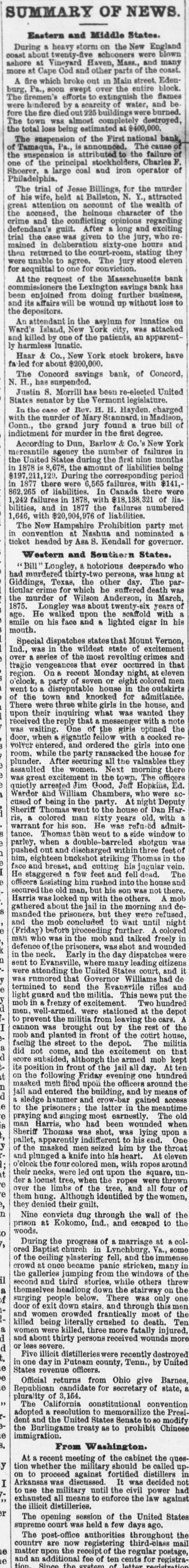 SUMMARY OF NEWS. Eastern and Middle States. During a heavy storm on the New England coast about twenty-five schooners were blown ashore at Vineyard Haven, Mass., and many more at Cape Cod and other parts of the coast. A fire which broke out in Main street. Edenburg, Pa., soon swept over the entire block. The firemen's efforts to extinguish the flames were hindered by scarcity of water, and be fore the fire died out 225 buildings were burned. The town was almost completely destroyed, the total loss being estimated at $400,000. The suspension of the First national bank, of Tamaqua, Pa., is announced. The cause the suspension is attributed to the failure of one of the principal stockholders, Charles F. Shoerer, Philadelphia. large coal and iron operator of The trial of Jesse Billings, for the murder of his wife, held at Ballston, N. Y., attracted great attention on account of the wealth of the accused, the heinous character of the crime and the conflicting opinions regarding defendant's guilt. After & long and exciting trial the case was given to the jury, who re mained in deliberation sixty-one hours and then returned to the court-room, stating they were unable to agree. The jury stood eleven for acquittal to one for conviction. At the request of the Massachusetts bank commissioners the Lexington savings bank has been enjoined from doing further business, and its affairs will be wound up without loss to the depositors. An attendant in the asylum for lunatics on Ward's Island, New York city, was attacked and killed by one of the patients, an apparently harmless lunatic. Haar & Co., New York stock brokers, have fa led for about $200,000. The Concord savings bank, of Concord, N. H., has suspended. Justin S. Morrill has been re-elected United States senator by the Vermont legislature. In the case of Rev. H. H. Hayden. charged with the murder of Mary Stannard. in Madison, Conn., the grand jury found a true bill of indictment for murder in the first degree. According to Dun, Barlow & Co. New York mercantile agency the number of failures in the United States during the first nine months in 1878 is 8,678, the amount of liabilities being $197,211,129. During the corresponding period in 1877 there were 6,565 failures, with $141,862, 265 of liabilities. In Canada there were 1,242 failures in 1878, with $18,138,321 of Jiabilities, and in 1877 the failures numbered 1,646, with $20,904,976 of liabilities. The New Hampshire Prohibition party met in convention at Nashua and nominated & ticket headed by Asa S. Kendall for governor. Western and Southern States. " Bill Longley, a hotorious desperado who had murdered thirty-two persons, was hung at Giddings, Texas, the other day. The particular crime for which he suffered death was the murder of Wilson Anderson, in March, 1875. Longley was about twenty-six years of age. He walked upon the scaffold with a smile mouth. on his face and 8 lighted cigar in his Special dispatches states that Mount Vernon, Ind., was in the wildest state of excitement over a series of the most revolting crimes and tragic vengeances that ever occurred in that region On a recent Monday night, at eleven o'clock, a party of seven or eight colored men went to a disreputable house in the outskirts of the town and knocked for admittance. There were three white girls in the house, and upon their inquiring what was wanted they received the reply that messenger with note was waiting. One of the girls opened the door, when signatic fellow with a cocked reVolver entered, and ordered the girls into one room, while the party ransacked the house for plunder. After securing all the valuables they assaulted the women. Next morning there was great excitement in the town. The officers quietly arrested Jim Good, Jeff Hopkins, Ed. Warder and William Chambers, who were accused of being in the party. At night Deputy Sheriff Thomas went to the house of Dan Harris, a colored man sixty years old, with a warrant for his son. He was refu od admittance. Thomas then went to a side window to parley, when a double-barreled shotgun was pushed out and discharged within three feet of him, eighteen buckshot striking Thomas in the face and breast, and outting his Jugular vein. He staggered a faw feet and fell dead. The officers Assisting him rushed into the house and secured the old man, but his son was not there. Harris was locked up with the others. A mob gathered about the jail in the morning and demanded the prisoners, but they were refused, and the mob concluded to wait until night (Friday) before proceeding further. A colored man who was in the mob and talked freely in defence of the prisoners, was shot and wounded in the neck. Early in the day dispatches were sent to Evansville, where many leading citizens were attending the United States court, and was rumored that Governor Williams had de it termined to send the Evansville rifles and light guard and the militia. This news put the mob in frenzy of excitement Two hundred men, well-armed. were stationed at the depot to prevent the militia from leaving the cars. cannon was brought out by the rest of the A mob and planted in front of the court house, facing the street to the depot. The militia did not come, and the excitement on that its score subsided, although the armed mob kept position in front of the jail all day. At ten on the following Friday evening one hundred masked mon fired upon the officers around the jail and entered the building, and by means of 8 sledge hammer and crow-bar gained access to the prisoners; the latter in the meantime praying and singing most earnestly. The old man Harris, who had been wounded when Sheriff Thomas was shot, was lying upon a pallet, apparently indifferent to his end. One of the masked men seized him by the throat and plunged knife into his heart. At eleven o'clock the four colored men, with ropes around their necks, were led out upon the square, under a locust tree, when the ropes were thrown over the limbs of the tree, an