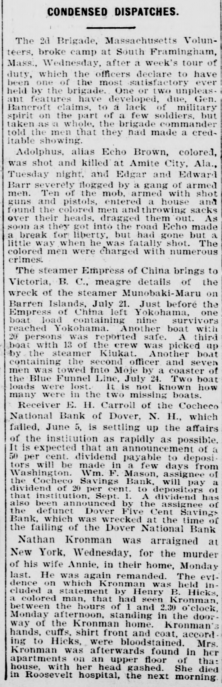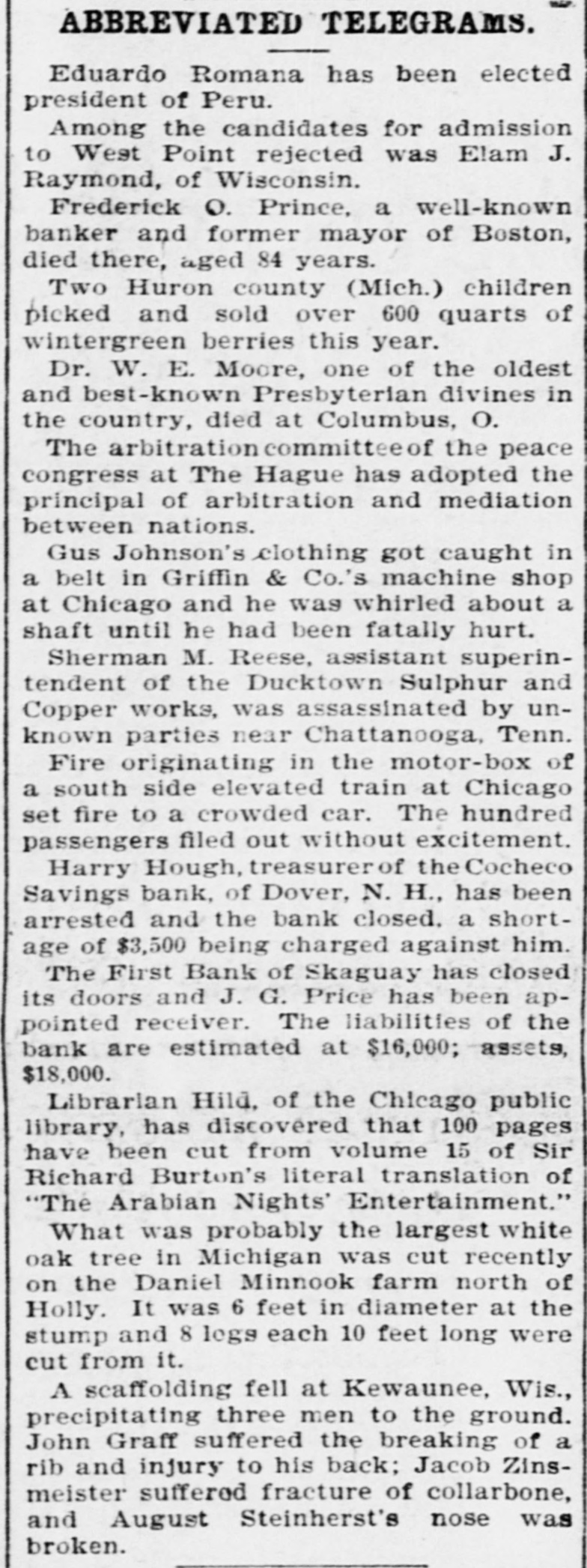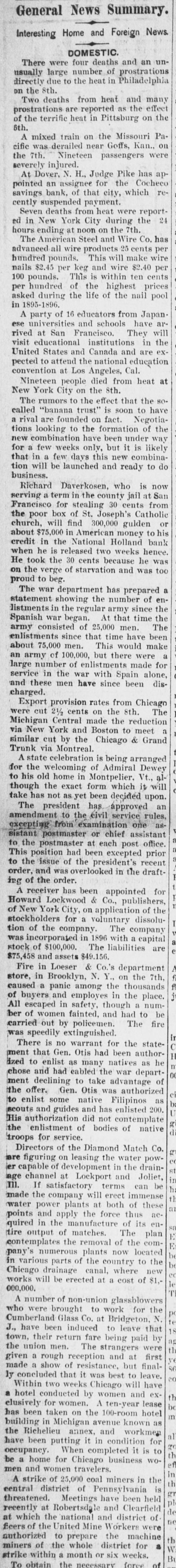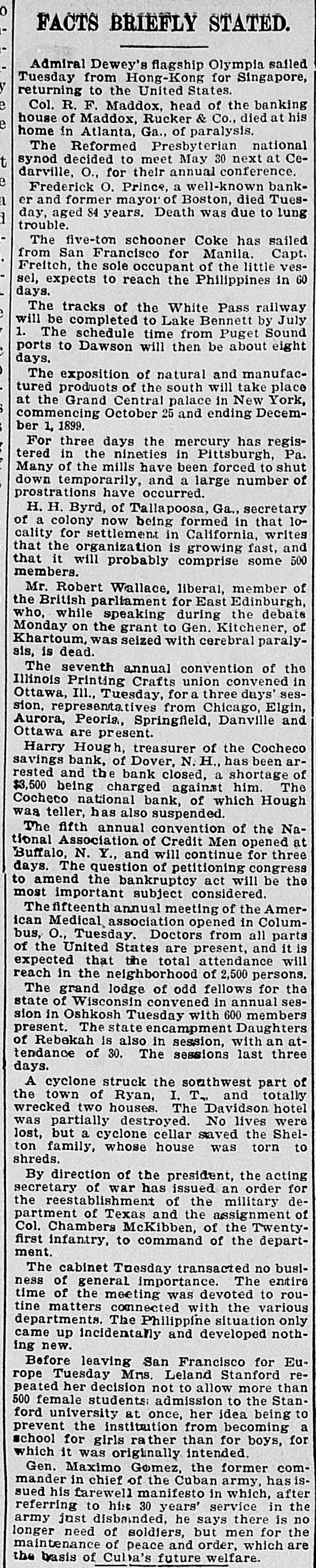 FACTS BRIEFLY STATED. Admiral Dewey's flagship Olympia sailed Tuesday from Hong-Kong for Singapore returning to the United States. Col. R. F. Maddox, head of the banking house of Maddox, Rucker & Co., died at his home in Atlanta, Ga., of paralysis. The Reformed Presbyterian nationa synod decided to meet May 30 next at Ce t darville, O., for their annual conference. Frederick O. Prince, a well-known bank er and former mayor of Boston, died Tues day, aged 84 years. Death was due to lung trouble. The five-ton schooner Coke has saile from San Francisco for Manila. Capt Freitch, the sole occupant of the little ves sel, expects to reach the Philippines in 6 days. The tracks of the White Pass railway will be completed to Lake Bennett by July 1. The schedule time from Puget Sound ports to Dawson will then be about eight days. The exposition of natural and manufac tured products of the south will take place at the Grand Central palace in New York commencing October 25 and ending December 1, 1899. For three days the mercury has regis tered in the nineties in Pittsburgh, Pa Many of the mills have been forced to shut down temporarily, and a large number of prostrations have occurred. H. H. Byrd, of Tallapoosa, Ga., secretary of a colony now being formed in that lo cality for settlement in California, write that the organization is growing fast, and that it will probably comprise some 50 members. Mr. Robert Wallace, liberal, member of the British parliament for East Edinburgh who, while speaking during the debate Monday on the grant to Gen. Kitchener, of Khartoum, was seized with cerebral paraly sis, is dead. The seventh annual convention of the Illinois Printing Crafts union convened in Ottawa, Ill., Tuesday, for a three days' ses sion, representatives from Chicago, Elgin Aurora, Peoria, Springfield, Danville and Ottawa are present. Harry Hough, treasurer of the Cocheco savings bank, of Dover, N. H., has been arrested and the bank closed, a shortage of $3,500 being charged against him. The Cocheco national bank, of which Hough was teller, has also suspended. The fifth annual convention of the Na tional Association of Credit Men opened a Buffalo, N. Y., and will continue for three days. The question of petitioning congress to amend the bankruptcy act will be the most important subject considered. The fifteenth annual meeting of the Amer ican Medical association opened in Colum bus, O., Tuesday. Doctors from all parts of the United States are present, and it is expected that the total attendance will reach in the neighborhood of 2,500 persons The grand lodge of odd fellows for the state of Wisconsin convened in annual ses sion in Oshkosh Tuesday with 600 members present. The state encampment Daughters of Rebekah is also in session, with an at tendance of 30. The sessions last three days. A cyclone struck the southwest part o the town of Ryan, I. T., and totally wrecked two houses. The Davidson hote was partially destroyed. No lives were lost, but a cyclone cellar staved the Shel ton family, whose house was torn to shreds. By direction of the president, the acting secretary of war has issued an order for the reestablishment of the military de partment of Texas and the assignment o Col. Chambers McKibben, of the Twenty first infantry, to command of the depart ment. The cabinet Tuesday transacted no busi