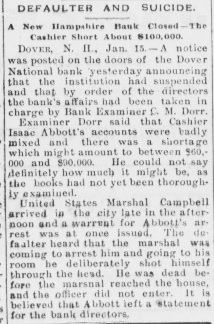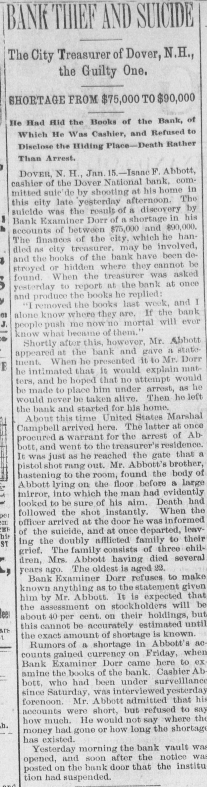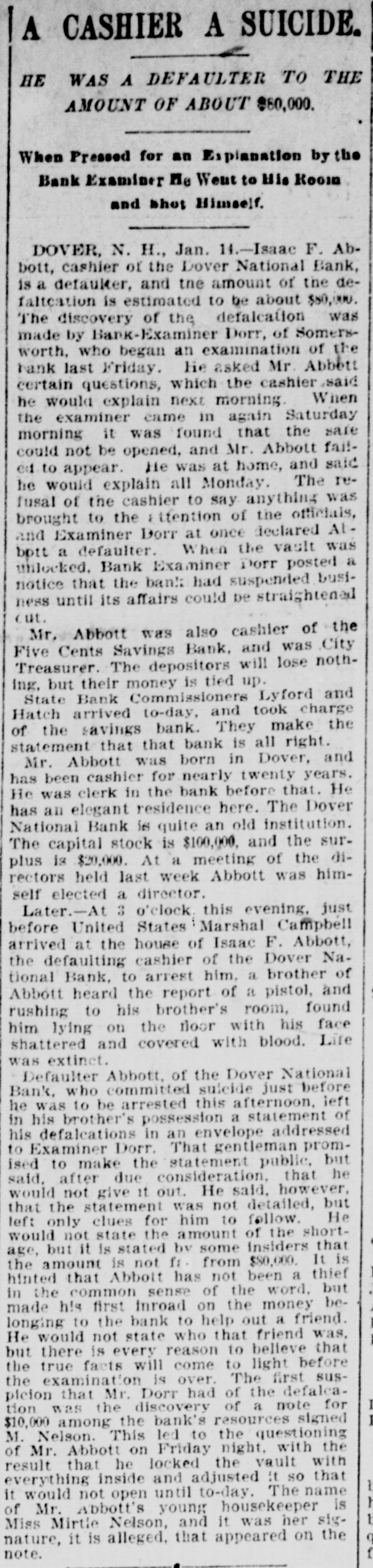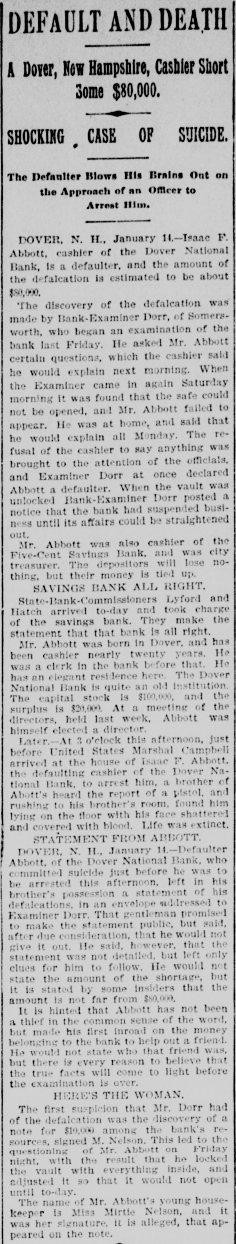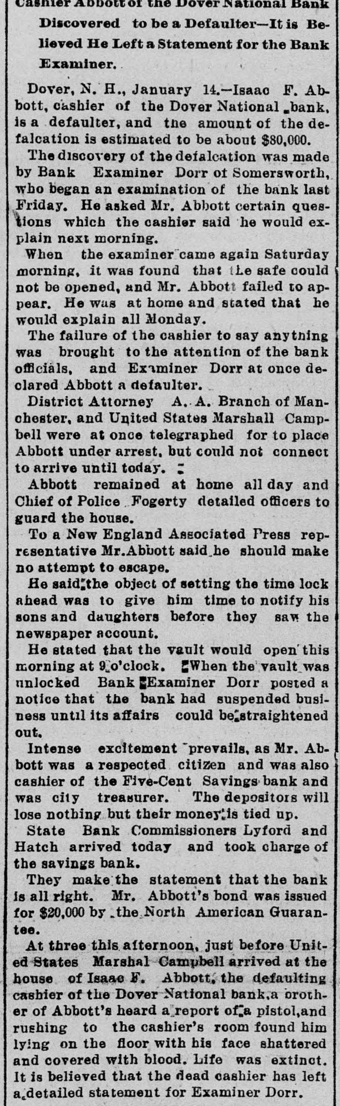 Cashier Dover National Bank Discovered to be a Defaulter-It is Believed He Left a Statement for the Bank Examiner. Dover, N. H., January 14.-Isaac F. Abbott, cashier of the Dover National "bank, is a defaulter, and the amount of the defalcation is estimated to be about $80,000. The discovery of the defalcation was made by Bank Examiner Dorr of Somersworth, who began an examination of the bank last Friday. He asked Mr. Abbott certain questions which the cashier said he would explain next morning. When the examiner came again Saturday morning, it was found that the safe could not be opened, and Mr. Abbott failed to appear. He was at home and stated that he would explain all Monday. The failure of the cashier to say anything was brought to the attention of the bank officials, and Examiner Dorr at once declared Abbott a defaulter. District Attorney A. A. Branch of Manchester, and United States Marshall Campbell were at once telegraphed for to place Abbott under arrest, but could not connect to arrive until today. = Abbott remained at home all day and Chief of Police Fogerty detailed officers to guard the house. To a New England Associated Press representative Mr.Abbott said he should make no attempt to escape. He said"the object of setting the time lock ahead was to give him time to notify his sons and daughters before they saw the newspaper account. He stated that the vault would open this morning at 9.o'clock. =When the vault was unlocked Bank Examiner Doir posted a notice that the bank had suspended business until its affairs could be'straightened out. Intense excitement `prevails, as Mr. Abbott was a respected citizen and was also cashier of the Five-Cent Savings bank and was city treasurer. The depositors will lose nothing but their money'is tied up. State Bank Commissioners Lyford and Hatch arrived today and took charge of the savings bank. They make the statement that the bank is all right. Mr. Abbott's bond was issued for $20,000 by the North American Guarantee. At three this afternoon, just before United States Marshal Camubell arrived at the house of Isaac F. Abbott. the defaulting cashier of the Dover National bank,a orother of Abbott's heard a report ofa pistol,and rushing to the cashier's room found him lying on the floor with his face shattered and covered with blood. Life was extinct. It is believed that the dead cashier has left a.detailed statement for Examiner Dorr.