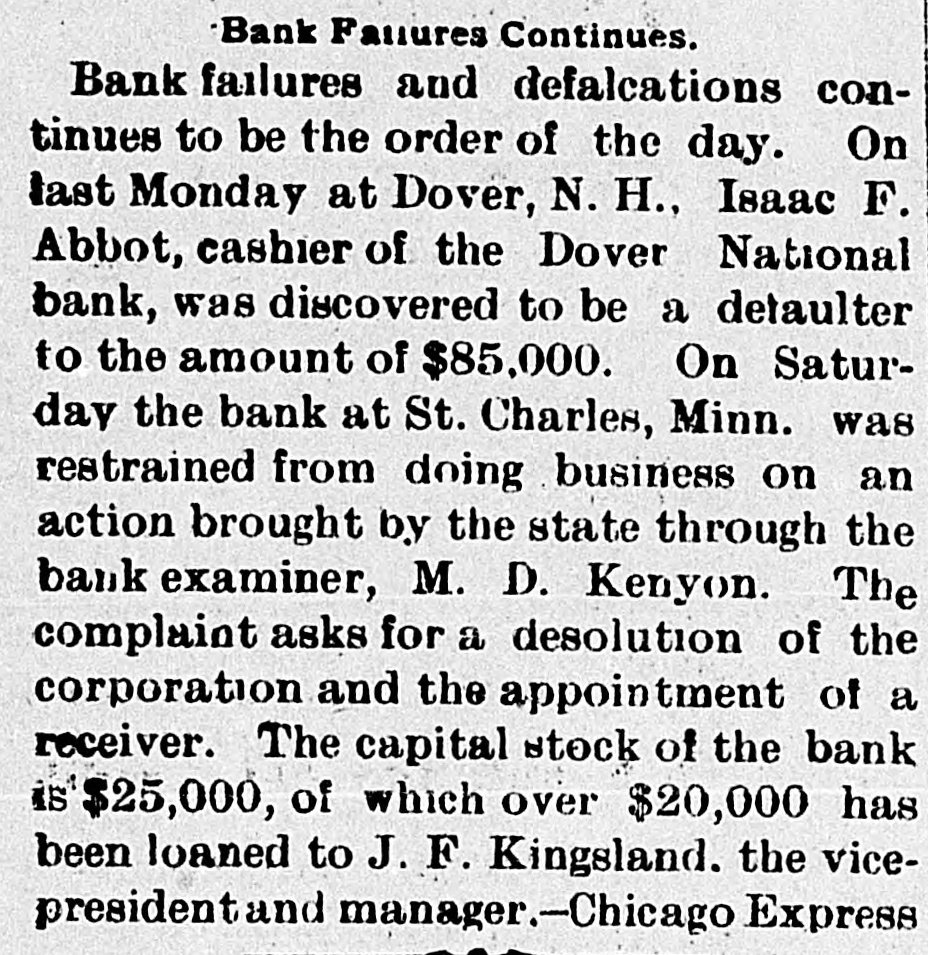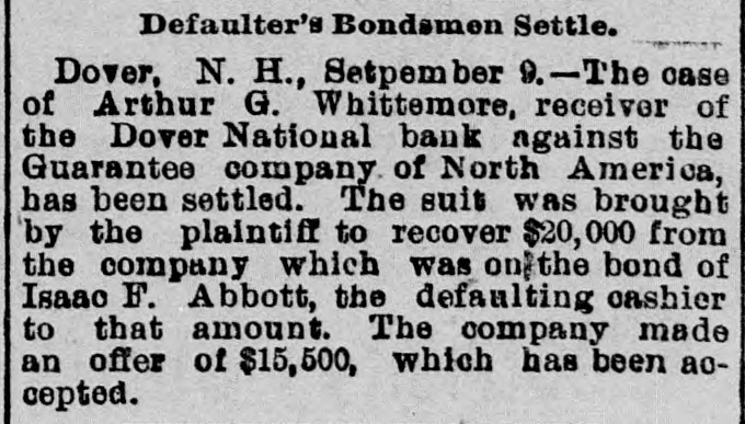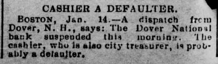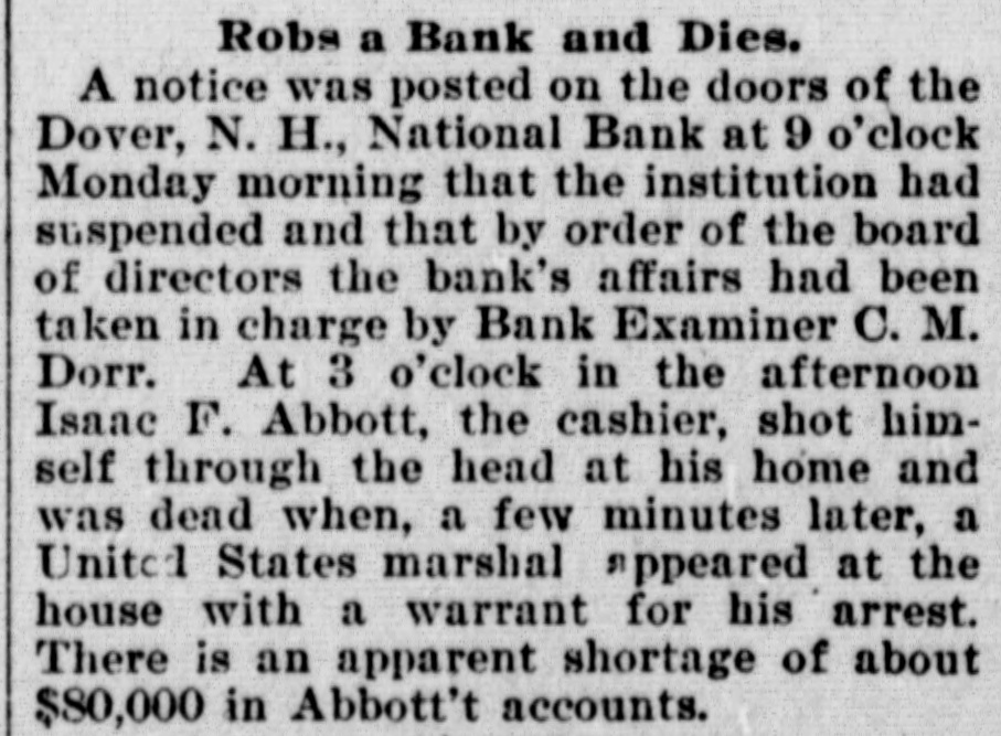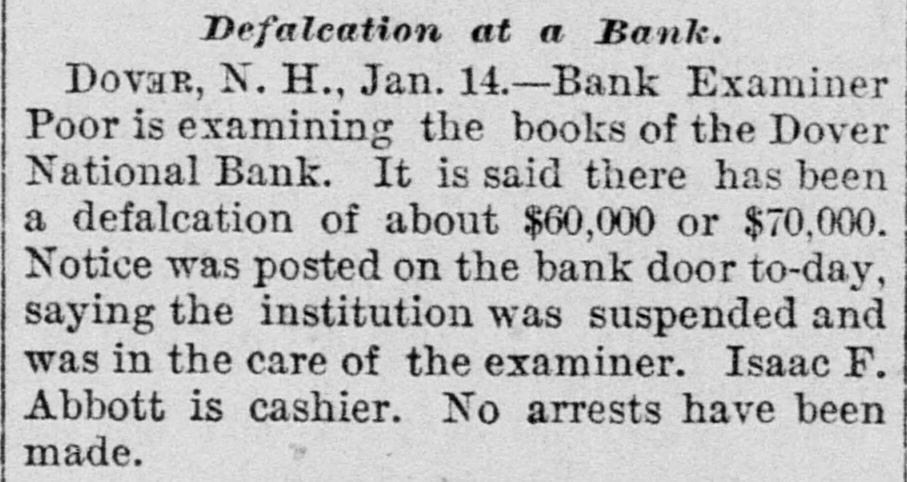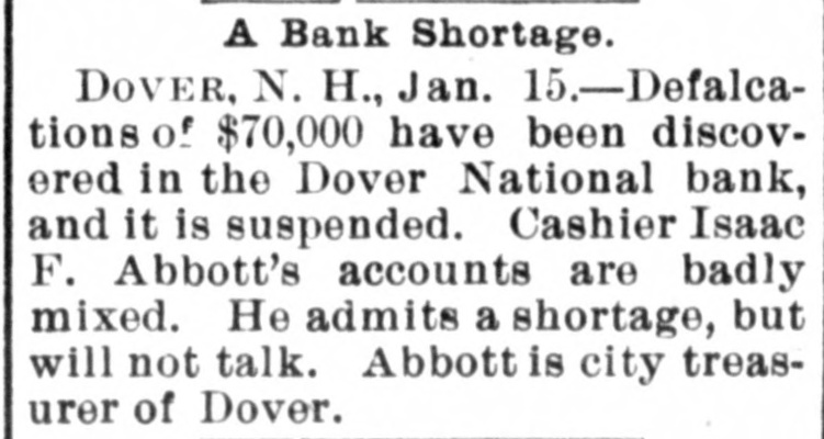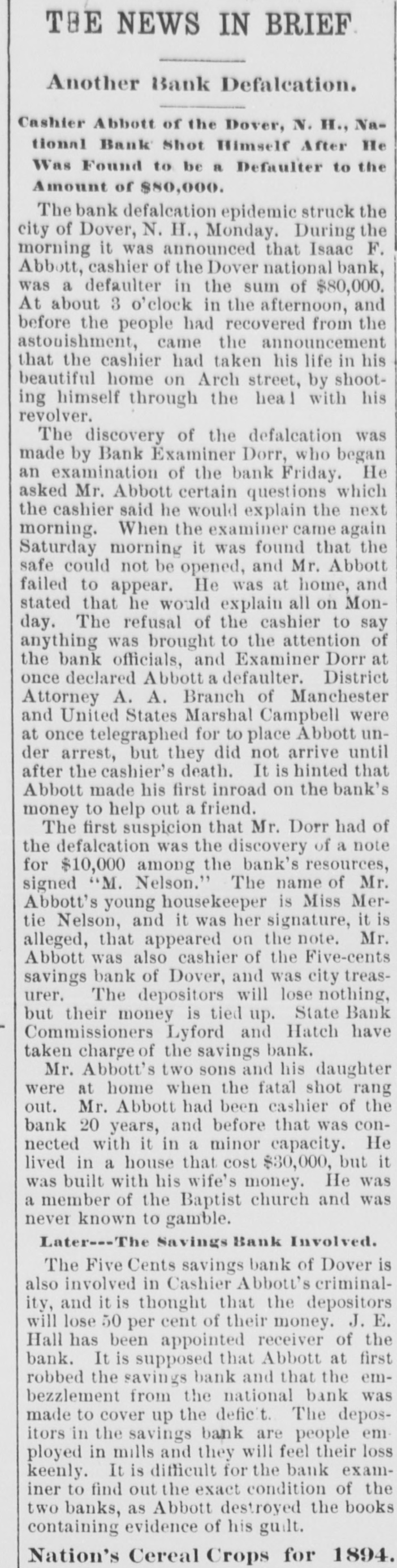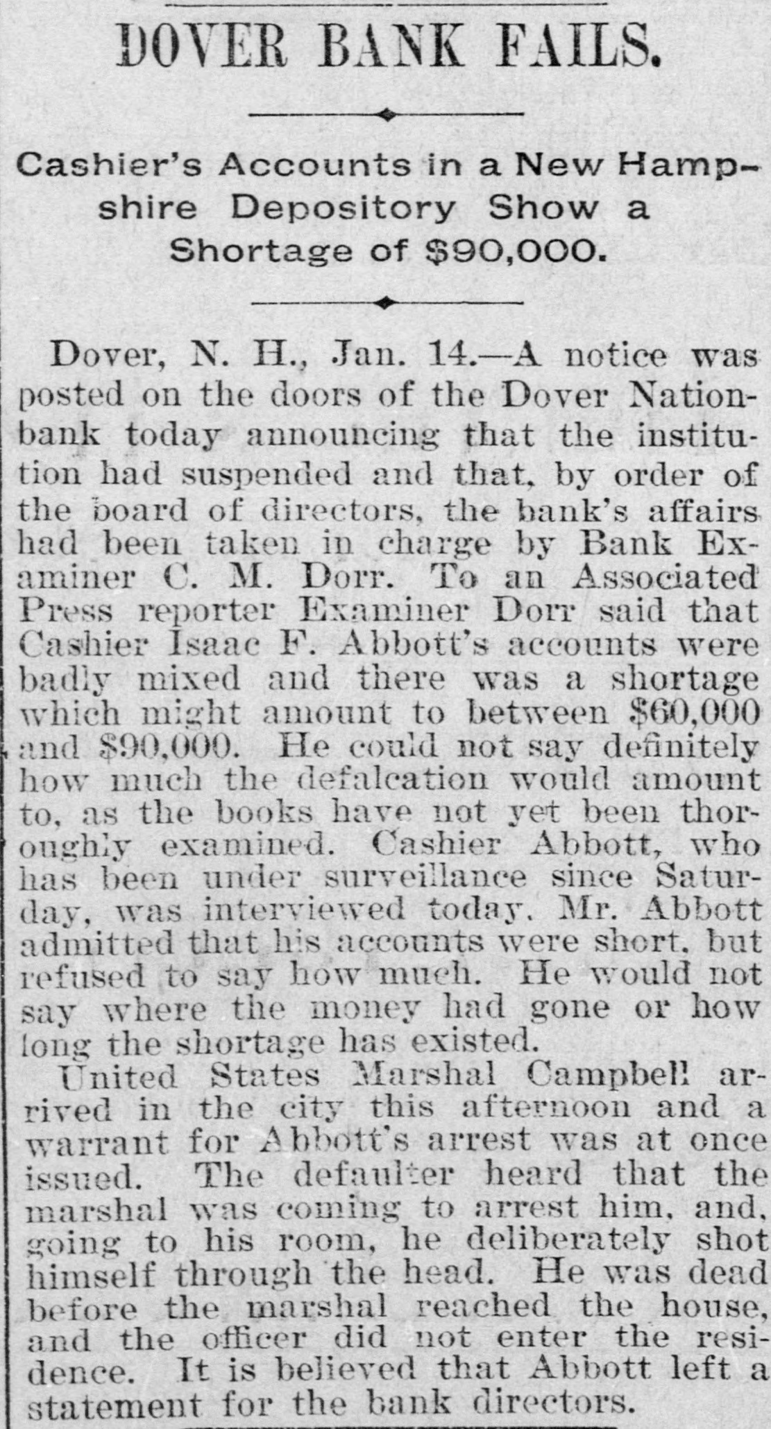Cashier Dover National Bank Discovered to be a Defaulter-It is Believed He Left a Statement for the Bank Examiner. Dover, N. H., January 14.-Isaac F. Abbott, cashier of the Dover National "bank, is a defaulter, and the amount of the defalcation is estimated to be about $80,000. The discovery of the defalcation was made by Bank Examiner Dorr of Somersworth, who began an examination of the bank last Friday. He asked Mr. Abbott certain questions which the cashier said he would explain next morning. When the examiner came again Saturday morning, it was found that the safe could not be opened, and Mr. Abbott failed to appear. He was at home and stated that he would explain all Monday. The failure of the cashier to say anything was brought to the attention of the bank officials, and Examiner Dorr at once declared Abbott a defaulter. District Attorney A. A. Branch of Manchester, and United States Marshall Campbell were at once telegraphed for to place Abbott under arrest, but could not connect to arrive until today. = Abbott remained at home all day and Chief of Police Fogerty detailed officers to guard the house. To a New England Associated Press representative Mr.Abbott said he should make no attempt to escape. He said"the object of setting the time lock ahead was to give him time to notify his sons and daughters before they saw the newspaper account. He stated that the vault would open this morning at 9.o'clock. =When the vault was unlocked Bank Examiner Doir posted a notice that the bank had suspended business until its affairs could be'straightened out. Intense excitement `prevails, as Mr. Abbott was a respected citizen and was also cashier of the Five-Cent Savings bank and was city treasurer. The depositors will lose nothing but their money'is tied up. State Bank Commissioners Lyford and Hatch arrived today and took charge of the savings bank. They make the statement that the bank is all right. Mr. Abbott's bond was issued for $20,000 by the North American Guarantee. At three this afternoon, just before United States Marshal Camubell arrived at the house of Isaac F. Abbott. the defaulting cashier of the Dover National bank,a orother of Abbott's heard a report ofa pistol,and rushing to the cashier's room found him lying on the floor with his face shattered and covered with blood. Life was extinct. It is believed that the dead cashier has left a.detailed statement for Examiner Dorr.