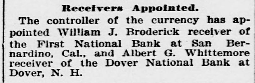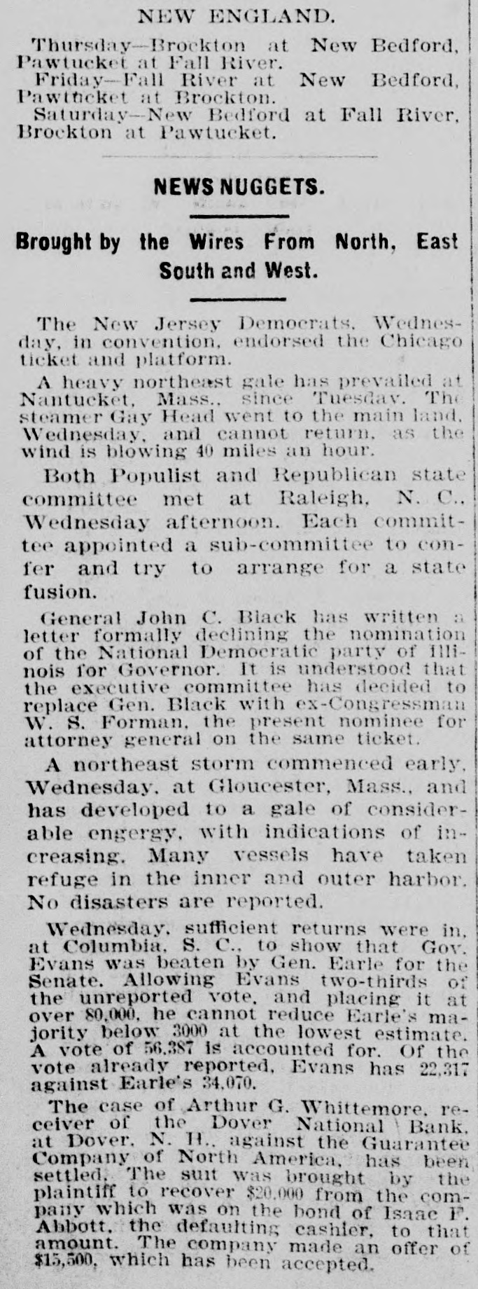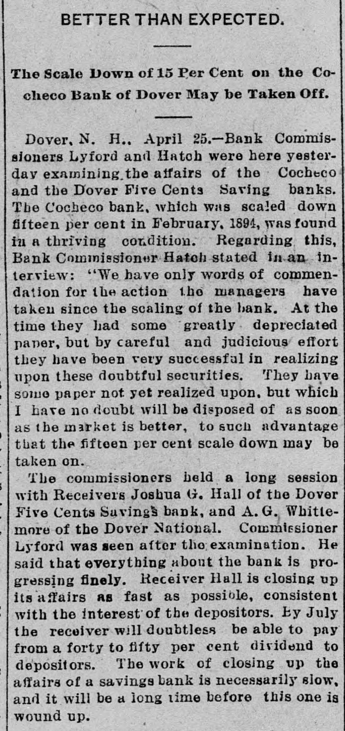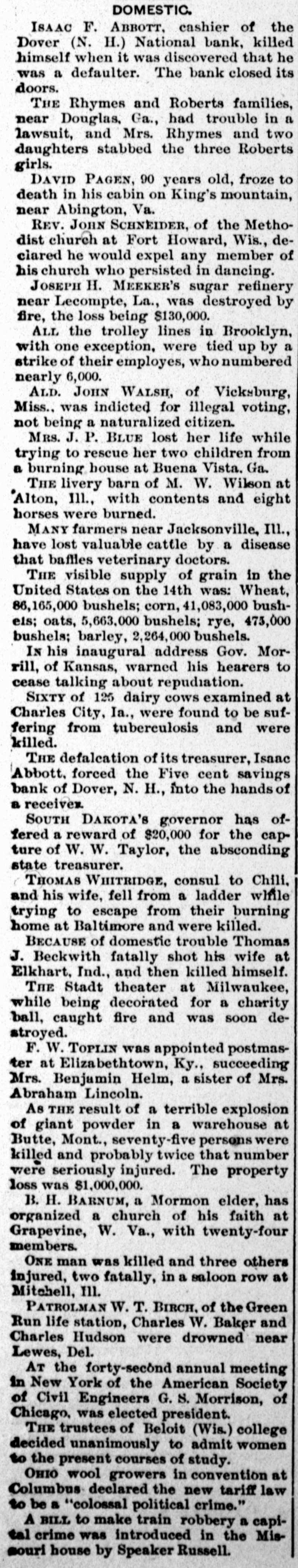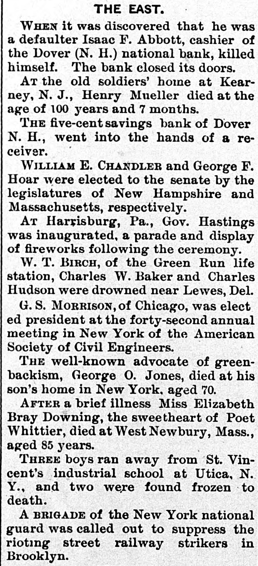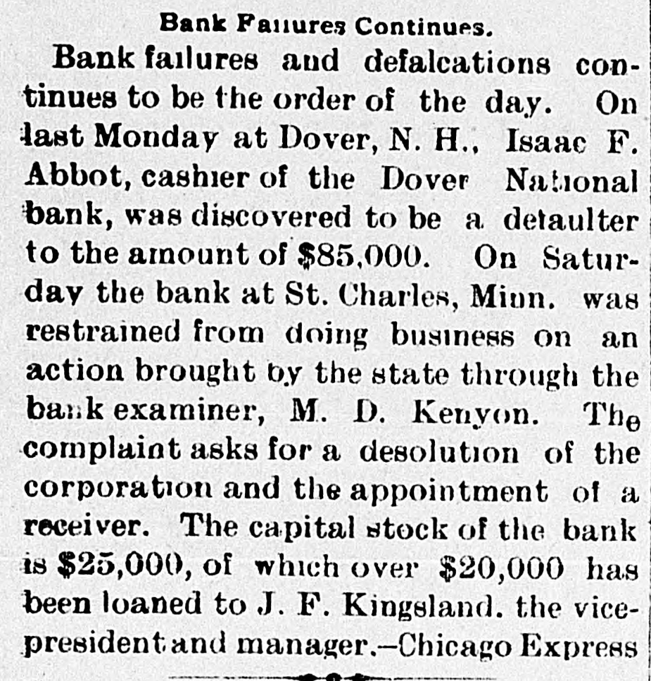 Cashier Dover National Bank Discovered to be a Defaulter-It is Believed He Left a Statement for the Bank Examiner. Dover, N. H., January 14.-Isaac F. Abbott, cashier of the Dover National "bank, is a defaulter, and the amount of the defalcation is estimated to be about $80,000. The discovery of the defalcation was made by Bank Examiner Dorr of Somersworth, who began an examination of the bank last Friday. He asked Mr. Abbott certain questions which the cashier said he would explain next morning. When the examiner came again Saturday morning, it was found that the safe could not be opened, and Mr. Abbott failed to appear. He was at home and stated that he would explain all Monday. The failure of the cashier to say anything was brought to the attention of the bank officials, and Examiner Dorr at once declared Abbott a defaulter. District Attorney A. A. Branch of Manchester, and United States Marshall Campbell were at once telegraphed for to place Abbott under arrest, but could not connect to arrive until today. = Abbott remained at home all day and Chief of Police Fogerty detailed officers to guard the house. To a New England Associated Press representative Mr.Abbott said he should make no attempt to escape. He said"the object of setting the time lock ahead was to give him time to notify his sons and daughters before they saw the newspaper account. He stated that the vault would open this morning at 9.o'clock. =When the vault was unlocked Bank Examiner Doir posted a notice that the bank had suspended business until its affairs could be'straightened out. Intense excitement `prevails, as Mr. Abbott was a respected citizen and was also cashier of the Five-Cent Savings bank and was city treasurer. The depositors will lose nothing but their money'is tied up. State Bank Commissioners Lyford and Hatch arrived today and took charge of the savings bank. They make the statement that the bank is all right. Mr. Abbott's bond was issued for $20,000 by the North American Guarantee. At three this afternoon, just before United States Marshal Camubell arrived at the house of Isaac F. Abbott. the defaulting cashier of the Dover National bank,a orother of Abbott's heard a report ofa pistol,and rushing to the cashier's room found him lying on the floor with his face shattered and covered with blood. Life was extinct. It is believed that the dead cashier has left a.detailed statement for Examiner Dorr.
