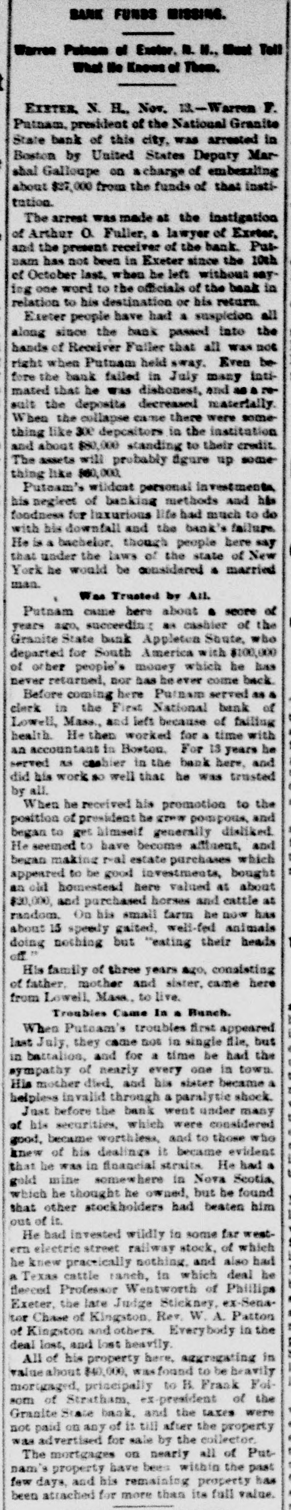 BANK FUNDS MISSING. Warree Patness of Enster. a. N., Meet Tell What No Knows of Them. EXETER N. H. Nov. M-Warren F. Patnam. president of the National Granite State bank of this city, was arrested in Boston by United States Deputy Mar shal Galloupe on acharge of embeaaling about $37,000 from the funds of that institation. The arrest was made at the instigation of Arthur a Fuller, a lawyer of Exeter, and the present receiver of the bank. PutBAM has not been in Exeter since the 10th of October last, when be left without saying one word to the officials of the beak in relation to his destination or his return. Exeter people have had a suspicion all along since the back passed into the hands of Receiver Fuller that all was not right when Putusm held away. Even be fore the bank failed in July many intimated that he was dishonest, and ware suit the deposits decreased materially When the collapse came there were something like 300 depositors in the institution and about $80,000 standing to their credit The assets will probably figure up some thing like 860,000. Puteam's wildcat personal investments his neglect of banking methods and his foodness for luxurious life had much to do with his downfall and the bank's failure He is a bachelor. though people here say that under the laws of the state of New York he would be considered . married man. Was Trusted by AIL Putnam came here about . score of years ago, succeeding as cashier of the Granite State bank Appleten State, who departed for South America with $100,000 of other people's money which he has never returned, nor has heaver come back Before coming here Purname served as clerk in the First National bank of Lowell, Mass., and left because of failing health He then worked for a time with an accountant in Boston. For 13 years he served as cashier in the bank here. and did his work so well that he was trusted by all. When he received his promotion to the position of president be grew pompous, and began to get himself generally disliked He seemed to have become affilient, and began making r-al estate purchases which appeared to be good investments, bought an old homestead here valued at about $20,000, and purchased horses and cattle at random. On his small farm be now has about 15 speedy gaited, well-fed animals doing nothing but "eating their heads off His family of three years ago, conalsting of father. mother and sister, came here from Lewell, Mass. to live. Troubles Came In . Bunch. When Putsam's troubles first appeared last July, they came not in single file, but in battalies, and for a time be had the sympathy of nearly every one in town. His mother died, and his sister became helpless invalid through a paralytie shock. Just before the bank went under many of his securities, which were considered good, became worthless, and to those who knew of his dealings it became evident that be was in financial straits He had . gold mine somewhere in Nova Scotia, which he thought he owned, but be found that other stockholders had beaten him out of it. He bad invested wildly to some far westera electric street railway stock, of which he knew practically nothing. and also had a Texas cattle ranch, in which deal he fleeced Professor Westworth of Phillips Exeter, the late Judge Stickney, x-Senater Chase of Kingston, Rev. W. A. Patton of Kingston and others. Everybody in the deal lost, and lost heavily All of his property here, aggregating in value about $40,000, wasfound to be bravily mortgaged, principally to B. Frank Folsom of Stratham, president of the Granite State bank. and the taxes were not paid on any of is till after the property was advertised for sale by the collector. The mortgages on nearly all of Putnam's property have bees within the past few days, and his remaining property has been attached for more than its full value.